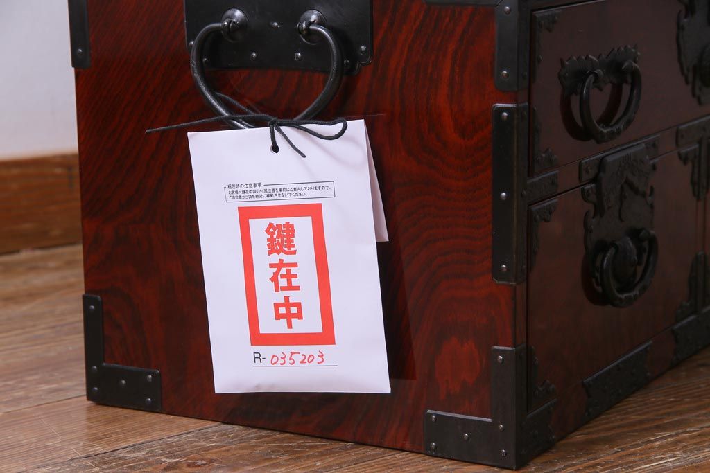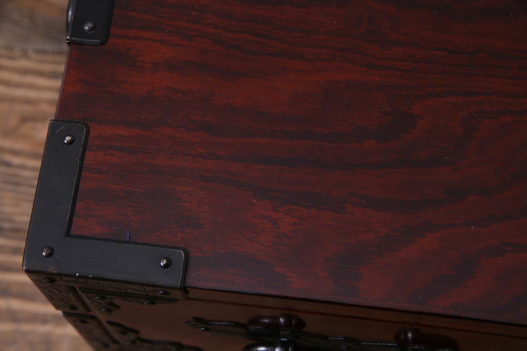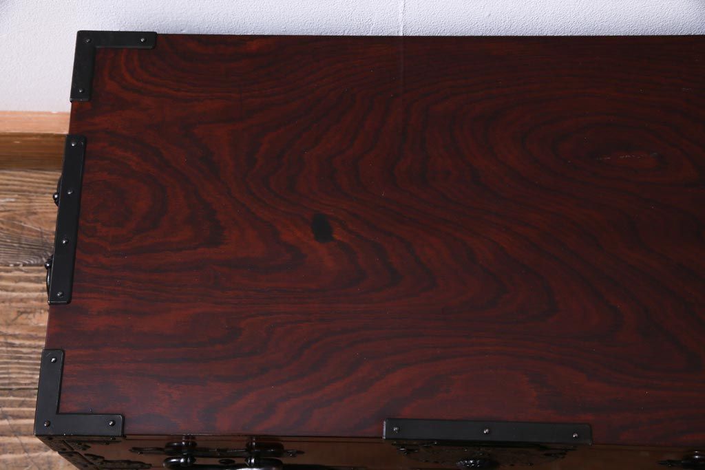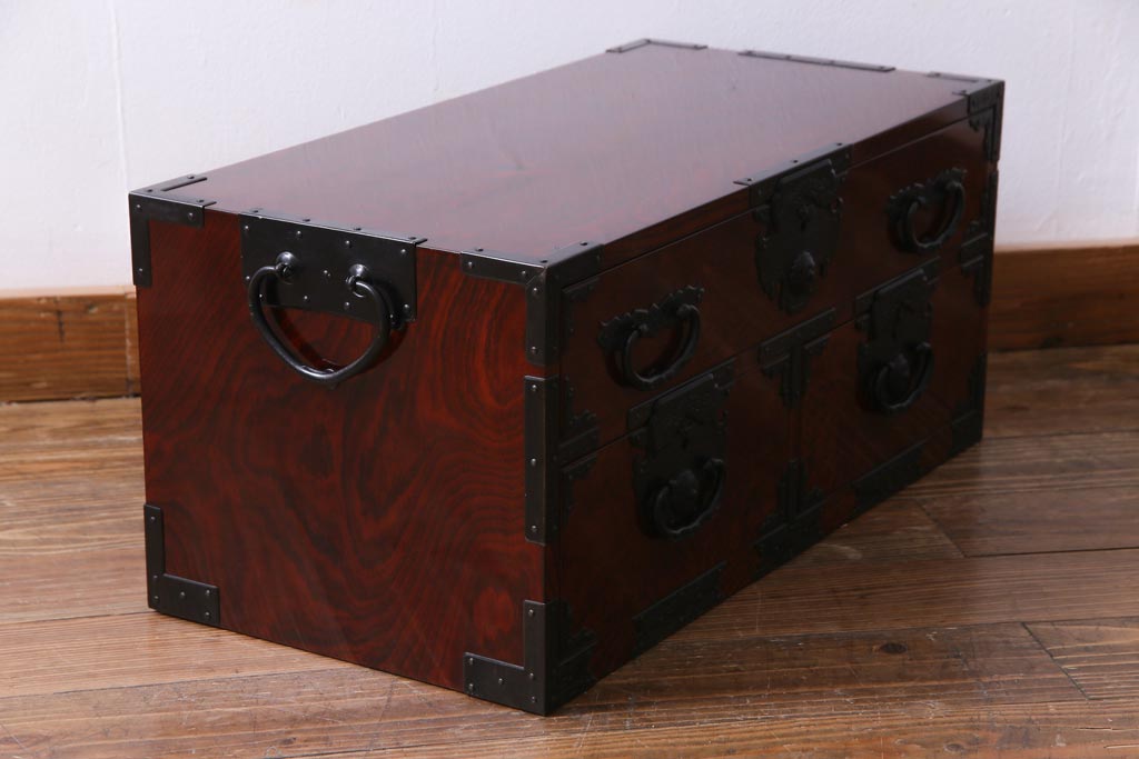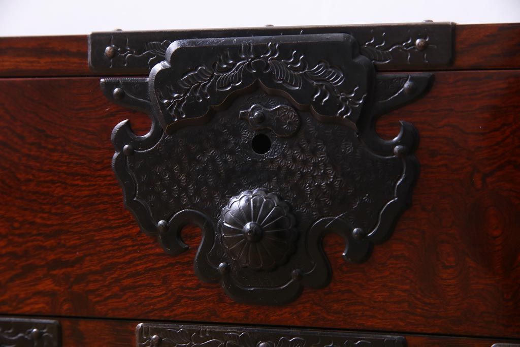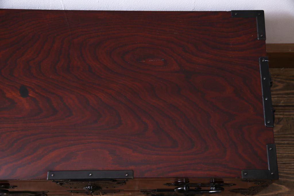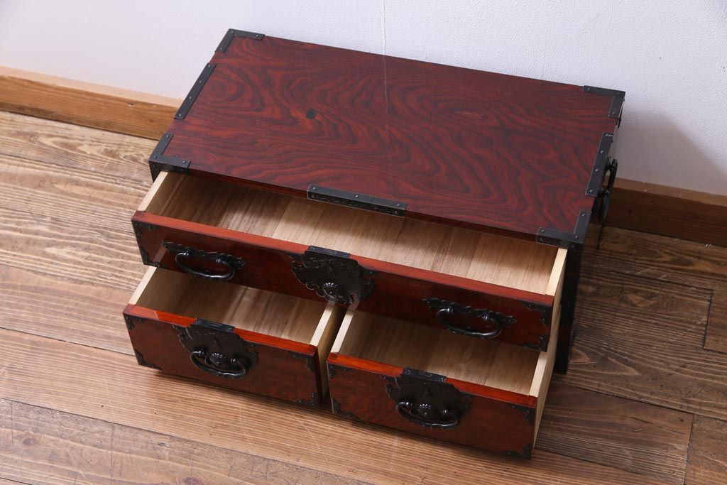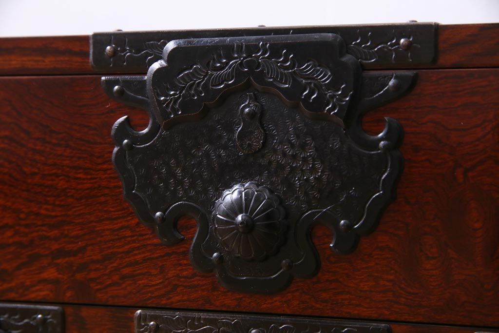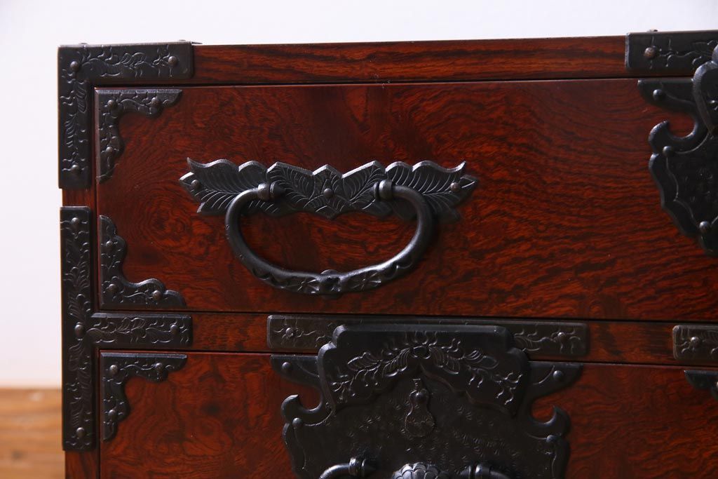 中古 仙台箪笥 熊野洞 ケヤキ材 玉杢 繊細かつ迫力溢れる金具が魅力の整理箪笥(ローボード)