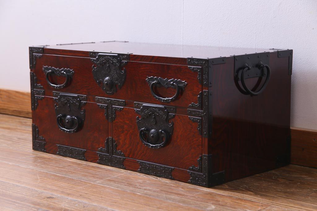 中古 仙台箪笥 熊野洞 ケヤキ材 玉杢 繊細かつ迫力溢れる金具が魅力の整理箪笥(ローボード)です。