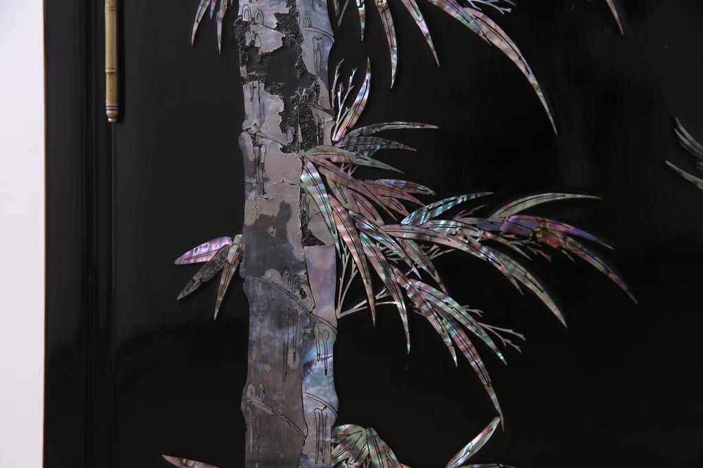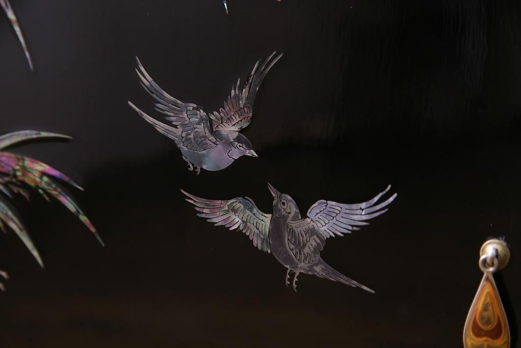 一本の竹と二羽の小鳥が細かに螺鈿で描かれた