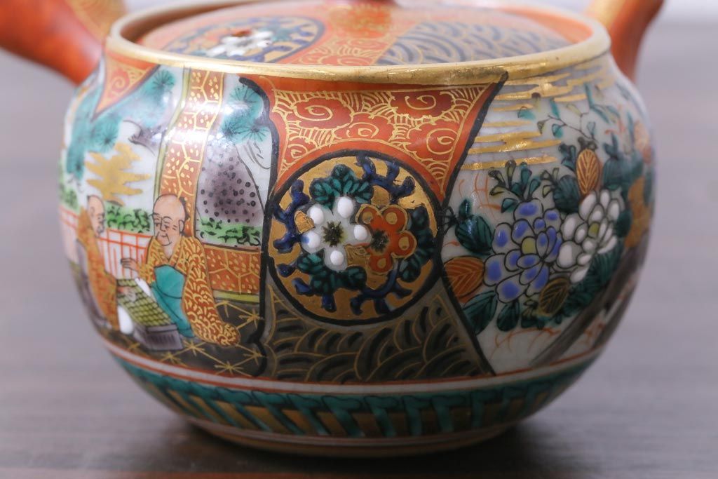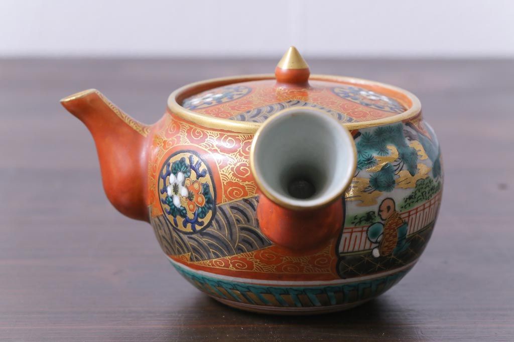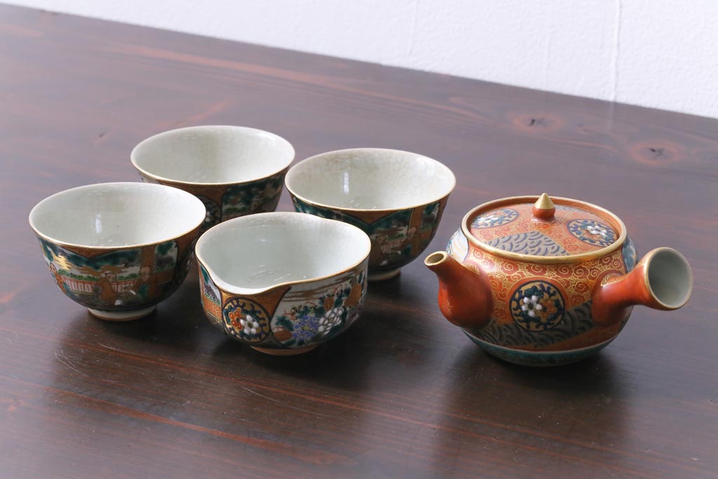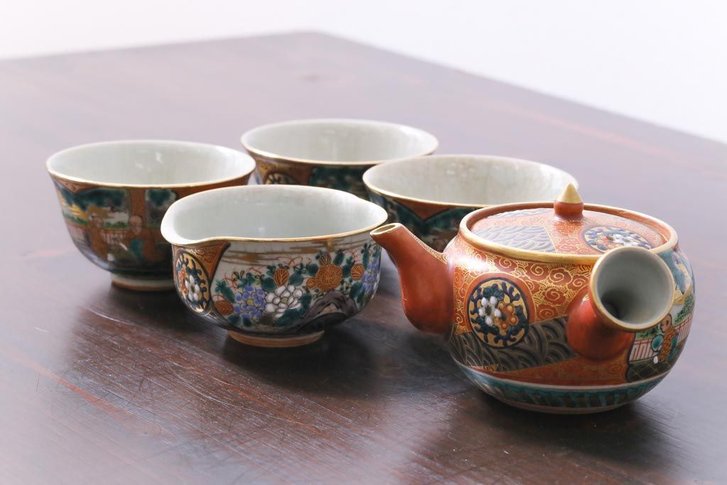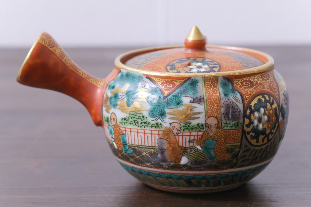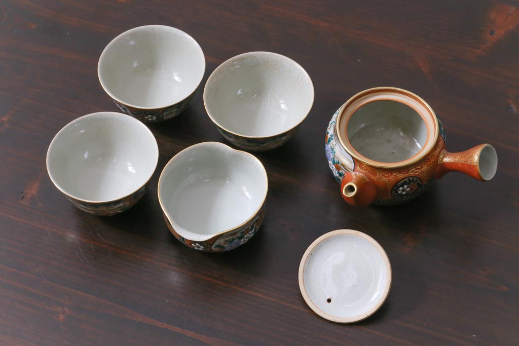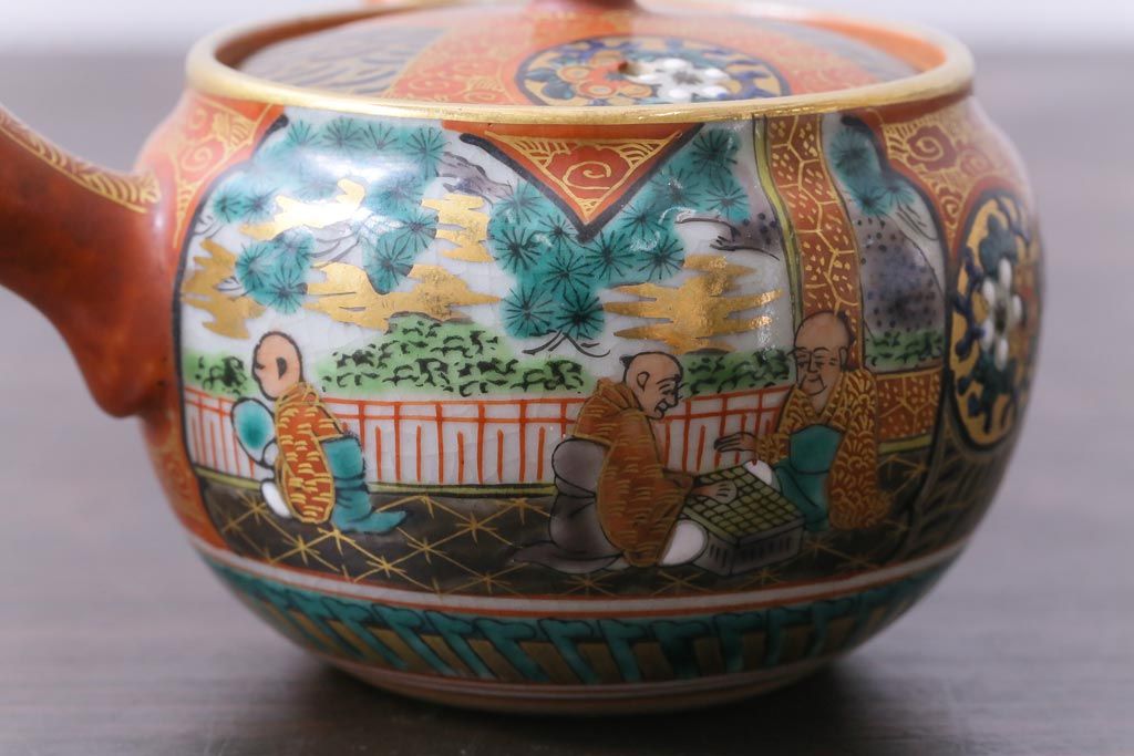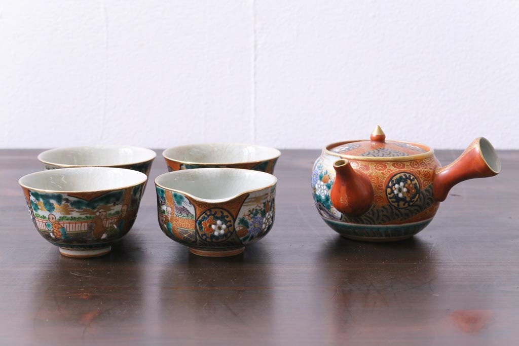 和製アンティーク 九谷焼 九谷庄三 色絵 牡丹と僧侶 茶器セット(急須、湯冷まし、湯呑み)