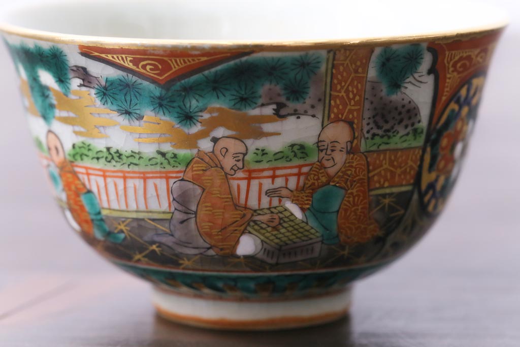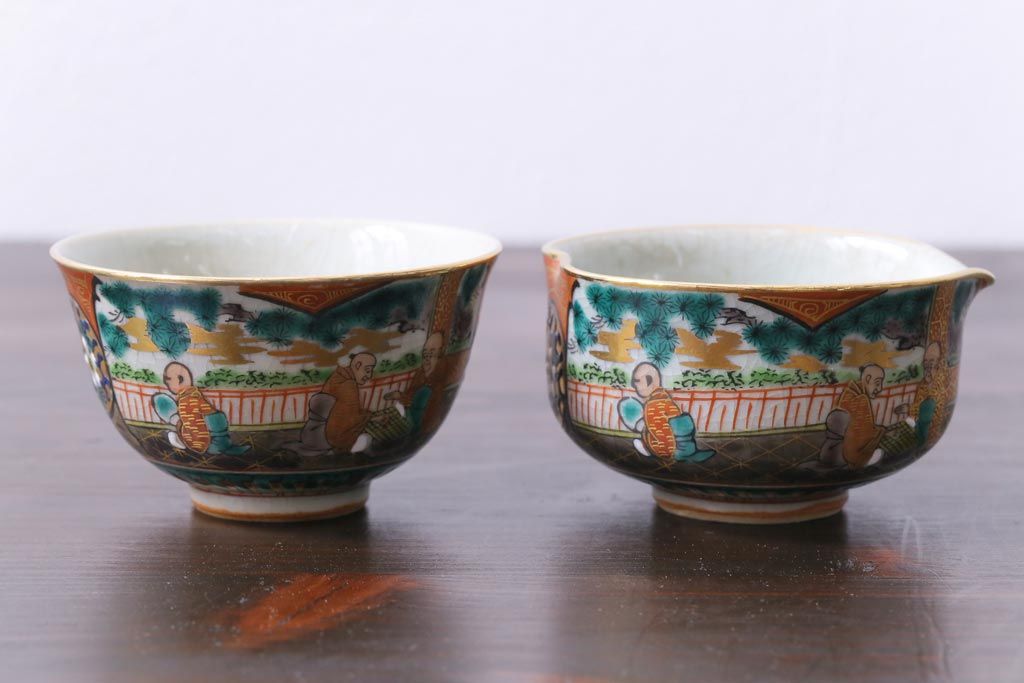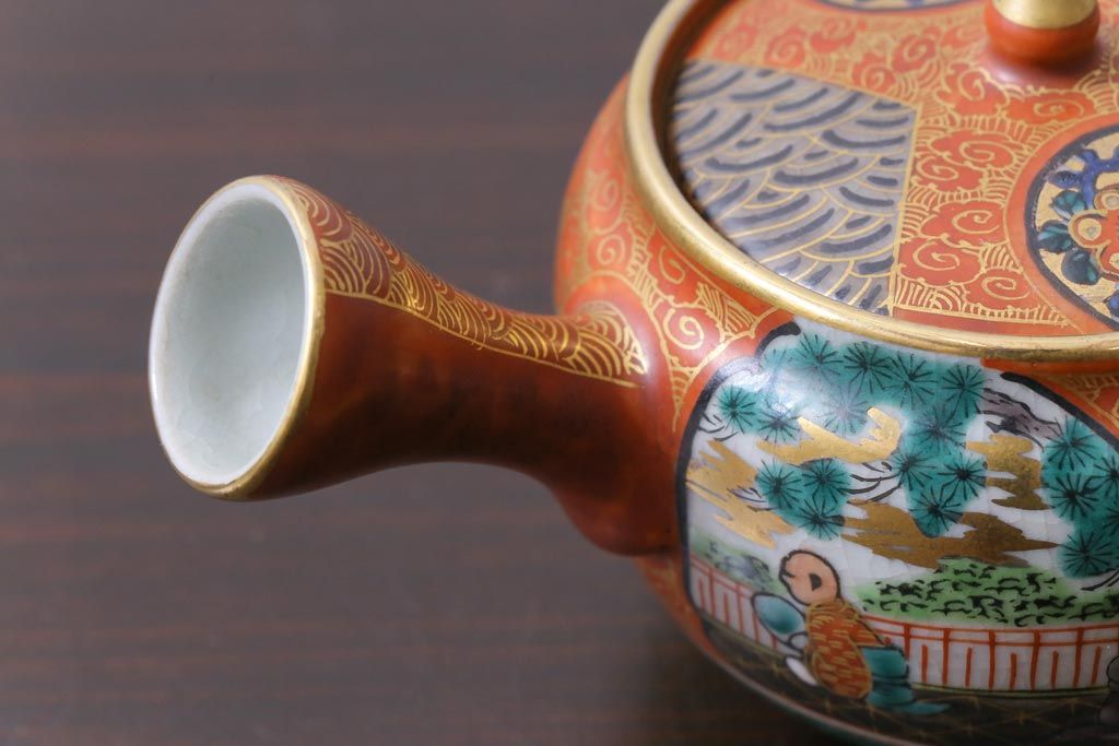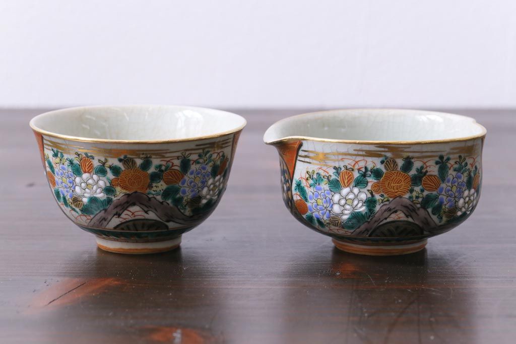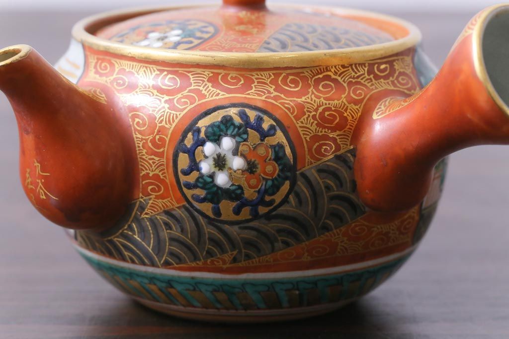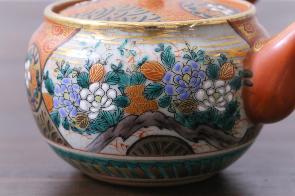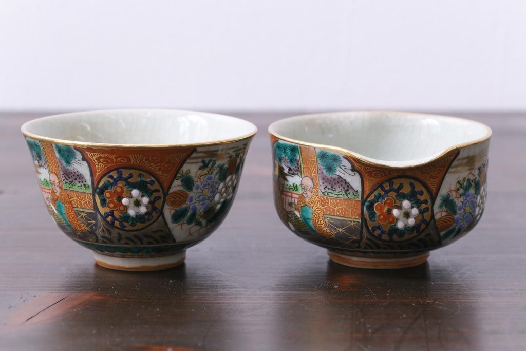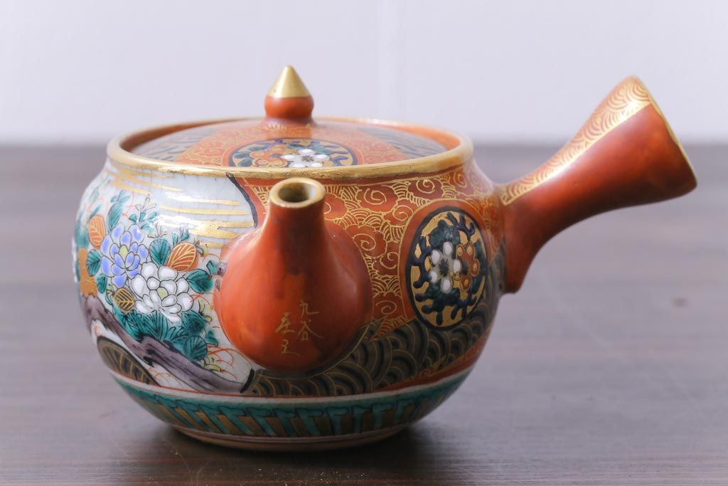 和製アンティーク 九谷焼 九谷庄三 色絵 牡丹と僧侶 茶器セット(急須、湯冷まし、湯呑み)