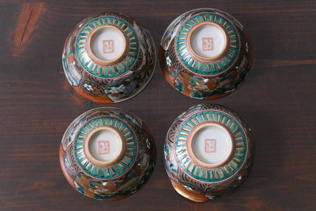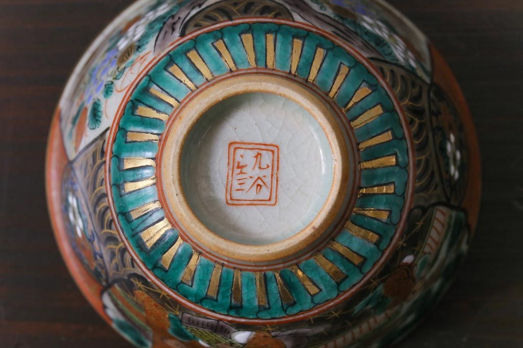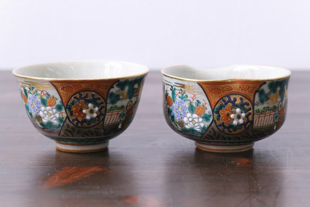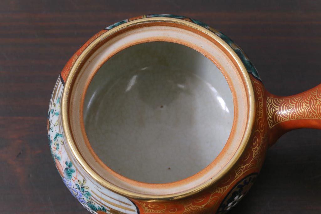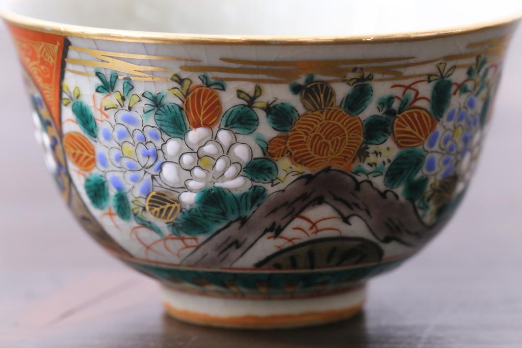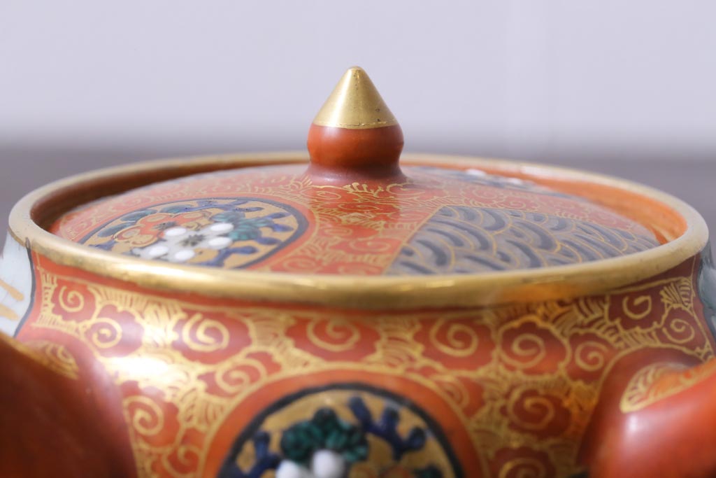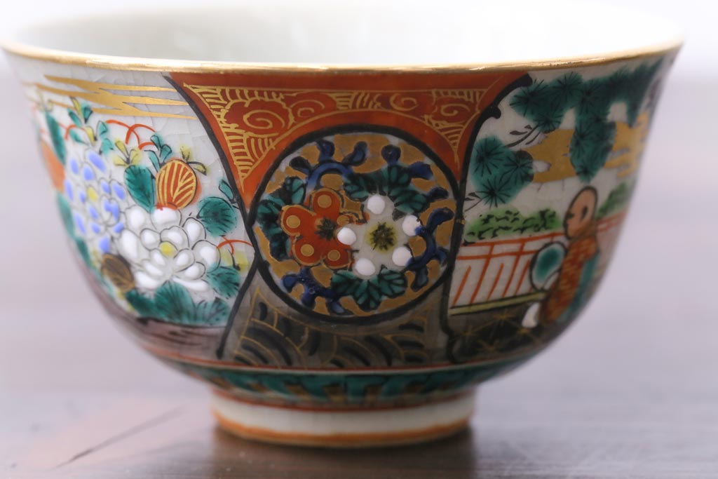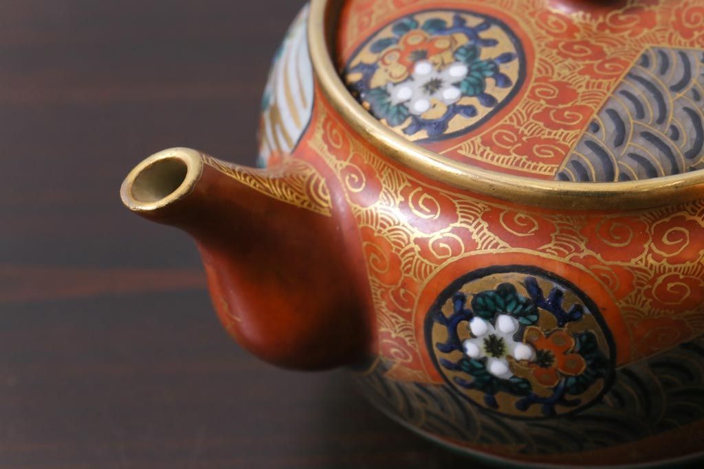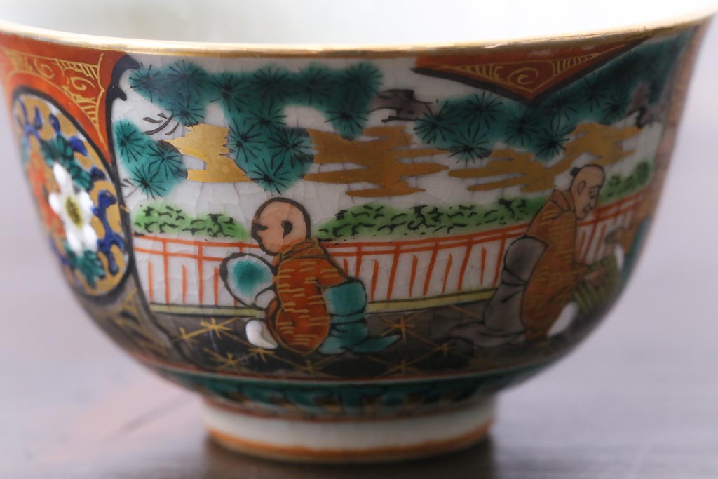 和製アンティーク 九谷焼 九谷庄三 色絵 牡丹と僧侶 茶器セット(急須、湯冷まし、湯呑み)