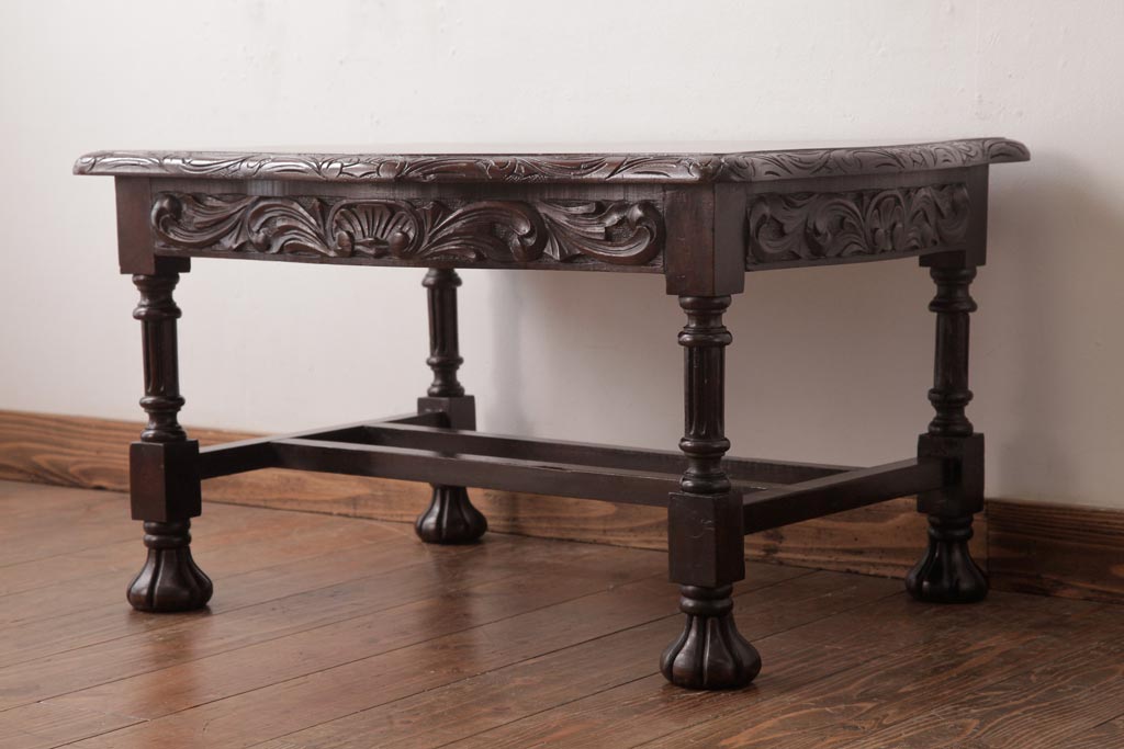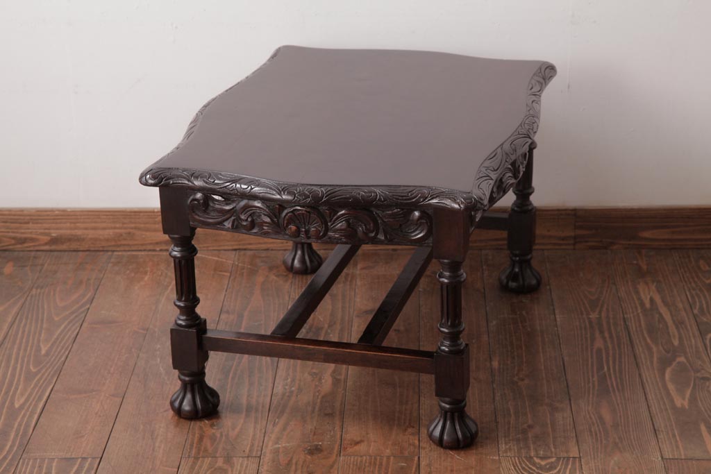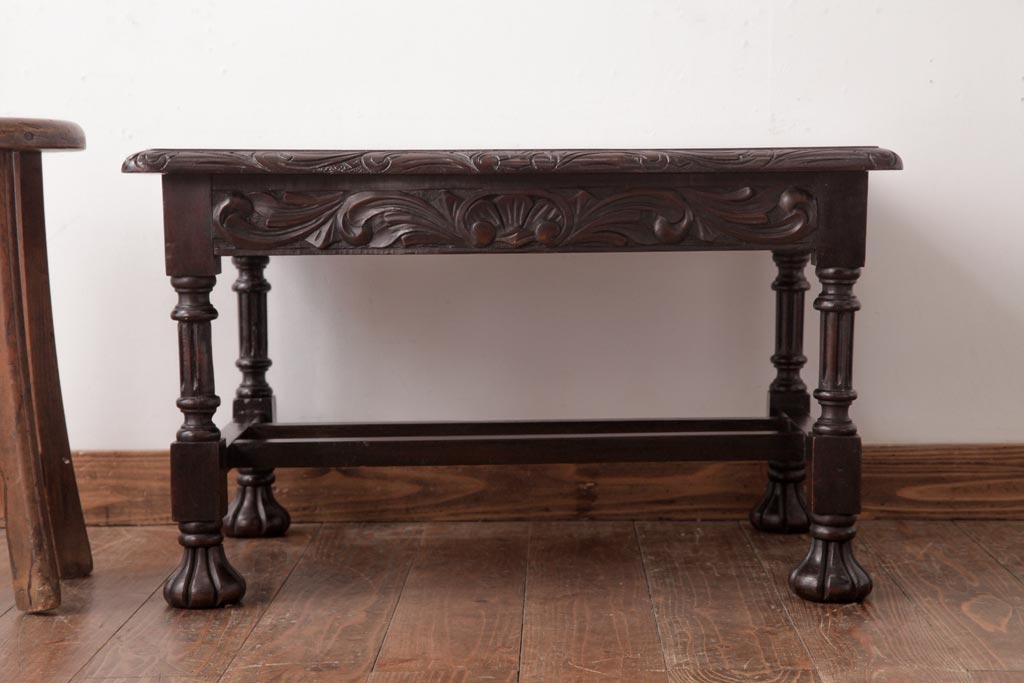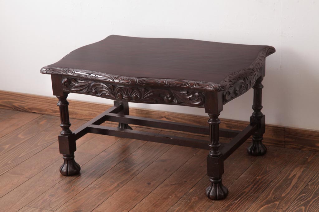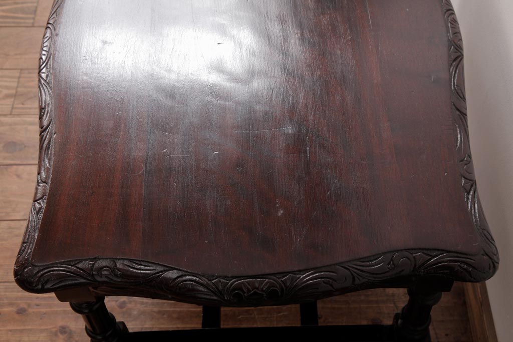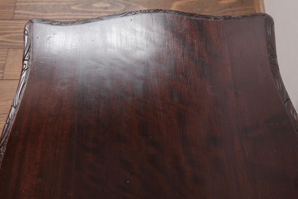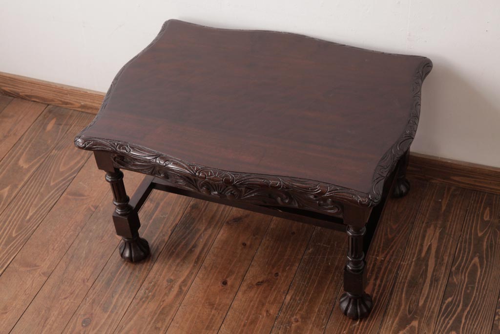 アンティーク家具 イギリスアンティーク マホガニー材 レリーフなどの凝った意匠が目を引くセンターテーブル(ローテーブル)