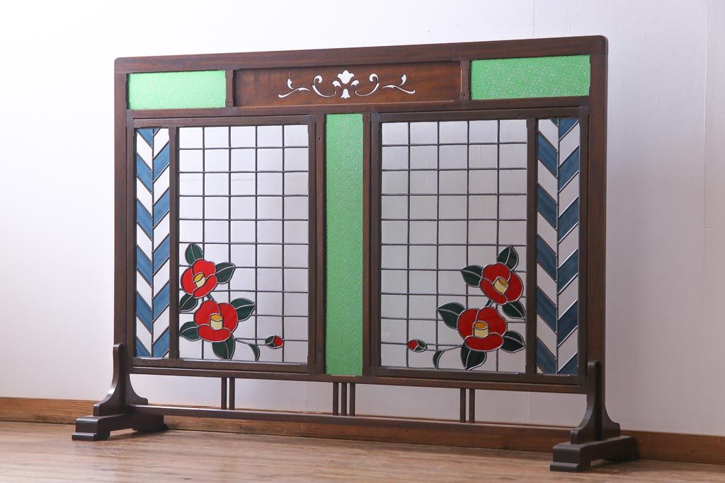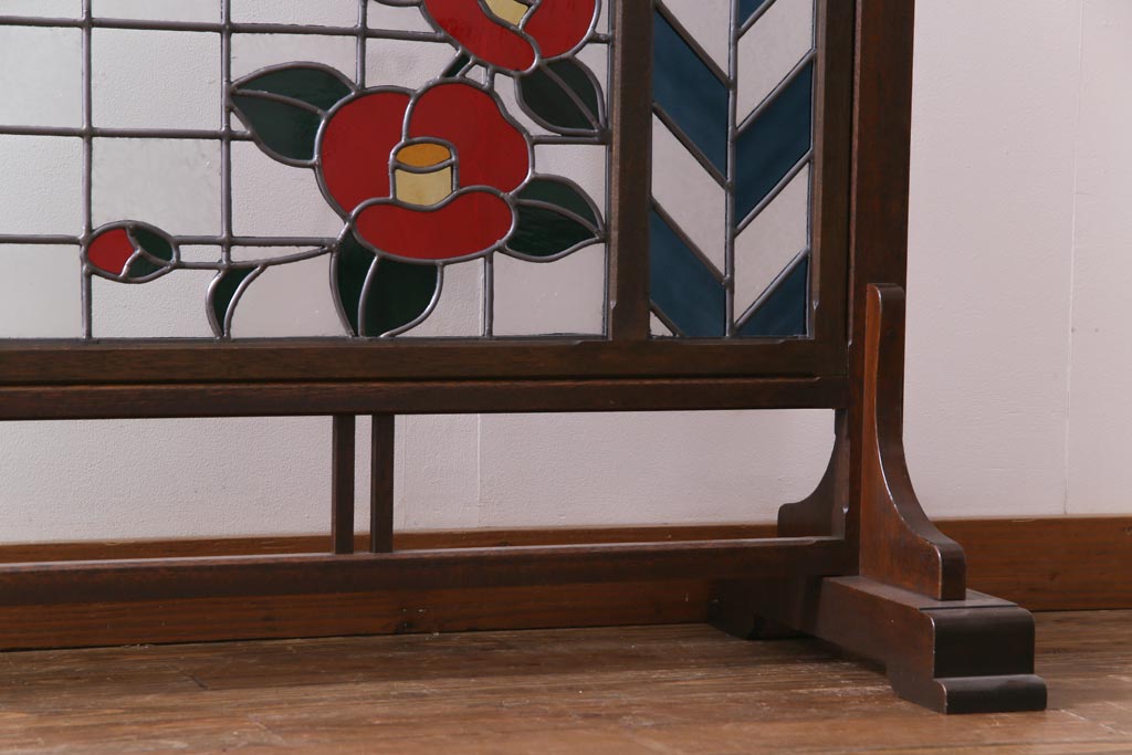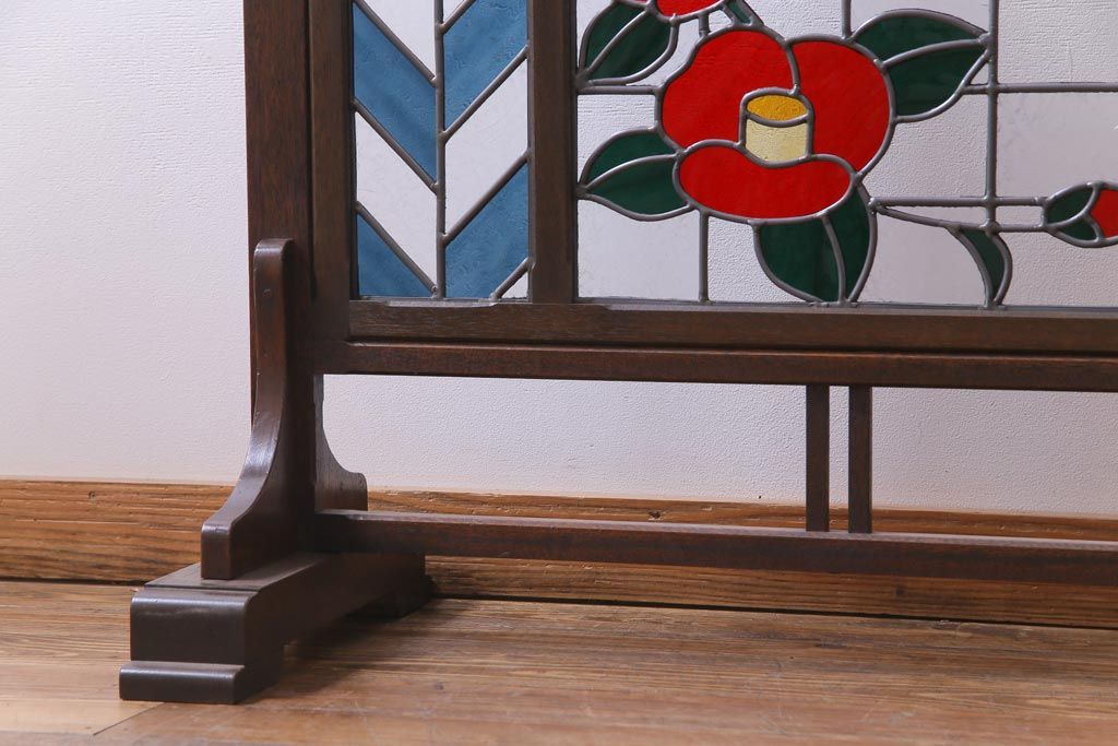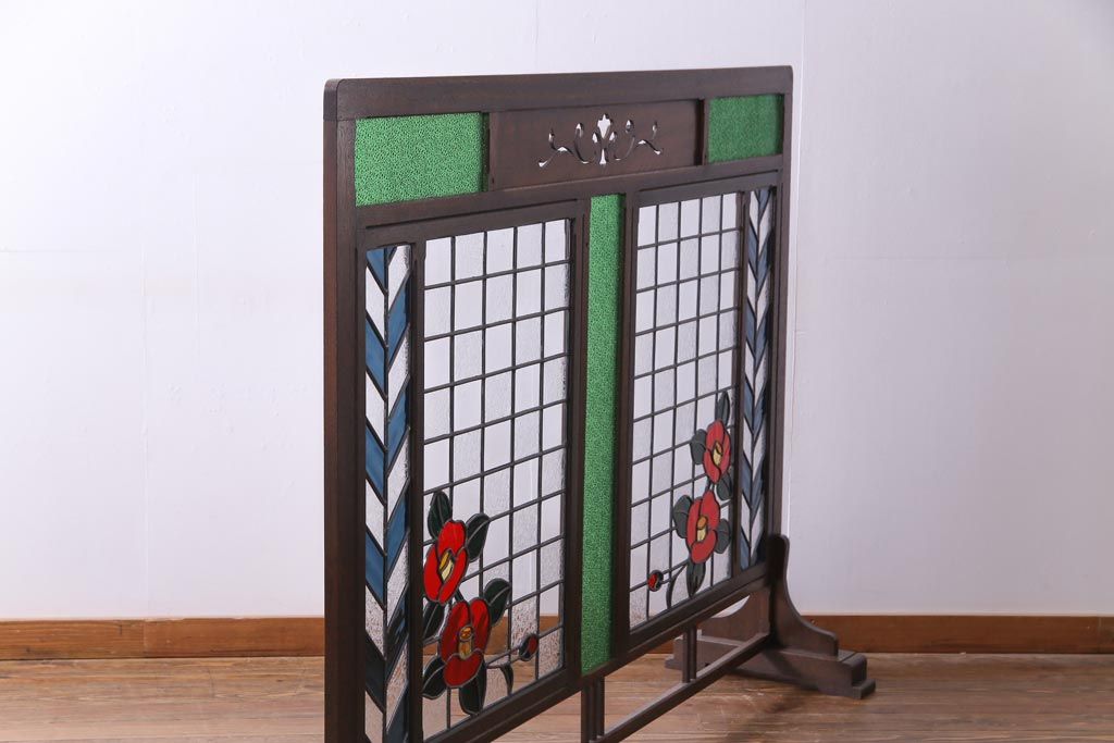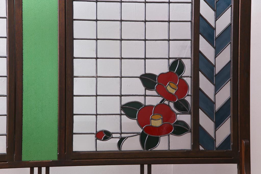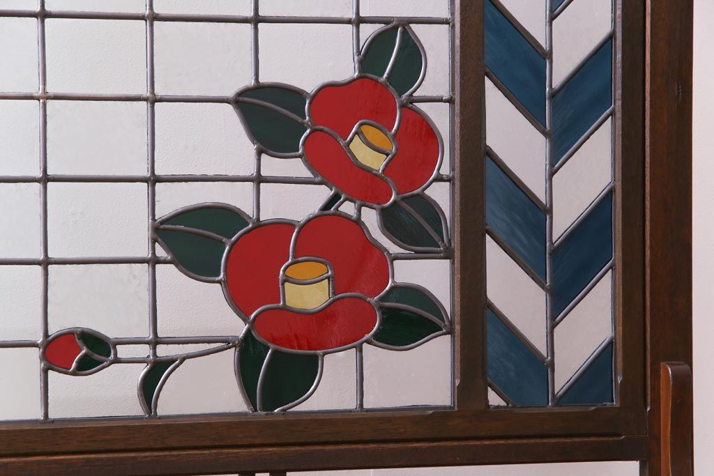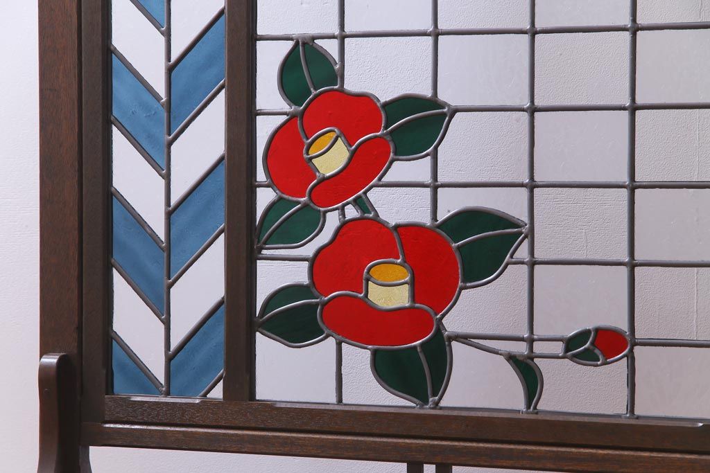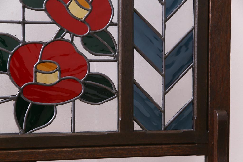 アンティーク雑貨 ラフジュ工房オリジナルステンドグラス 昭和初期 当時もの色ガラス ステンドグラス 椿の図がおしゃれな衝立(パーテーション、つい立て、仕切り)