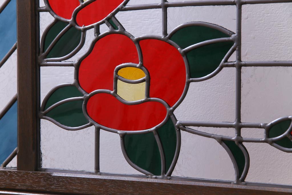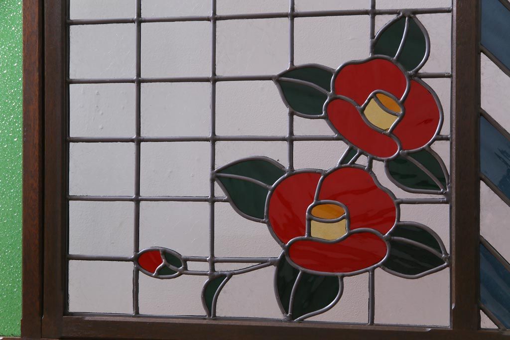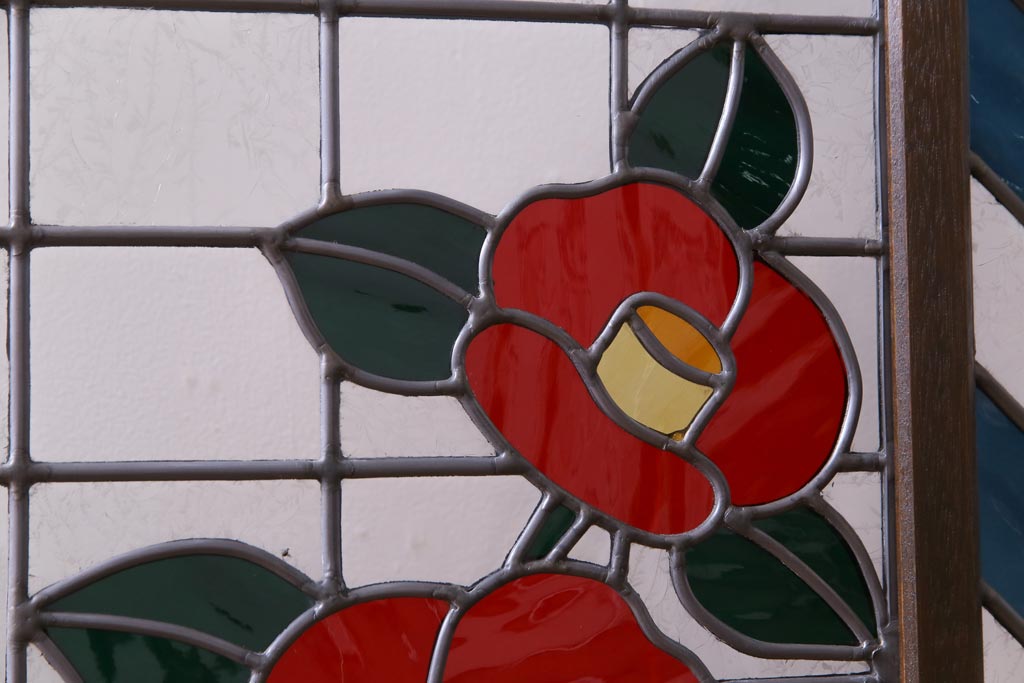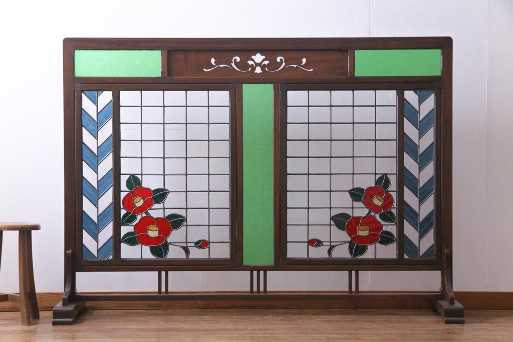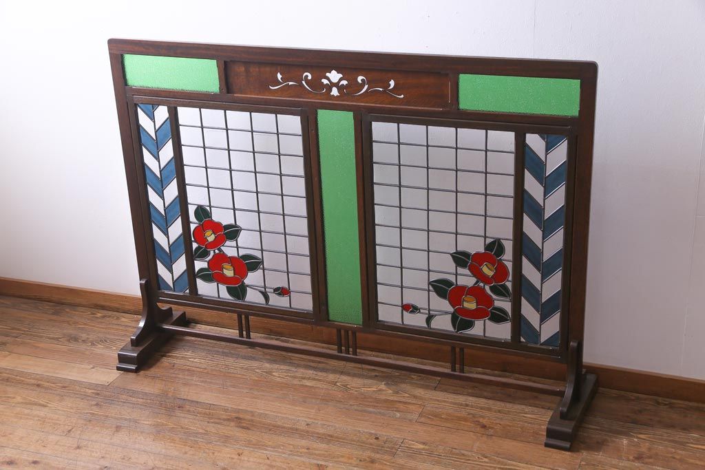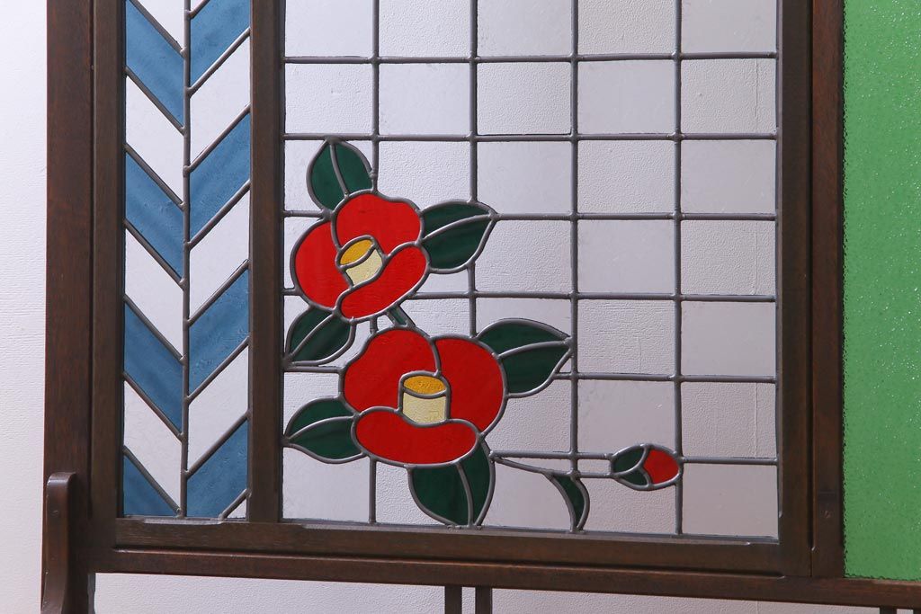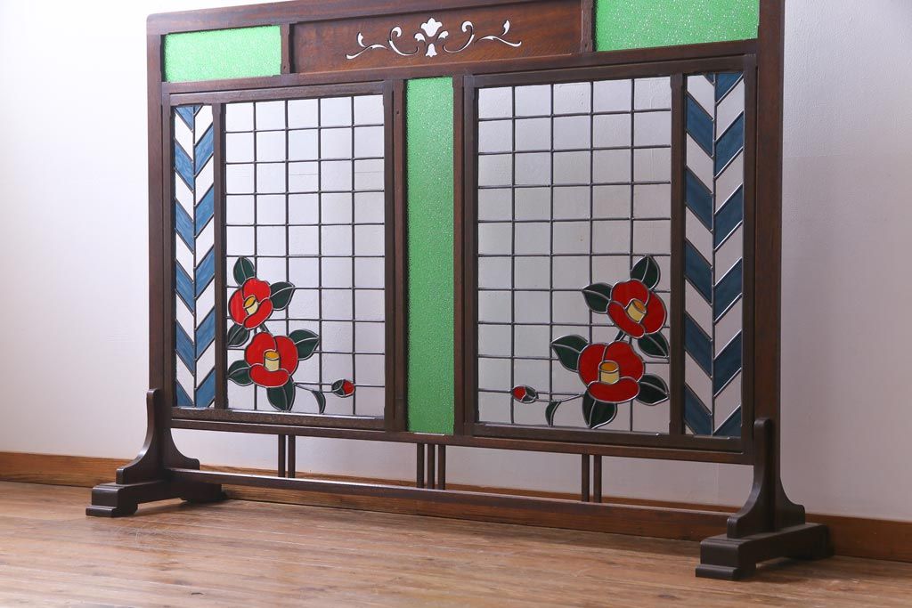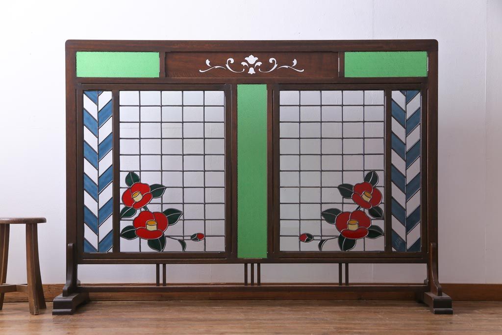 アンティーク雑貨 ラフジュ工房オリジナルステンドグラス 昭和初期 当時もの色ガラス ステンドグラス 椿の図がおしゃれな衝立(パーテーション、つい立て、仕切り)