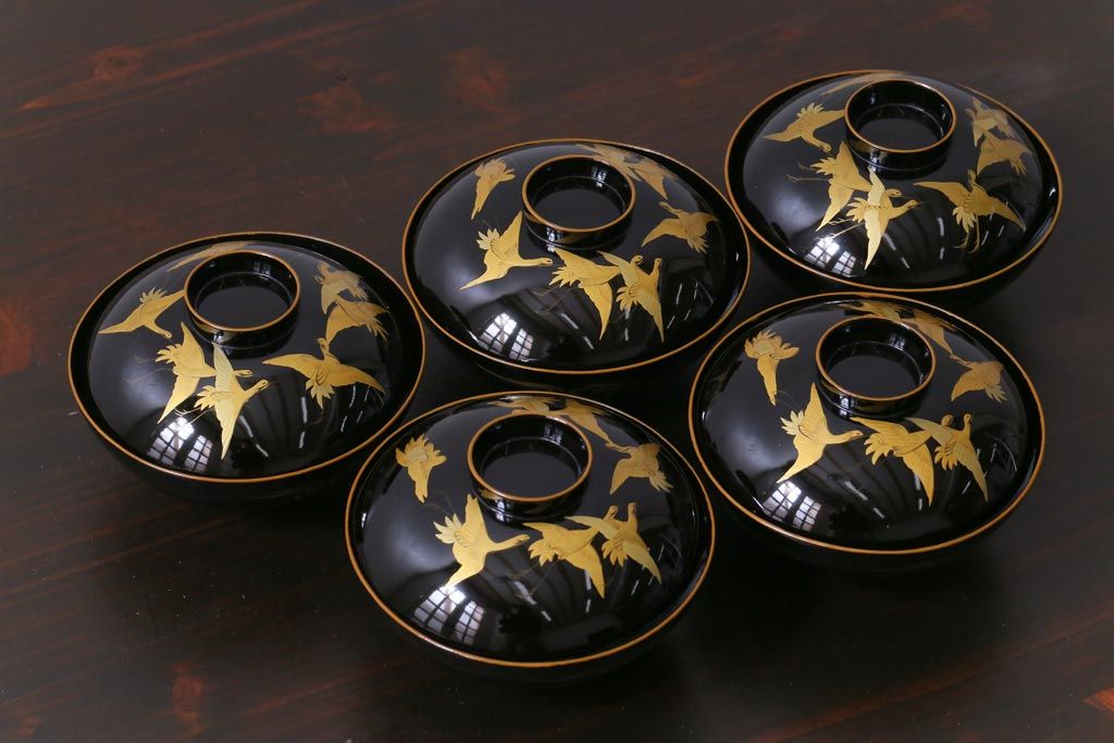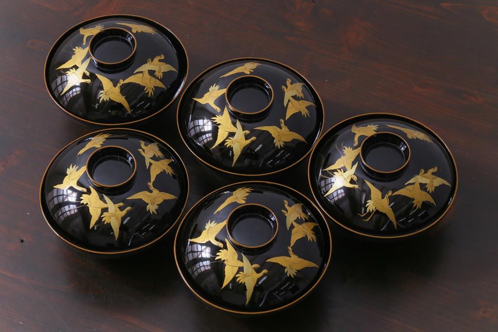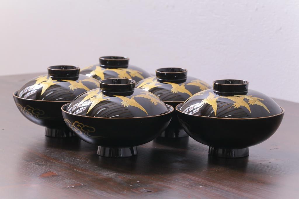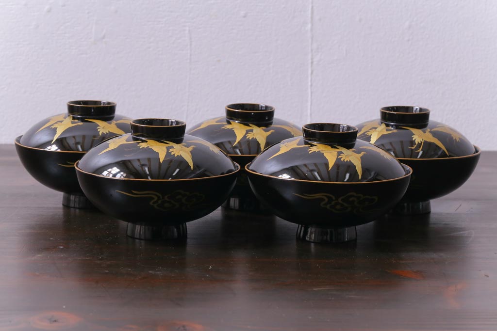 ラフジュ工房> 和食器・茶道具> お椀・茶碗 > 和製アンティーク 鶴・亀図柄 黒漆に金彩蒔絵が映える木製お椀5客セット(漆器)