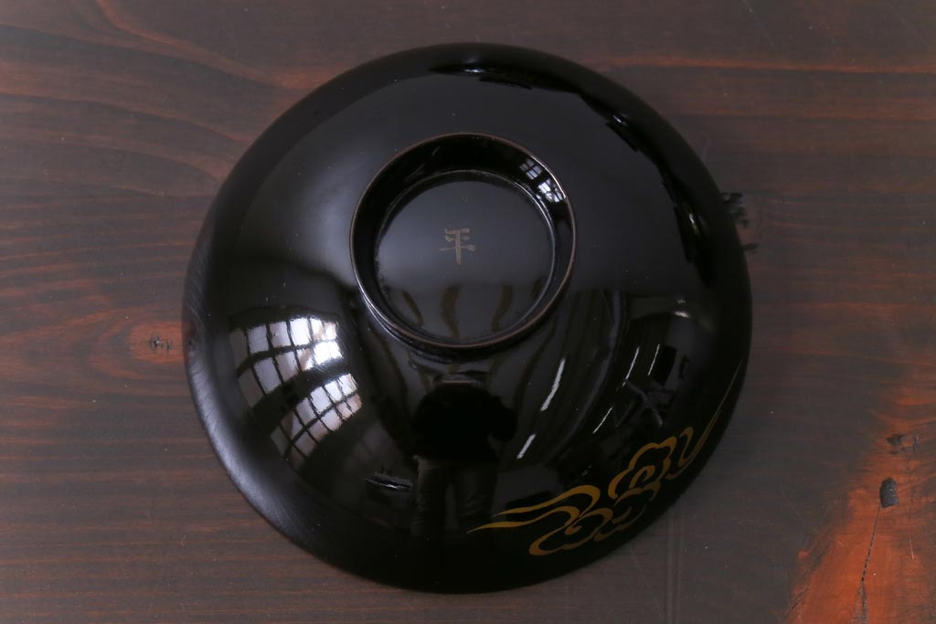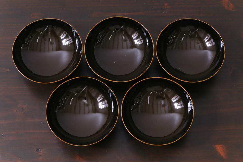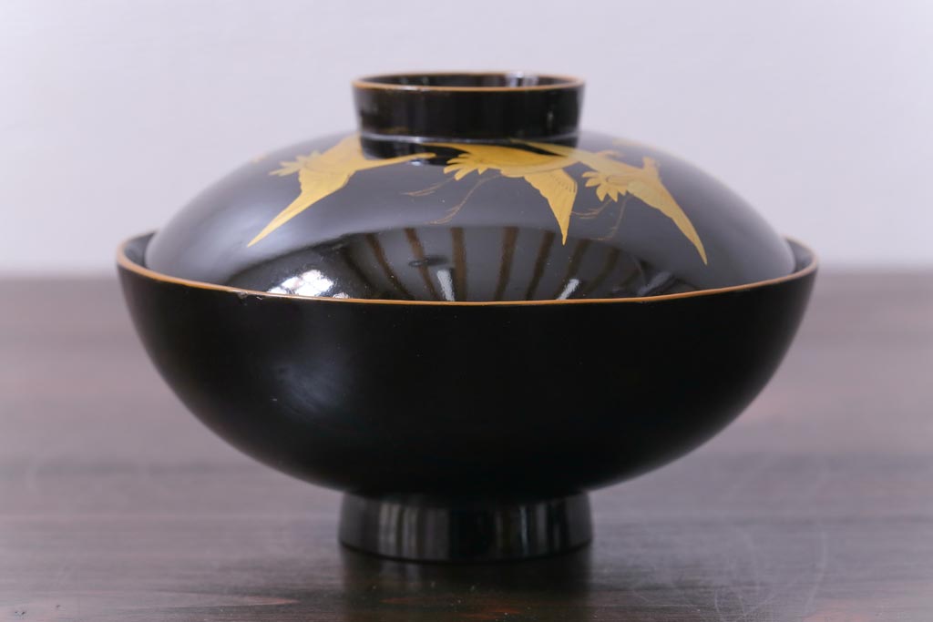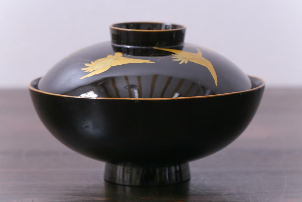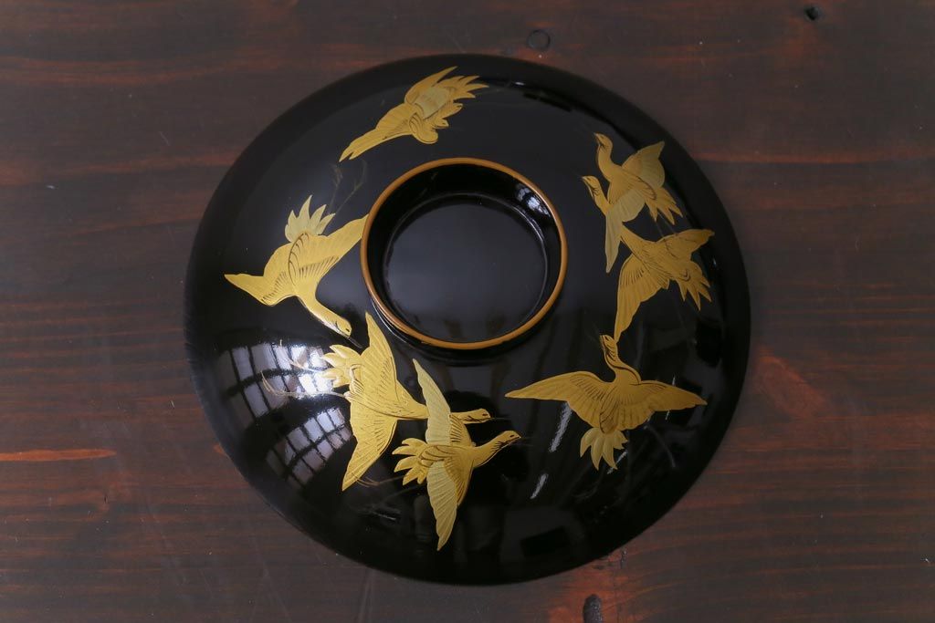 ラフジュ工房> 和食器・茶道具> お椀・茶碗 > 和製アンティーク 鶴・亀図柄 黒漆に金彩蒔絵が映える木製お椀5客セット(漆器)