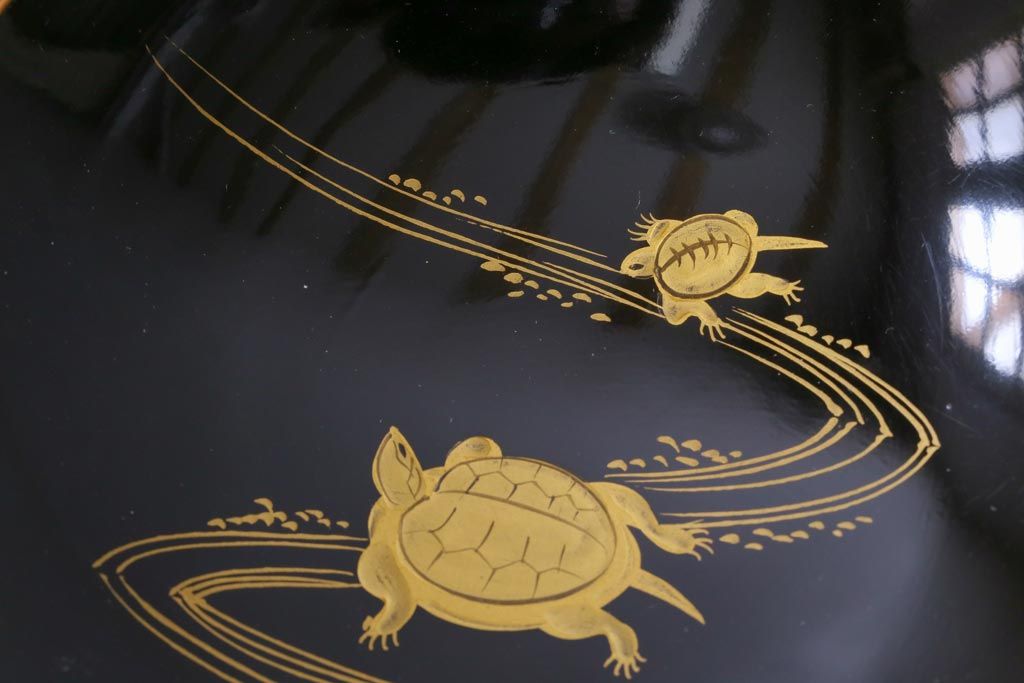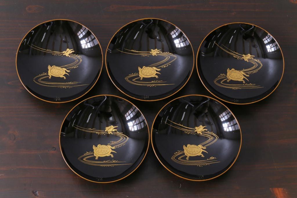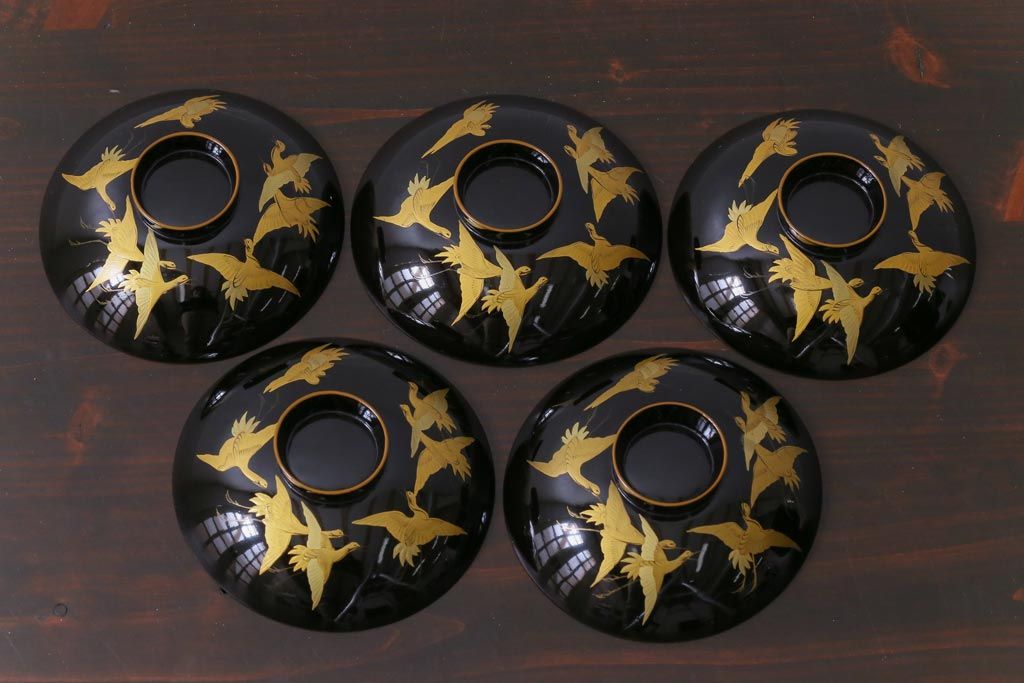 和製アンティーク 鶴・亀図柄 黒漆に金彩蒔絵が映える木製お椀5客セット(漆器)