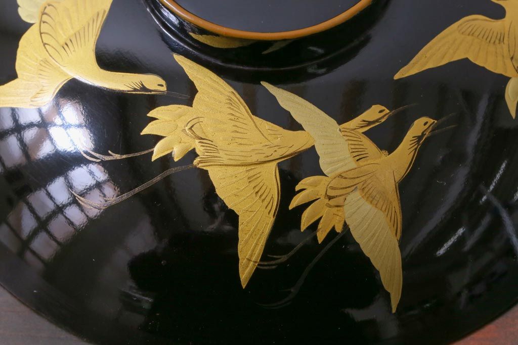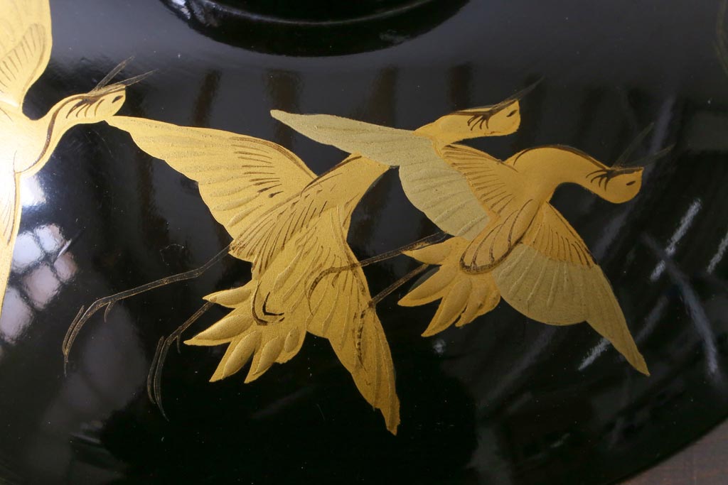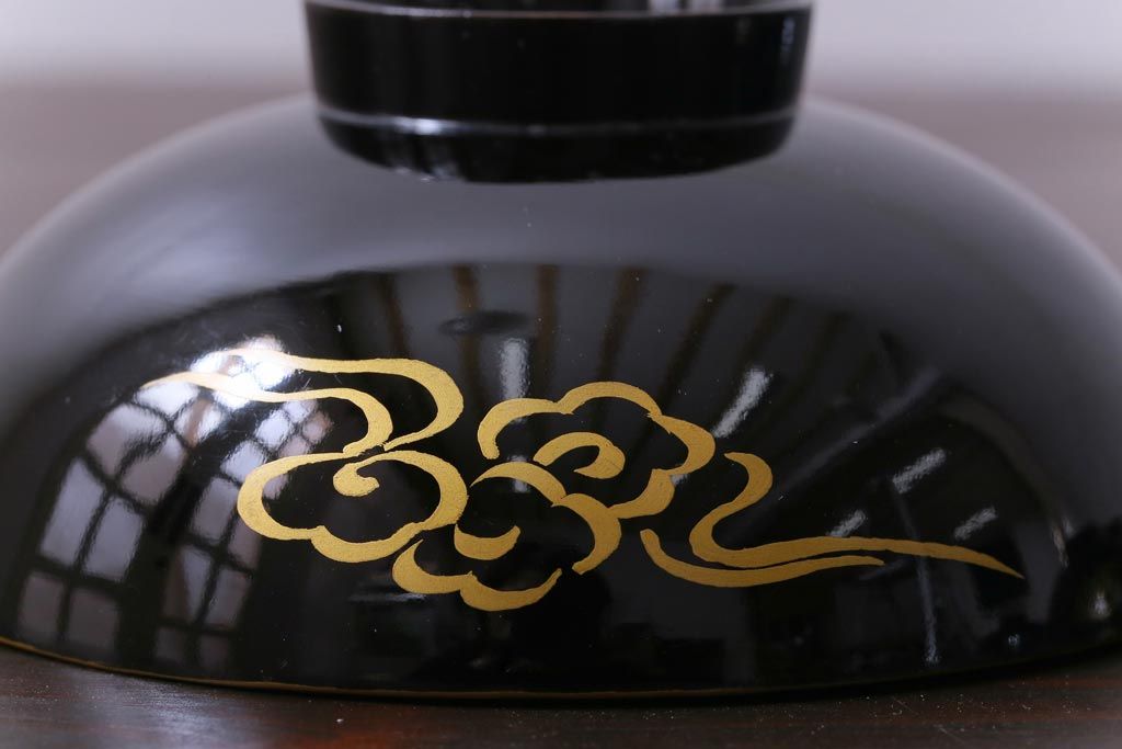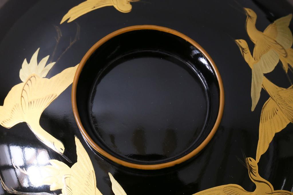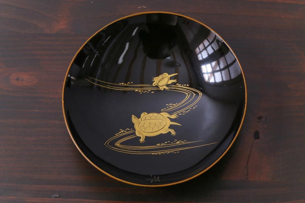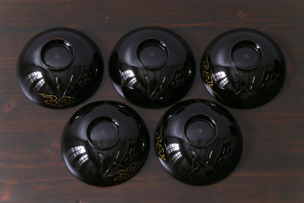 ラフジュ工房> 骨董・美術品> 骨董-漆器 > 和製アンティーク 鶴・亀図柄 黒漆に金彩蒔絵が映える木製お椀5客セット(漆器)