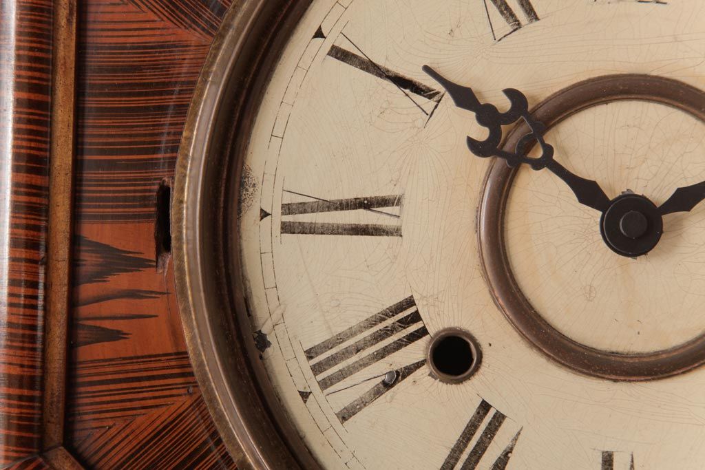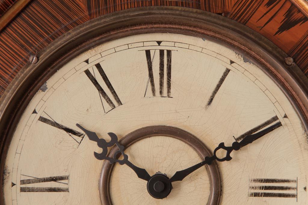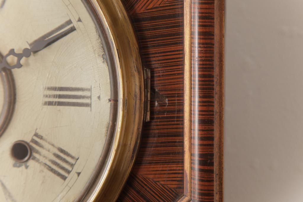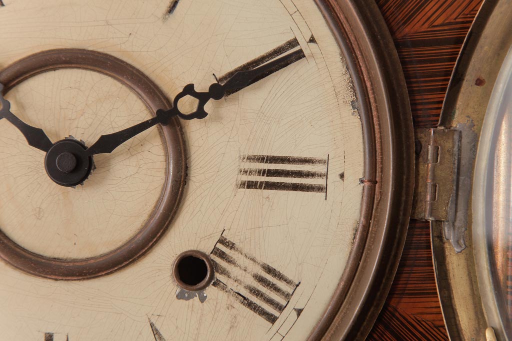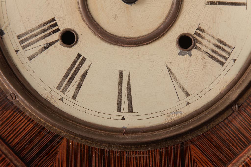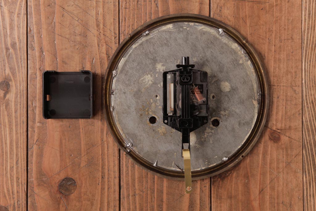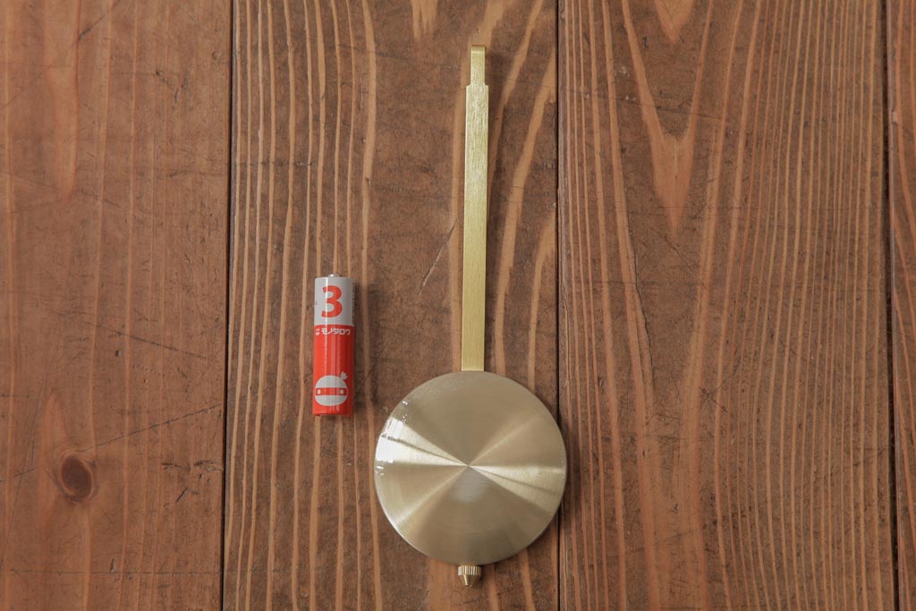 ムーブメントは新品の電池式に交換してあります。単三の乾電池が1本付属します。振り子は飾りで、動きますが針と連動はしていません。