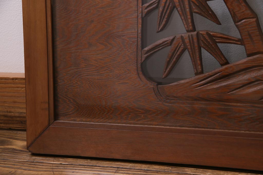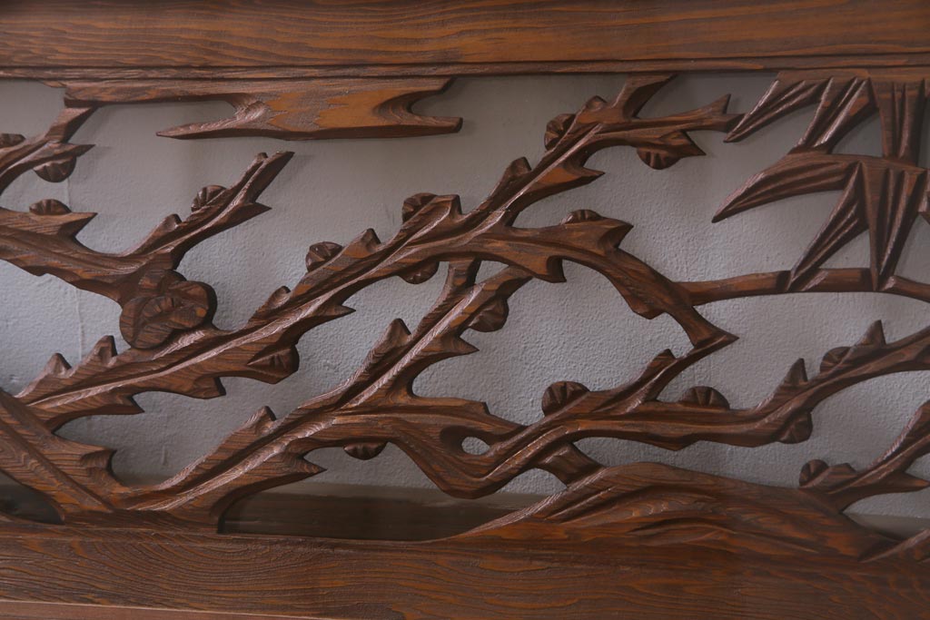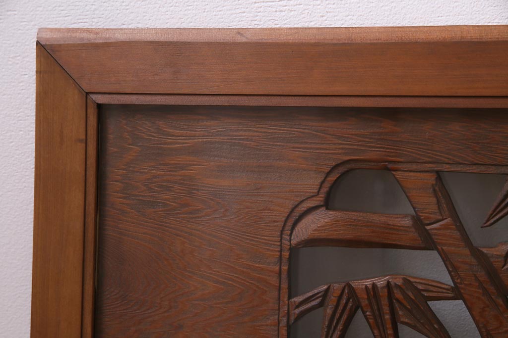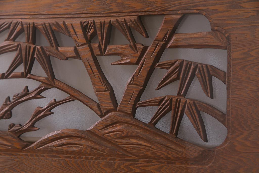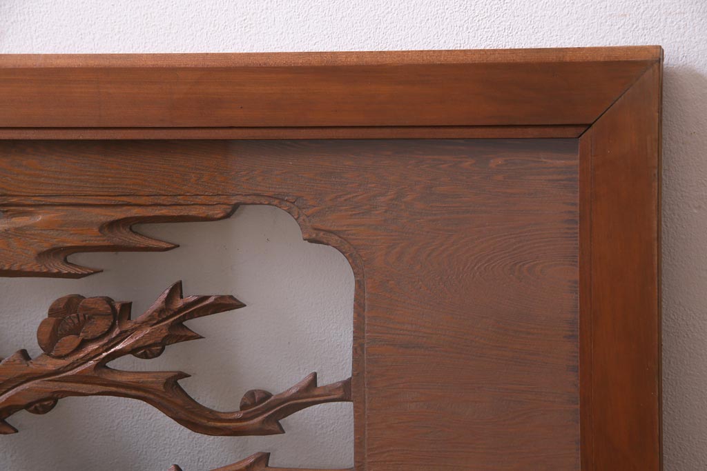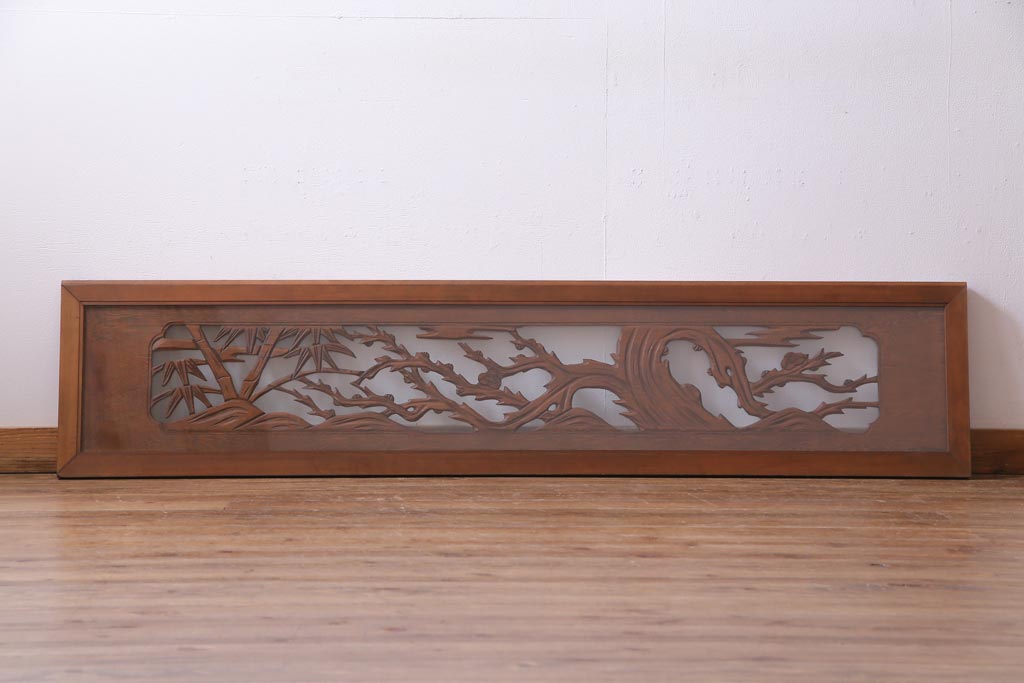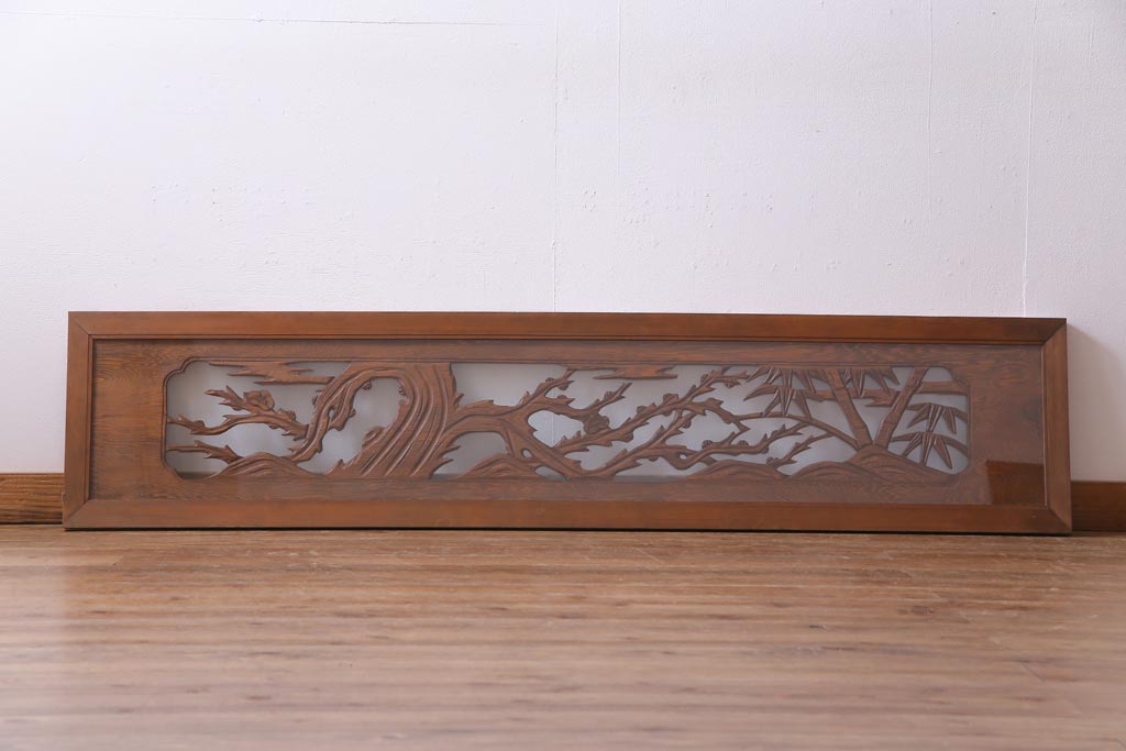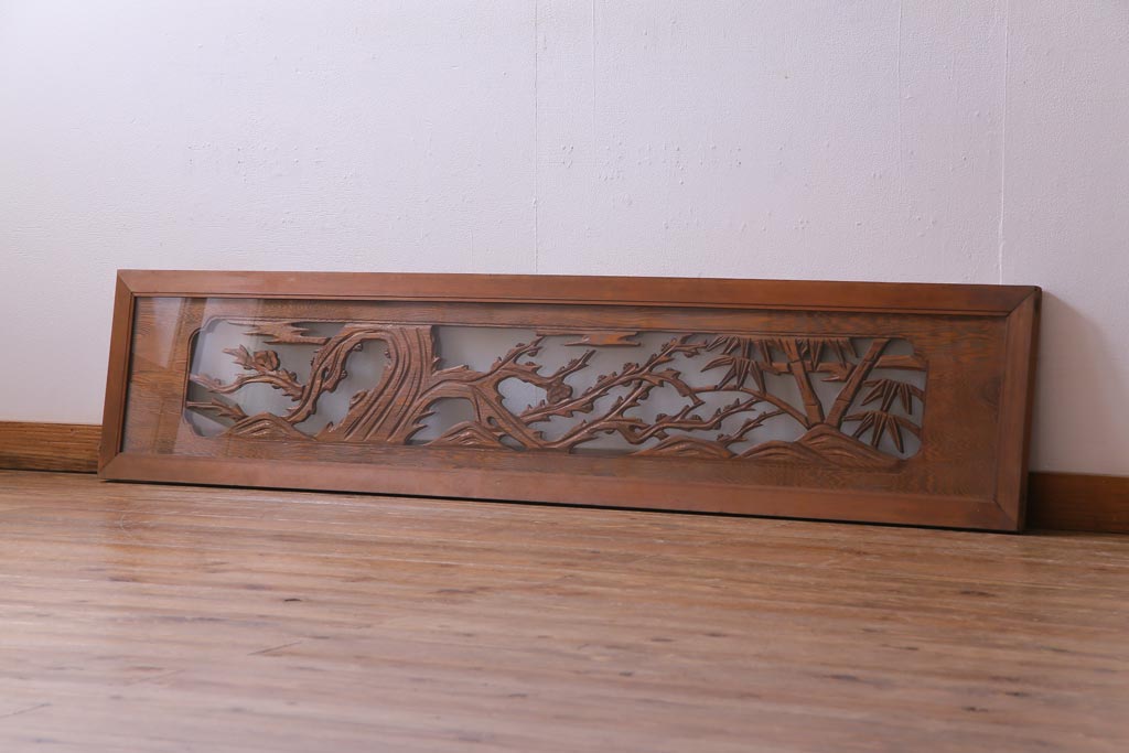 昭和中期 竹と梅 力強い存在感を放つ欄間(明かり取り、明り取り)です。 力強い彫刻が目を引く 昭和中期の欄間です。 竹と梅が彫られており、 和の空間をぐっと引き立てる一品です。 リフォームの際に取り付けるのはもちろん、 壁掛け飾りにしても雰囲気をお楽しみいただけますよ。 こちらのお品は両面ガラスです。 ダメージが少なく、アンティーク品として高品質なお品です。 使用上問題のあるダメージはありません。 ■框サイズ 上40mm/左35mm/右35mm/下40mm ■重量 約10kg