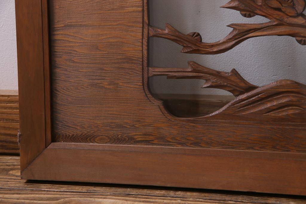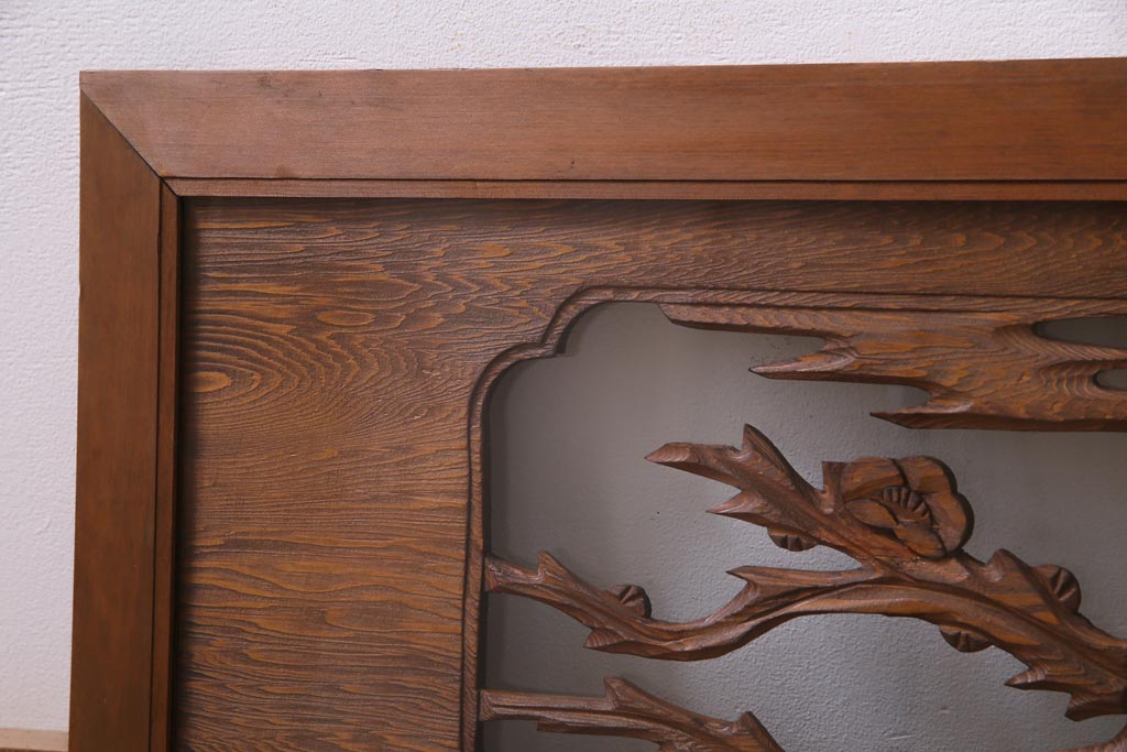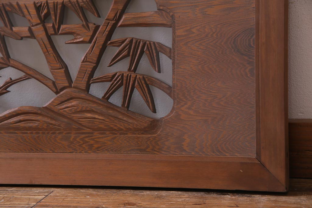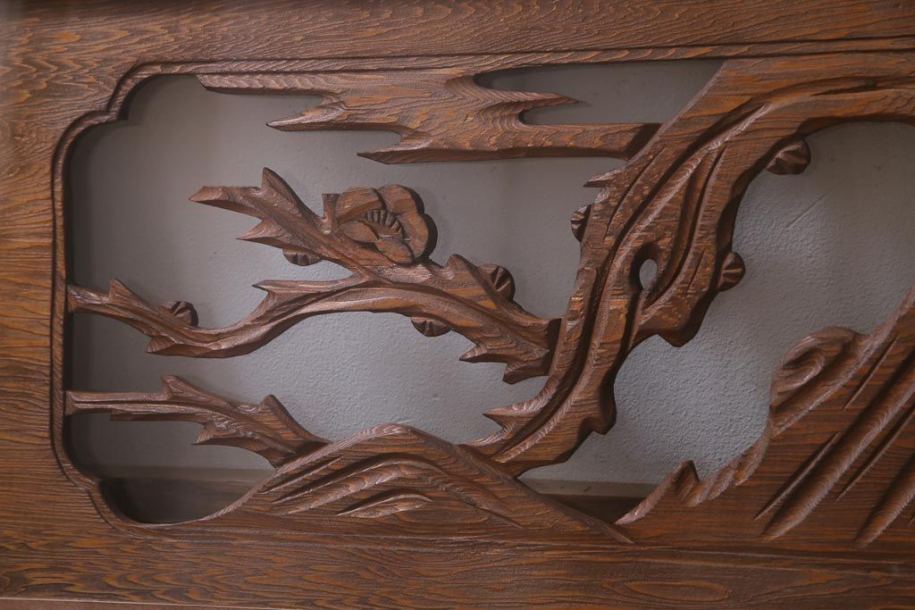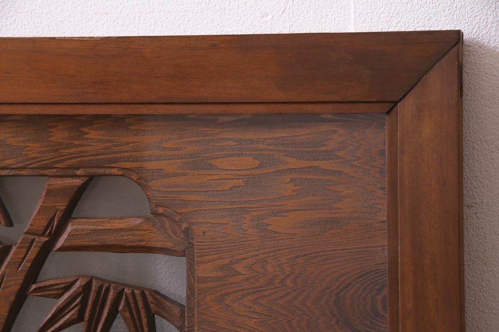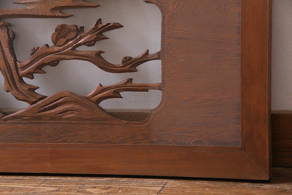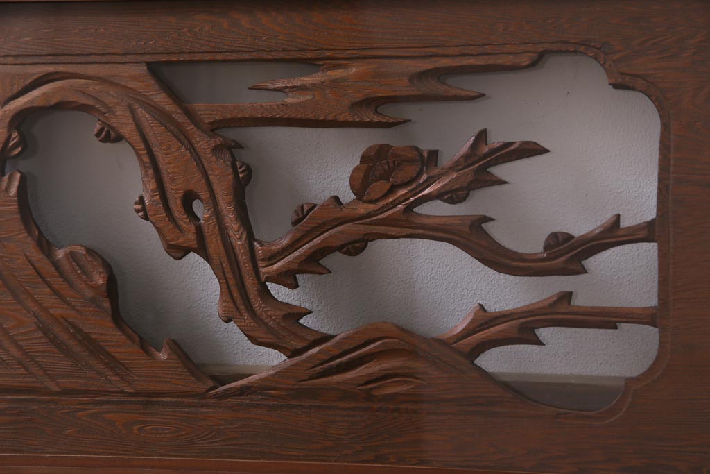 昭和中期 竹と梅 力強い存在感を放つ欄間(明かり取り、明り取り)です。 力強い彫刻が目を引く 昭和中期の欄間です。 竹と梅が彫られており、 和の空間をぐっと引き立てる一品です。 リフォームの際に取り付けるのはもちろん、 壁掛け飾りにしても雰囲気をお楽しみいただけますよ。 こちらのお品は両面ガラスです。 ダメージが少なく、アンティーク品として高品質なお品です。 使用上問題のあるダメージはありません。 ■框サイズ 上40mm/左35mm/右35mm/下40mm ■重量 約10kg
