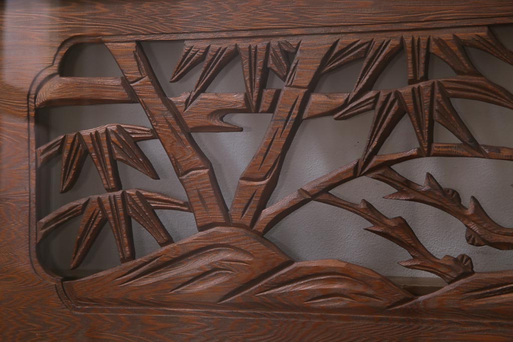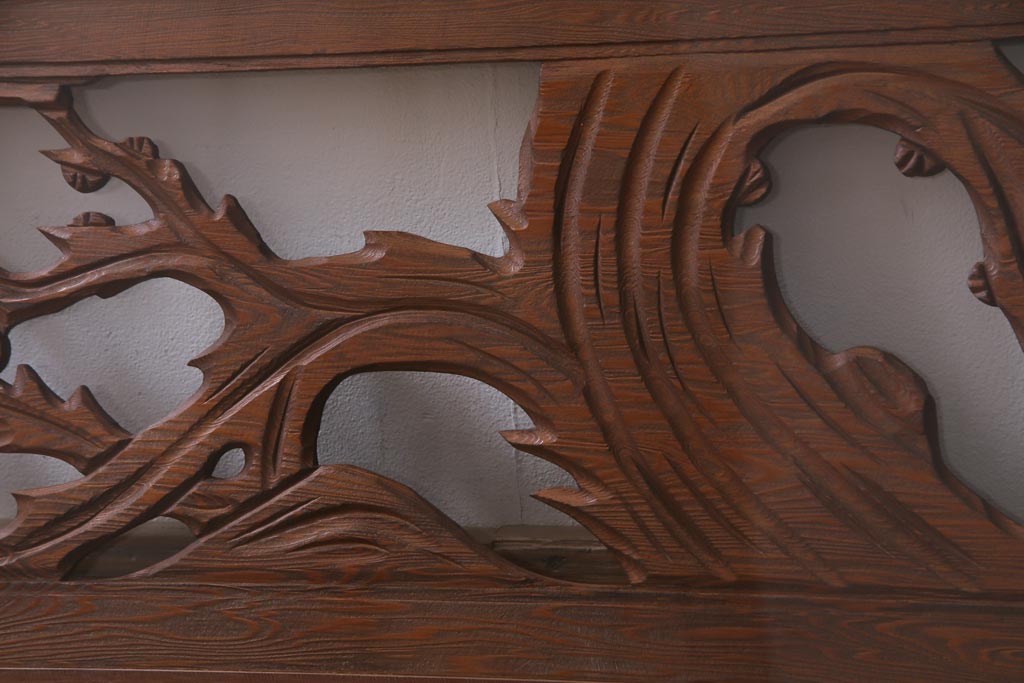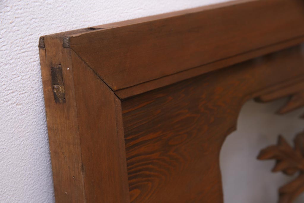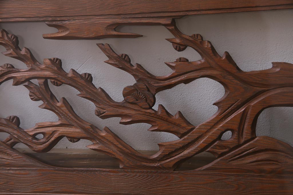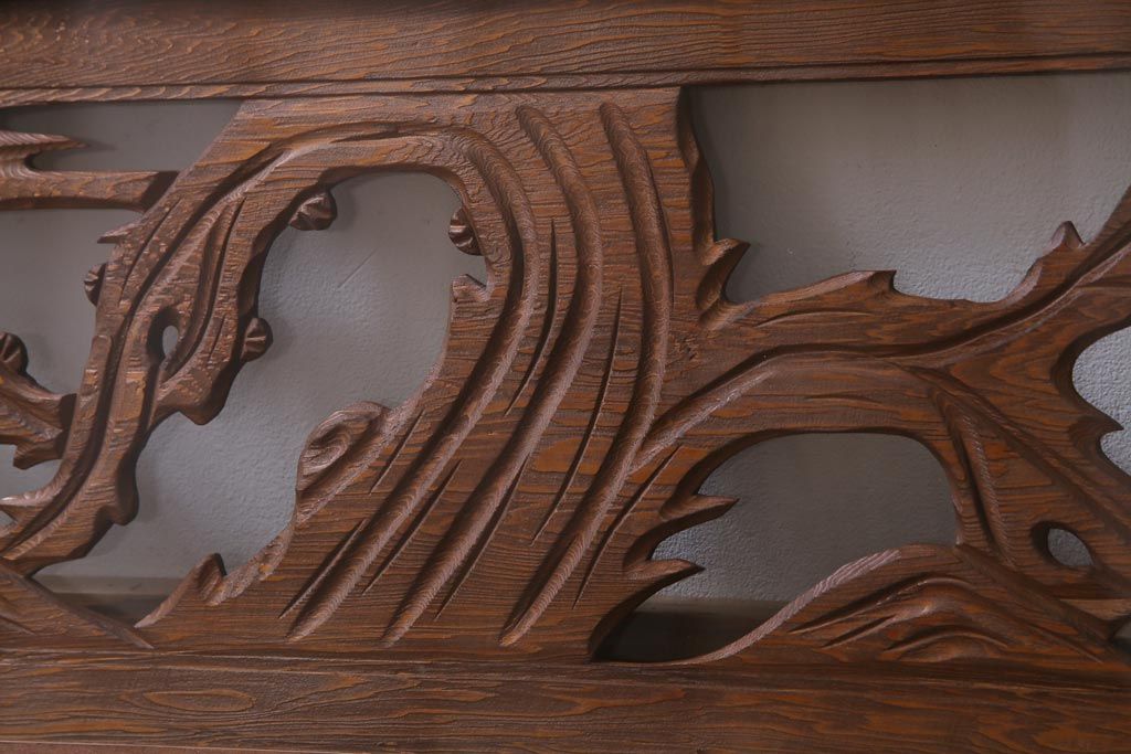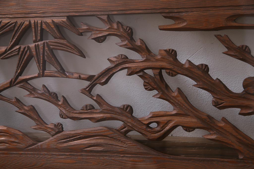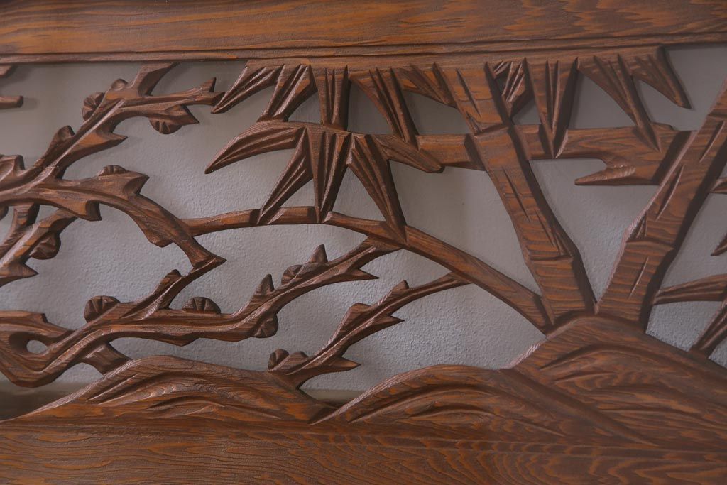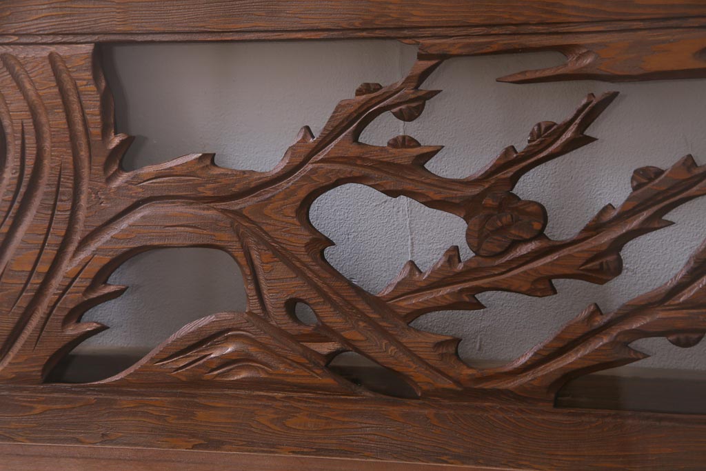 昭和中期 竹と梅 力強い存在感を放つ欄間(明かり取り、明り取り)です。 力強い彫刻が目を引く 昭和中期の欄間です。 竹と梅が彫られており、 和の空間をぐっと引き立てる一品です。 リフォームの際に取り付けるのはもちろん、 壁掛け飾りにしても雰囲気をお楽しみいただけますよ。 こちらのお品は両面ガラスです。 ダメージが少なく、アンティーク品として高品質なお品です。 使用上問題のあるダメージはありません。 ■框サイズ 上40mm/左35mm/右35mm/下40mm ■重量 約10kg