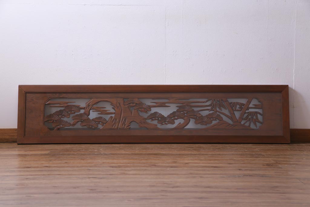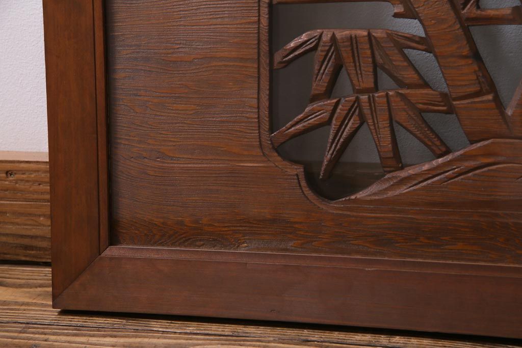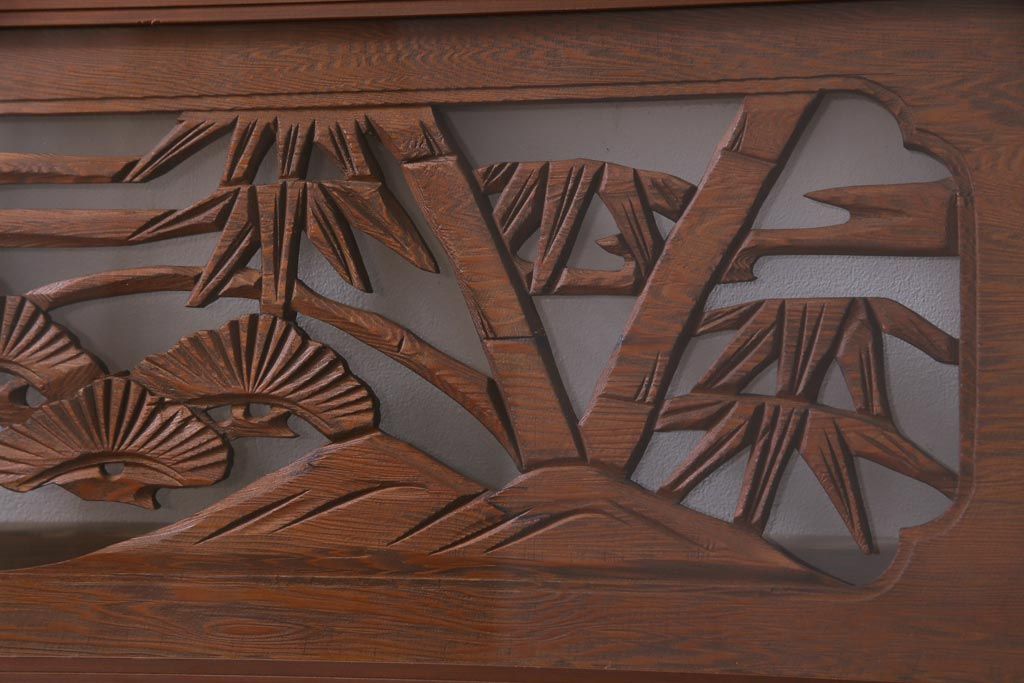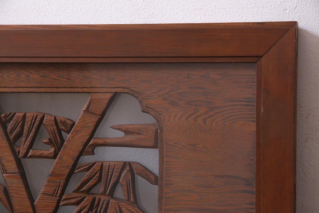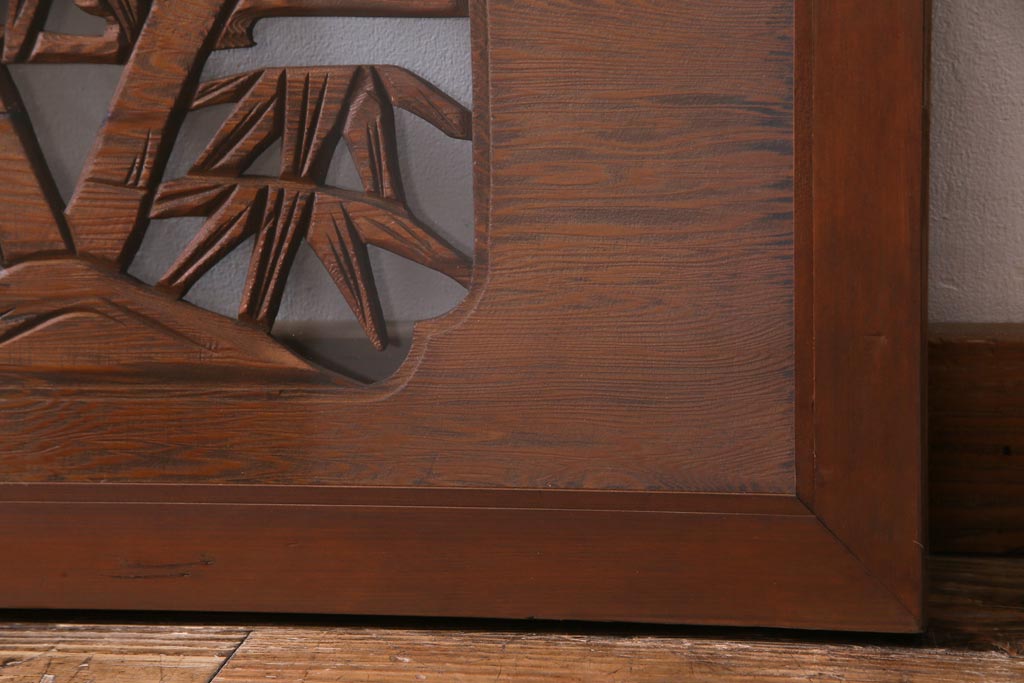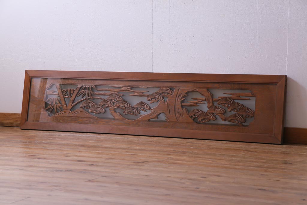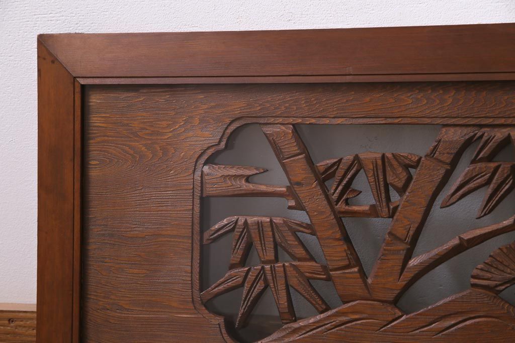 昭和中期 竹と松 力強い存在感を放つ欄間(明かり取り、明り取り)です。 力強い彫刻が目を引く 昭和中期の欄間です。 竹と松が彫られており、 和の空間をぐっと引き立てる一品です。 リフォームの際に取り付けるのはもちろん、 壁掛け飾りにしても雰囲気をお楽しみいただけますよ。 こちらのお品は両面ガラスです。 ダメージが少なく、アンティーク品として高品質なお品です。 使用上問題のあるダメージはありません。 ■框サイズ 上40mm/左35mm/右35mm/下40mm ■重量 約10kg