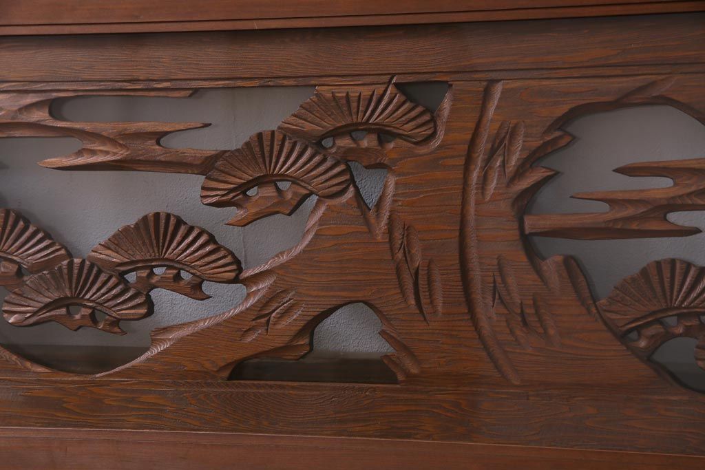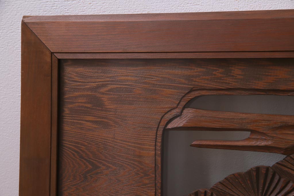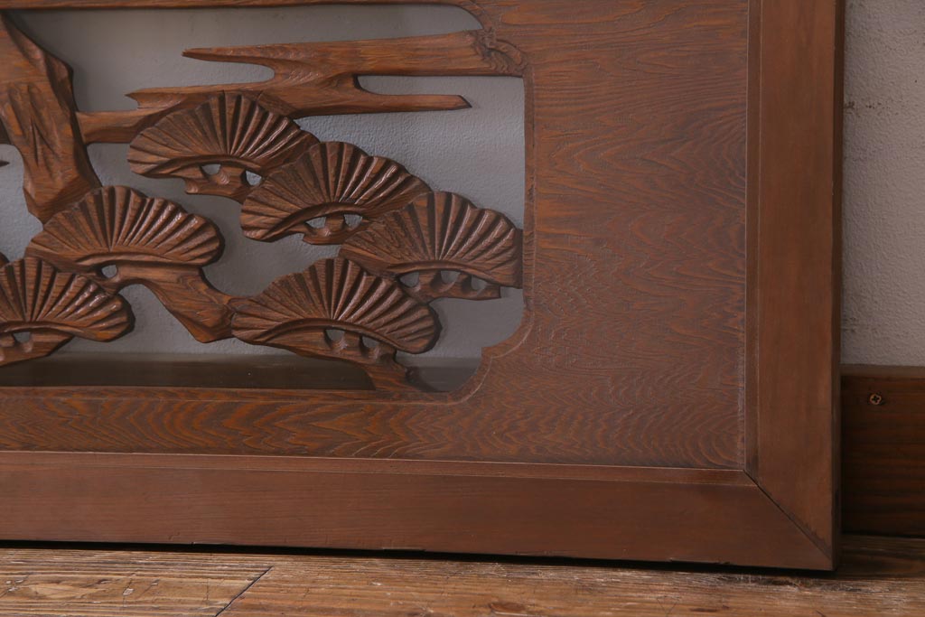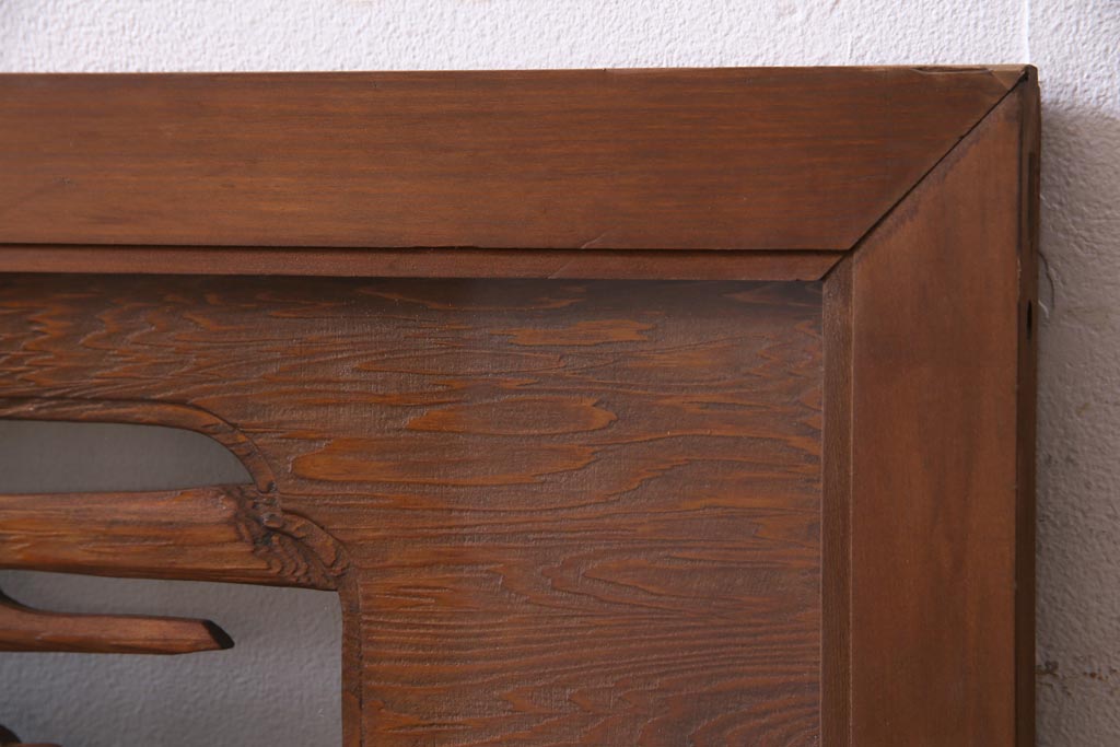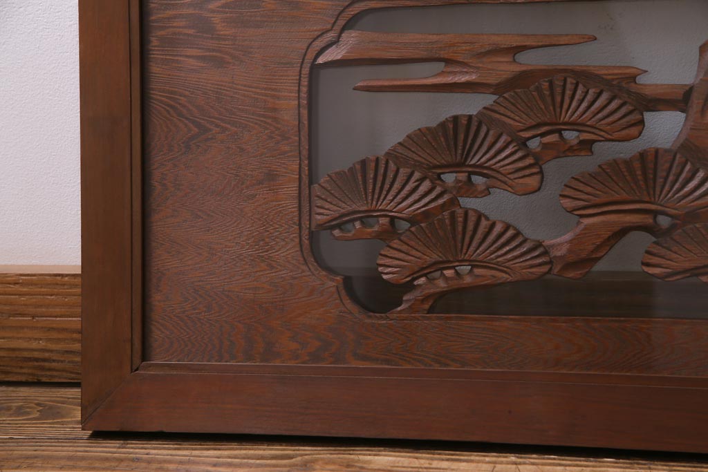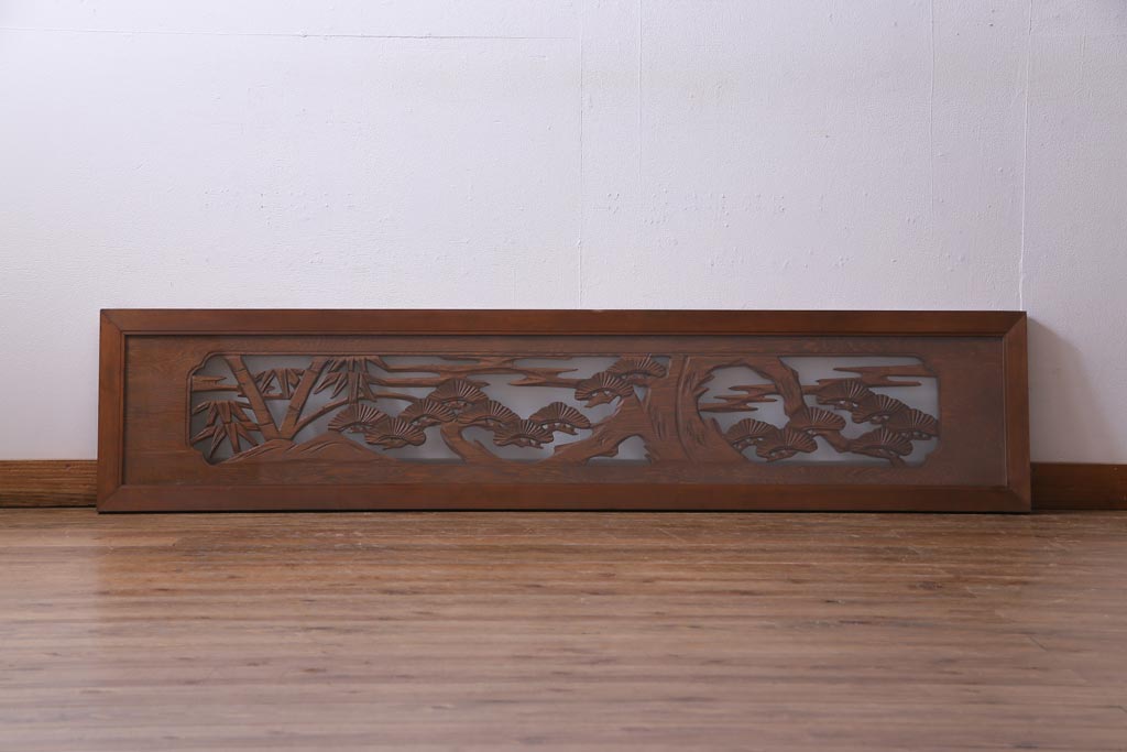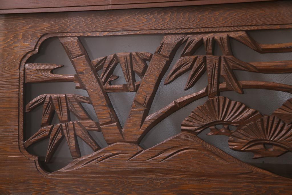 昭和中期 竹と松 力強い存在感を放つ欄間(明かり取り、明り取り)です。 力強い彫刻が目を引く 昭和中期の欄間です。 竹と松が彫られており、 和の空間をぐっと引き立てる一品です。 リフォームの際に取り付けるのはもちろん、 壁掛け飾りにしても雰囲気をお楽しみいただけますよ。 こちらのお品は両面ガラスです。 ダメージが少なく、アンティーク品として高品質なお品です。 使用上問題のあるダメージはありません。 ■框サイズ 上40mm/左35mm/右35mm/下40mm ■重量 約10kg