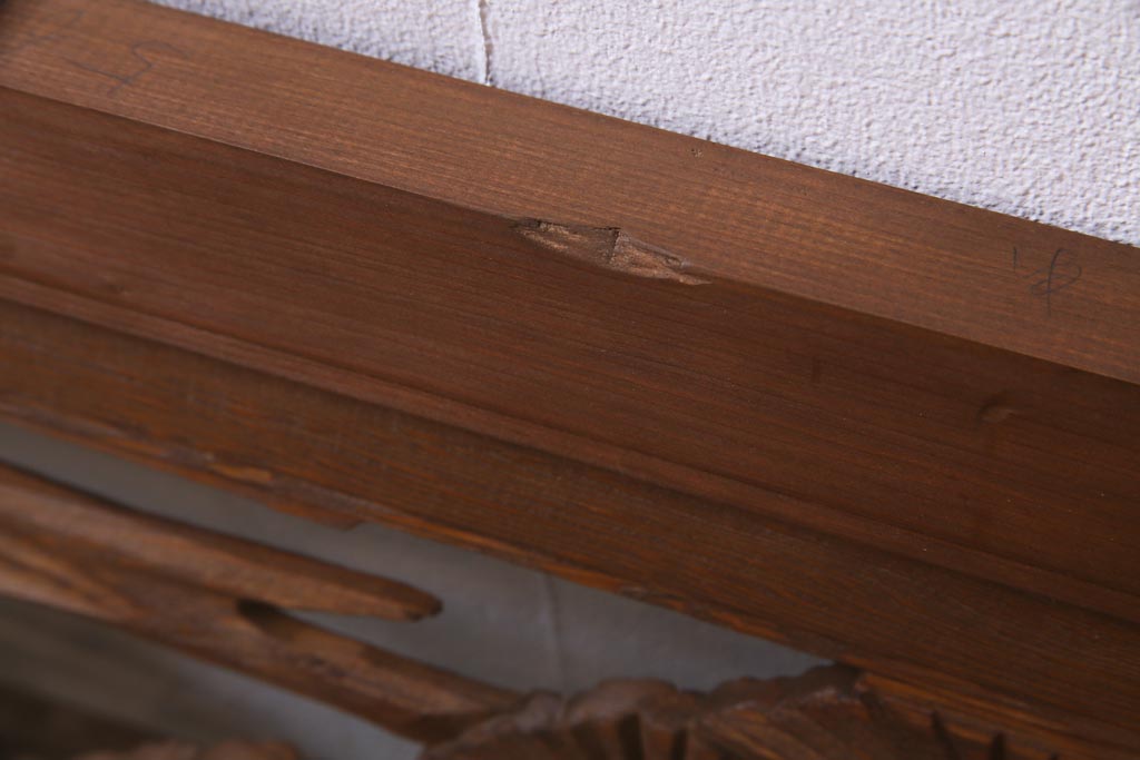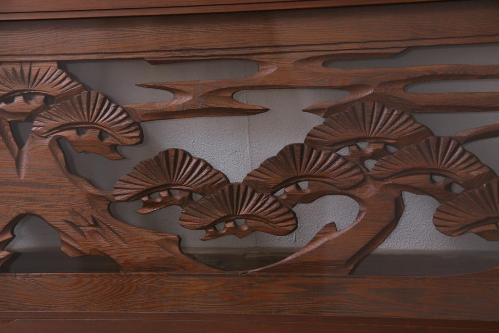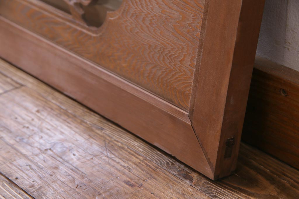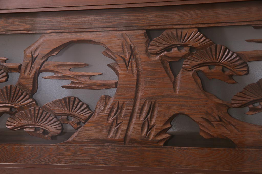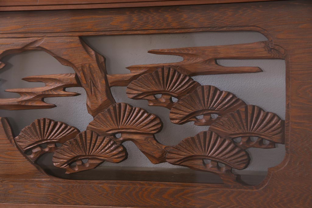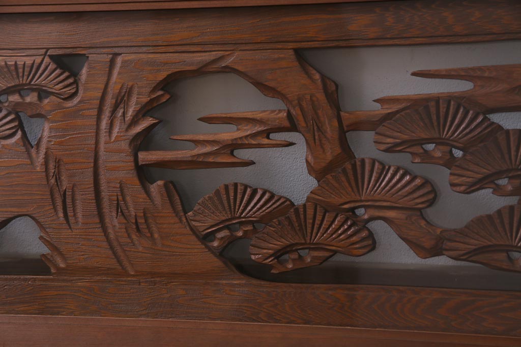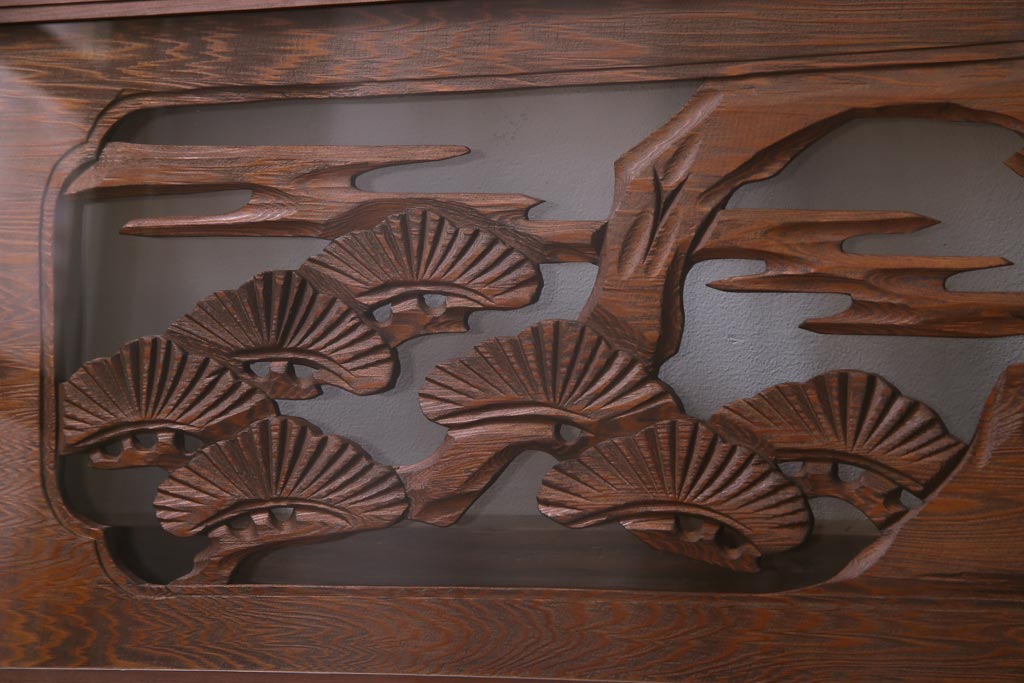 昭和中期 竹と松 力強い存在感を放つ欄間(明かり取り、明り取り)です。 力強い彫刻が目を引く 昭和中期の欄間です。 竹と松が彫られており、 和の空間をぐっと引き立てる一品です。 リフォームの際に取り付けるのはもちろん、 壁掛け飾りにしても雰囲気をお楽しみいただけますよ。 こちらのお品は両面ガラスです。 ダメージが少なく、アンティーク品として高品質なお品です。 使用上問題のあるダメージはありません。 ■框サイズ 上40mm/左35mm/右35mm/下40mm ■重量 約10kg
