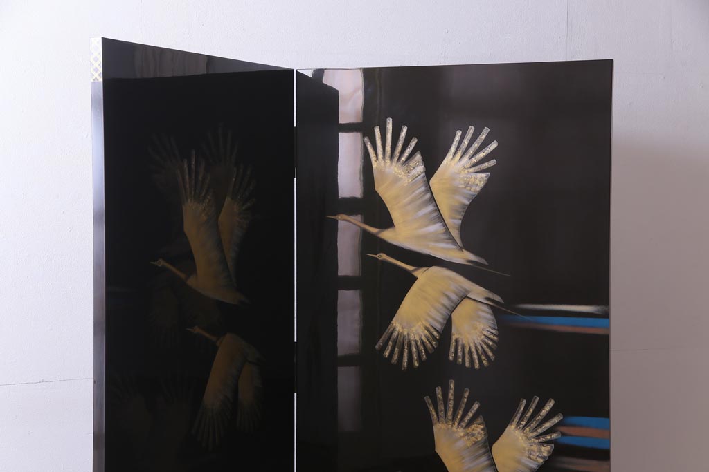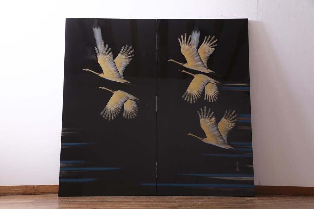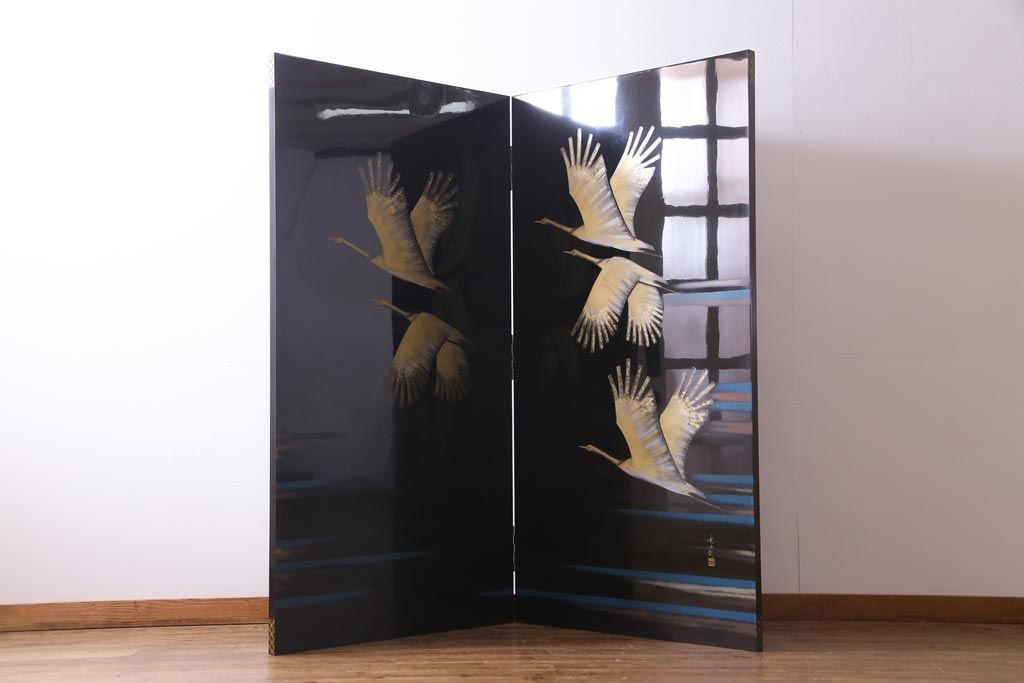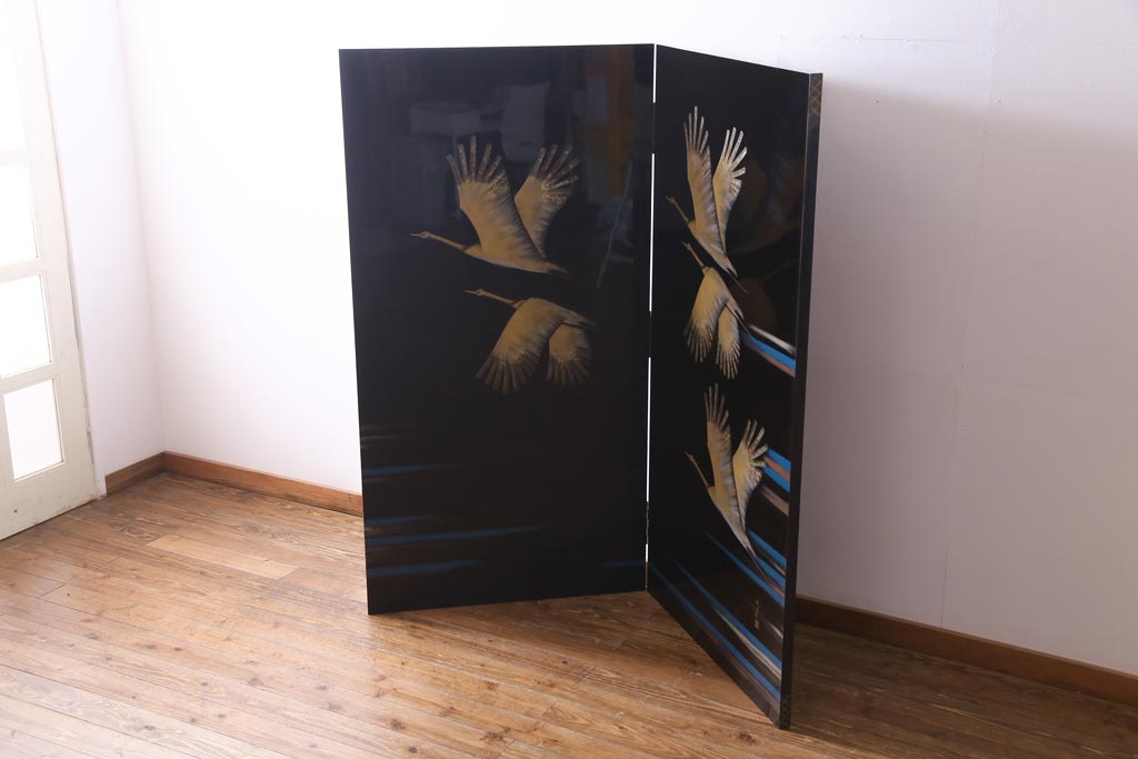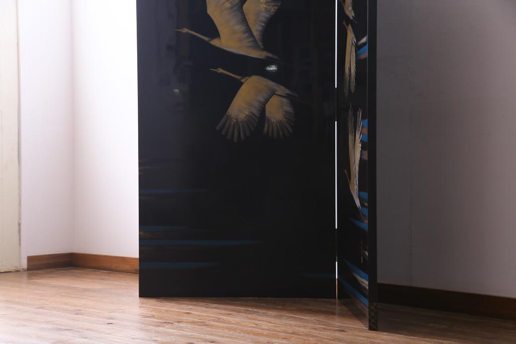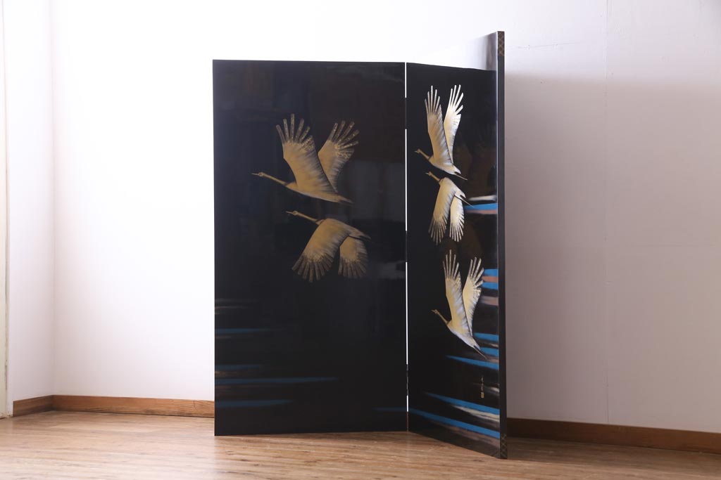 中古 日展作家 加治武 大作 輪島塗 沈金 翔鶴図 透けるような繊細さと躍動感が目を引く衝立(つい立て)です。