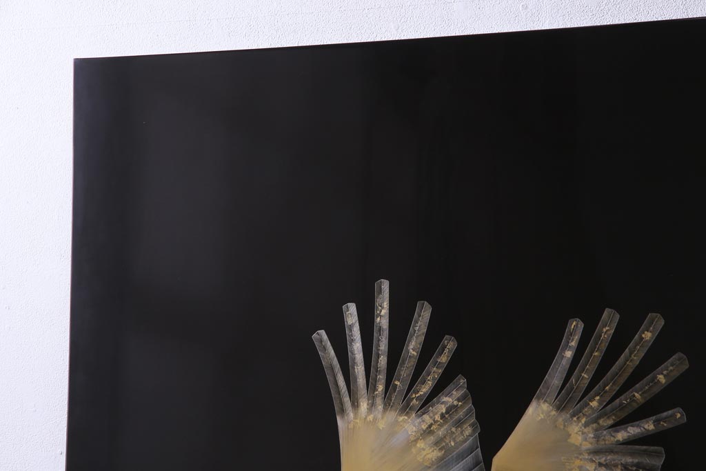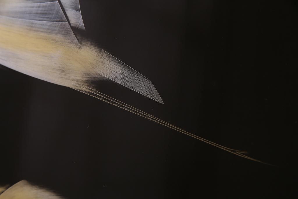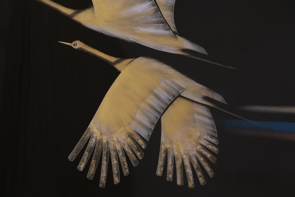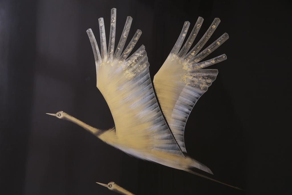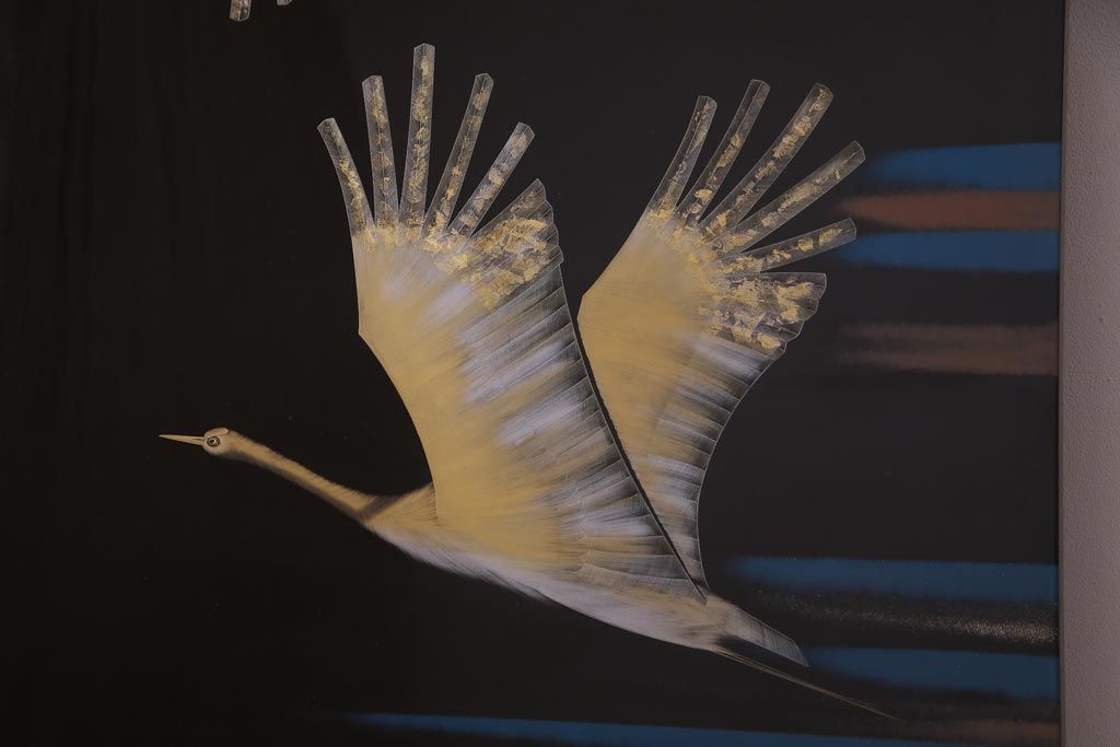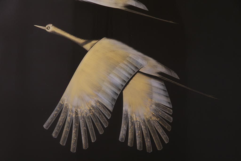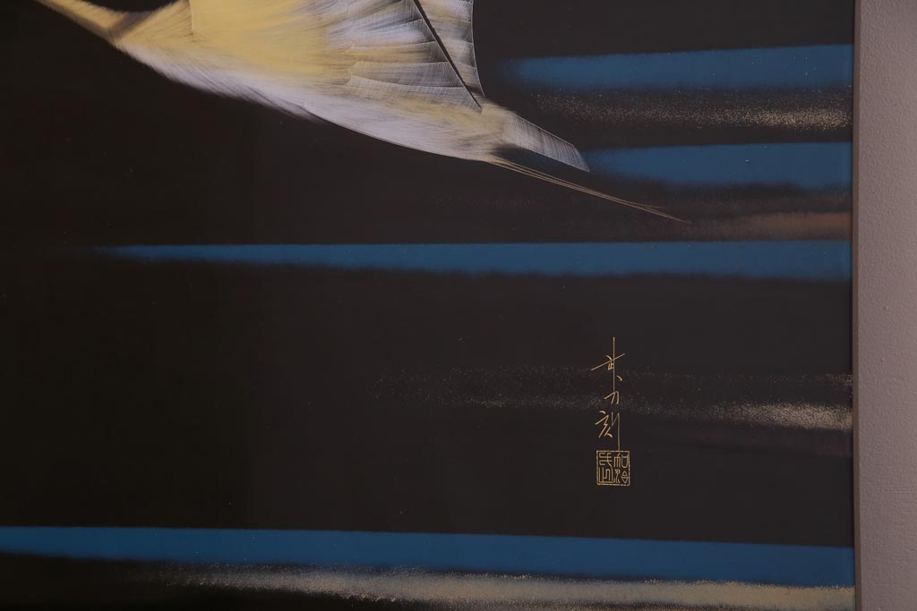 中古 日展作家 加治武 大作 輪島塗 沈金 翔鶴図 透けるような繊細さと躍動感が目を引く衝立(つい立て)です。