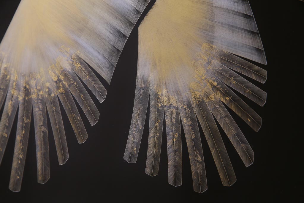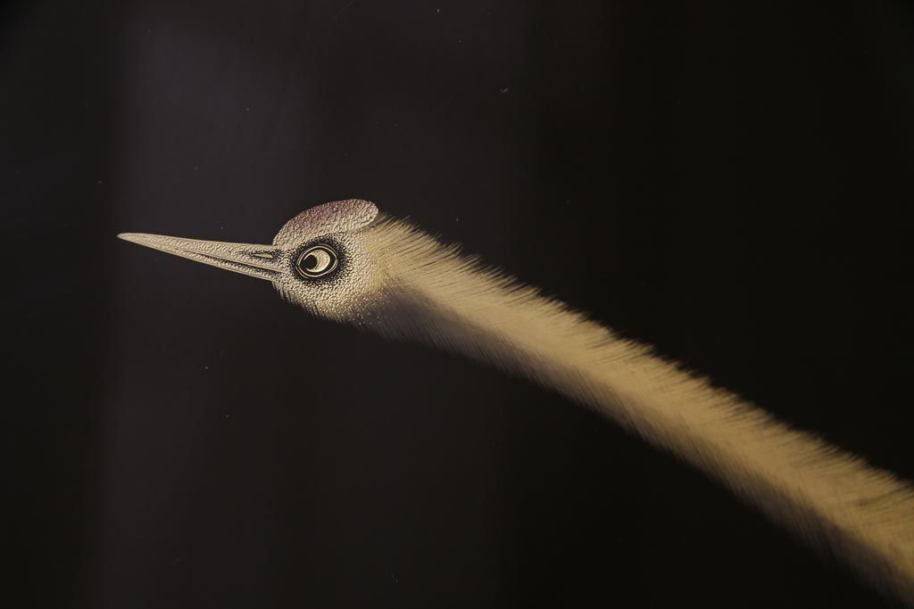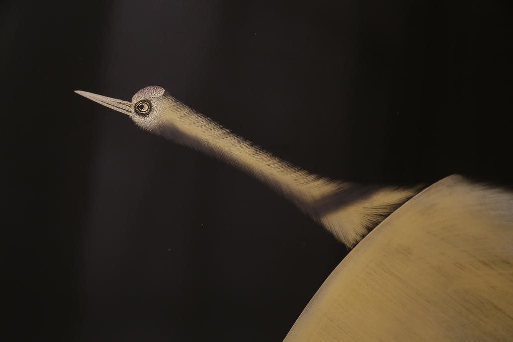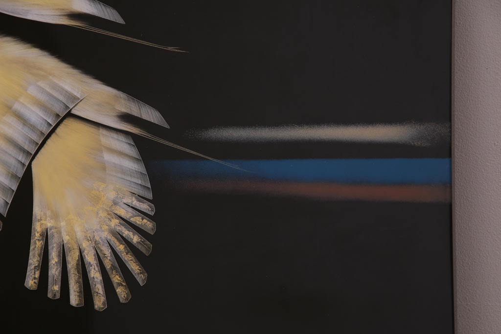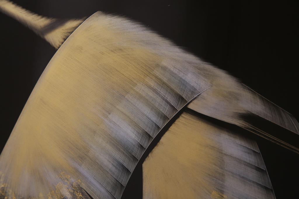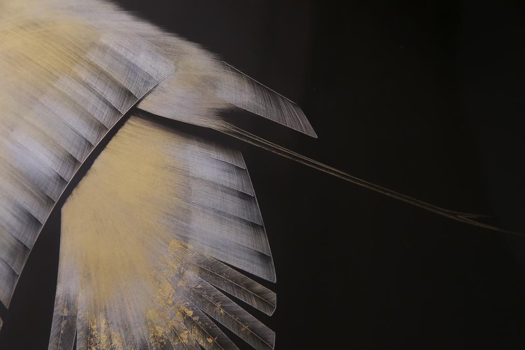 中古 日展作家 加治武 大作 輪島塗 沈金 翔鶴図 透けるような繊細さと躍動感が目を引く衝立(つい立て)です。