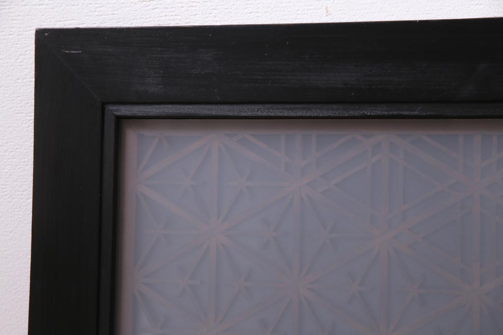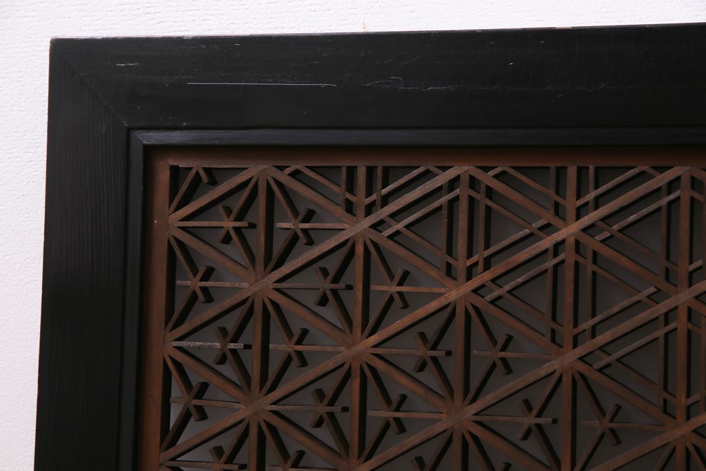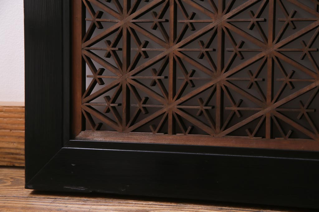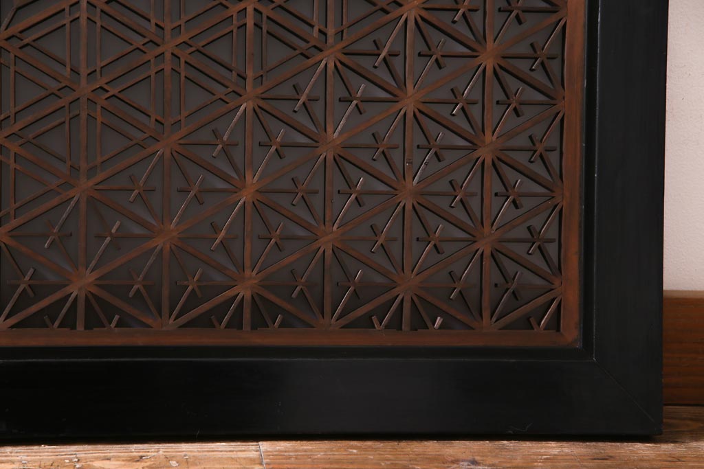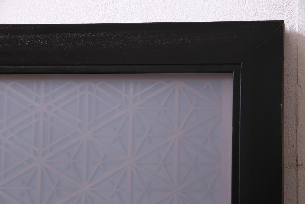 和製アンティーク すりガラス入り 組子と漆塗りが上品な雰囲気醸し出す欄間(ディスプレイ、明り取り)です。 細かな組子のつくりが味わい深い、 和製アンティークの欄間です。 木製の枠には漆が塗られており 上品な和の雰囲気が漂うお品です。 裏面にはすりガラスを入れて仕上げました。 明り取りとしてはもちろん ディスプレイとしても活躍してくれますよ。 片面のみ、すりガラスが入っています。 ダメージが少なく、アンティーク品として高品質なお品です。 使用上問題のあるダメージはありません。 ■框サイズ 上50mm/左50mm/右50mm/下50mm ■重量 約6kg