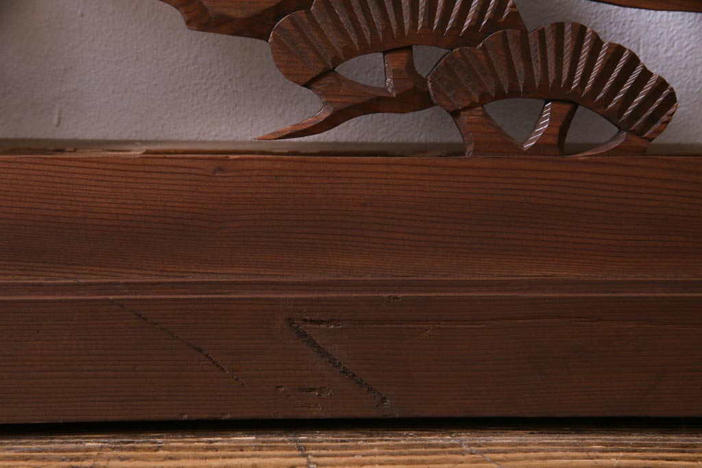 吉祥モチーフの鶴と松が彫られた