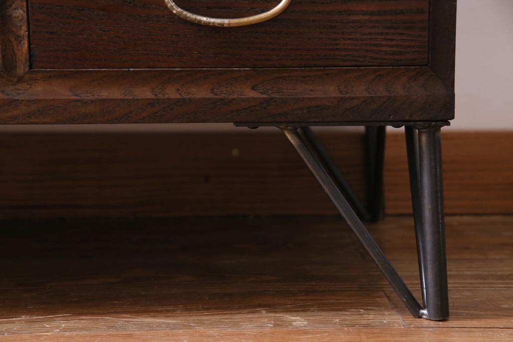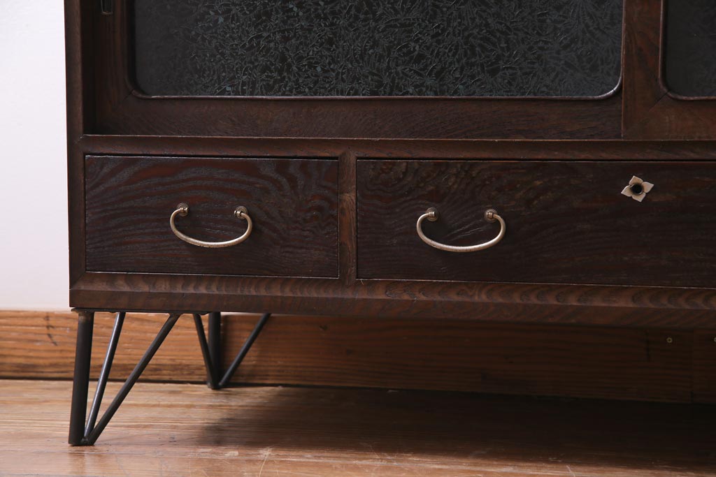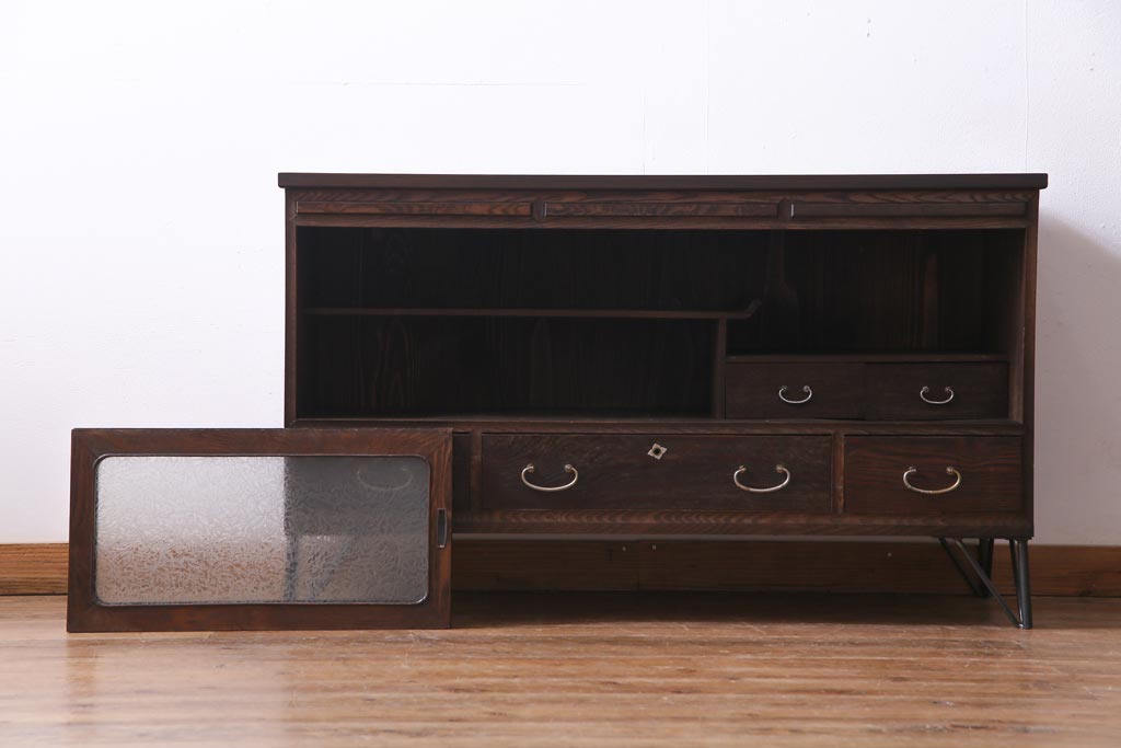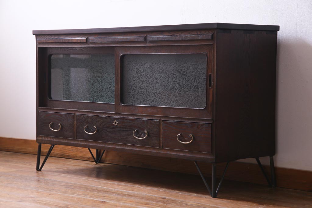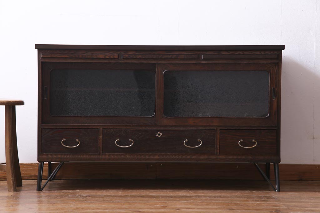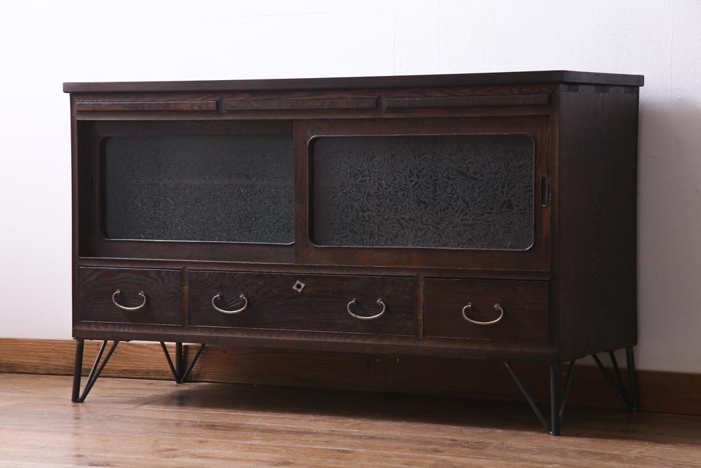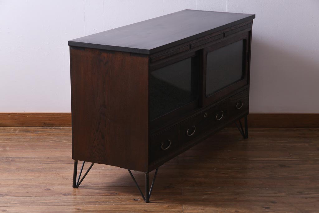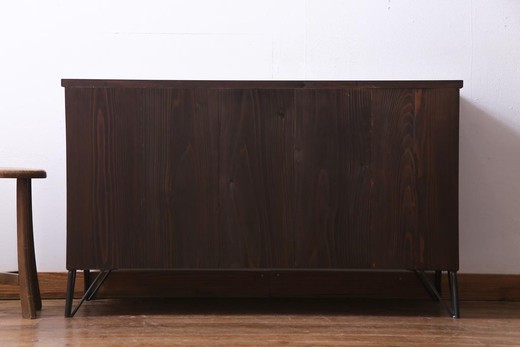 レトロ家具 昭和レトロ 前面桑材 鉄脚付リメイク 趣きある木味が魅力的なリビングボード(ローボード、戸棚、収納棚)