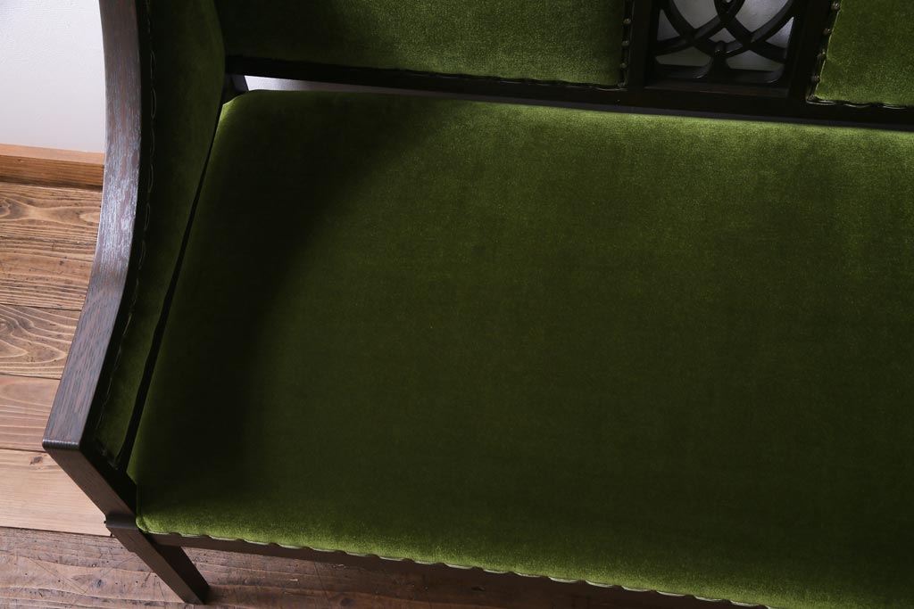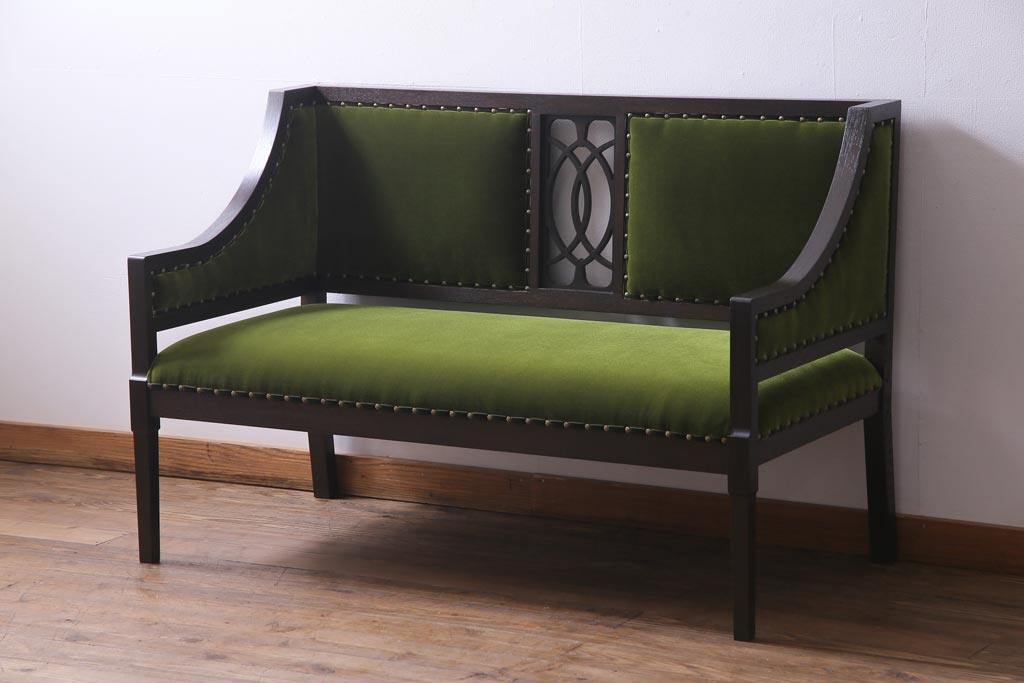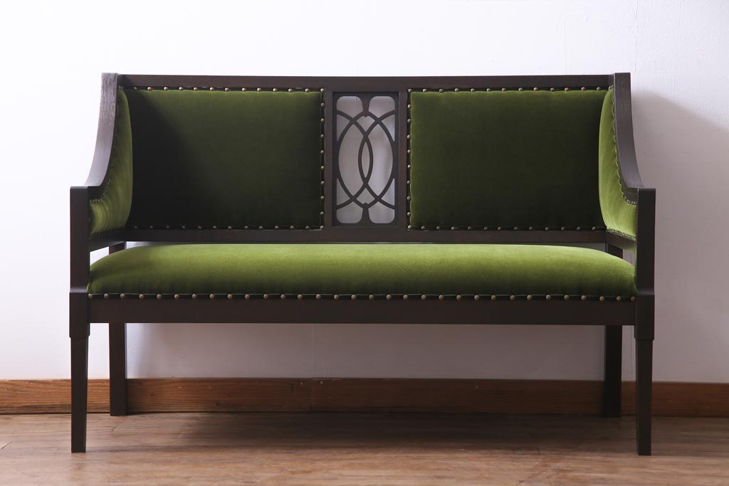 オーダー注文が可能な当店オリジナルのソファです。大正時代のデザインをモチーフに製作した、2人掛けソファですが、フレーム、座面の色合いはお好みに変更できます。背もたれの透かし彫りや、ナラ材の重厚な色味による気品のある佇まいを忠実に再現し、まるで本物のアンティークソファのような大正ロマン香る一品です。新品ですので、古い家具に抵抗がある方でもアンティークの魅力を存分に楽しむことができ、ご自宅にはもちろん、店舗でも安心してご使用いただけますよ。また、受注生産もできるので、同じデザインで色違いといったオーダーも可能です。クラシカルな洋間や、和洋折衷の空間づくりにいかがでしょうか。