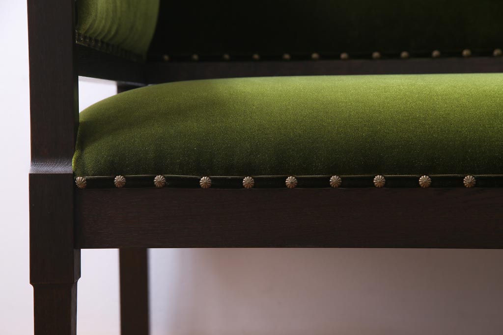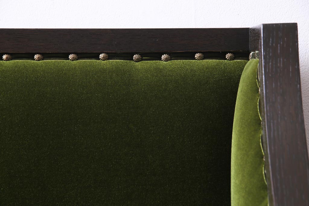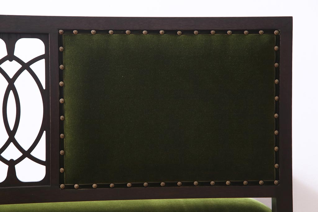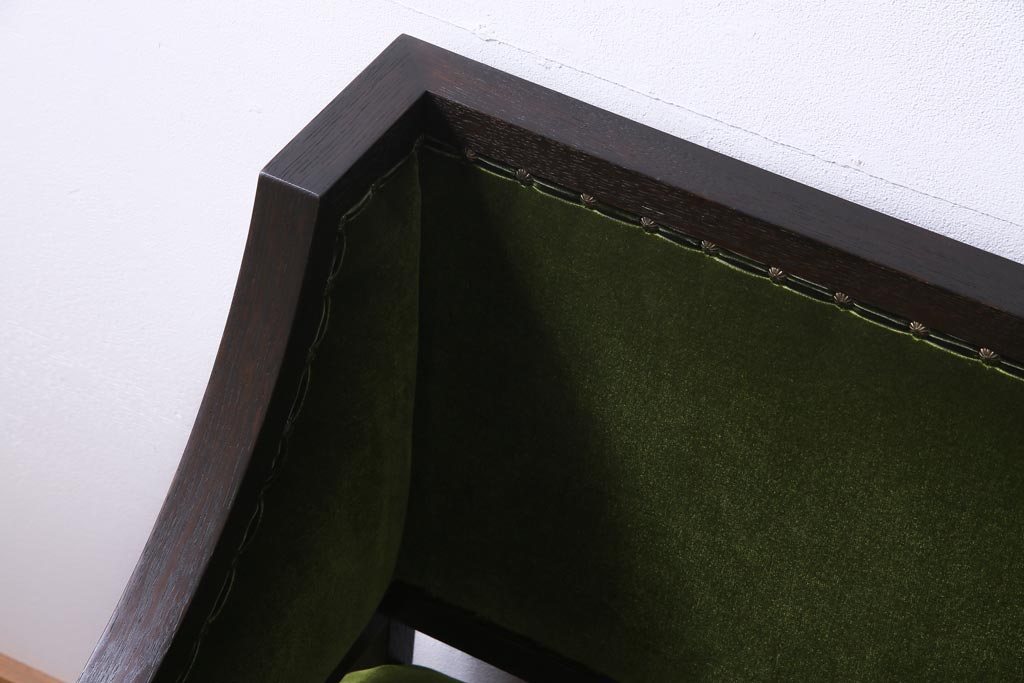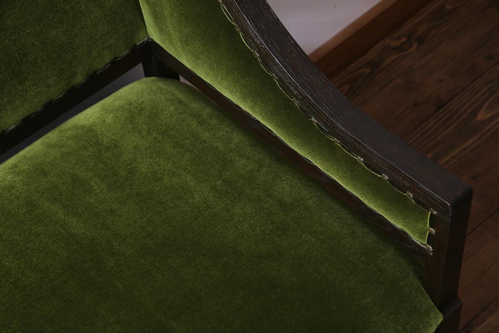 - こちらはダークブラウンのフレームに、深いグリーンのベルベッド生地を組み合わせ、大正ロマンらしい配色に仕上げました。「だけど、緑より、赤が欲しい」そんなお悩みも解決します。フレームの色味だけでなく、座面の色もお好みに合わせて変更できます。生地もベルベッドに限らず豊富に揃えておりますので、詳しくはお気軽にお問い合わせください。大正ロマン香るソファを、自分だけの色合いで、ぜひお楽しみください。