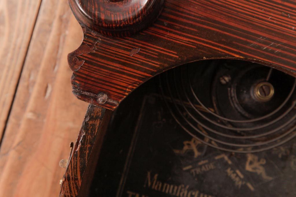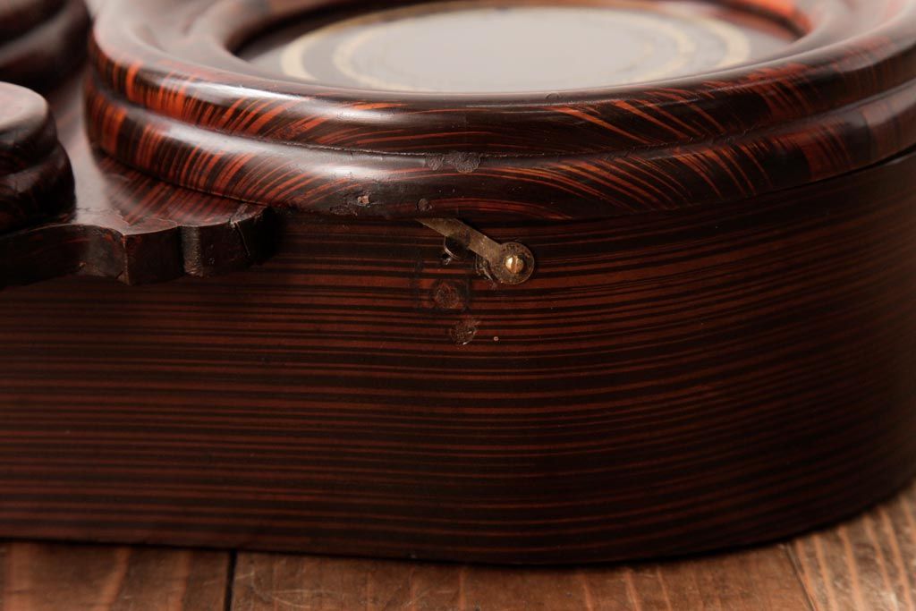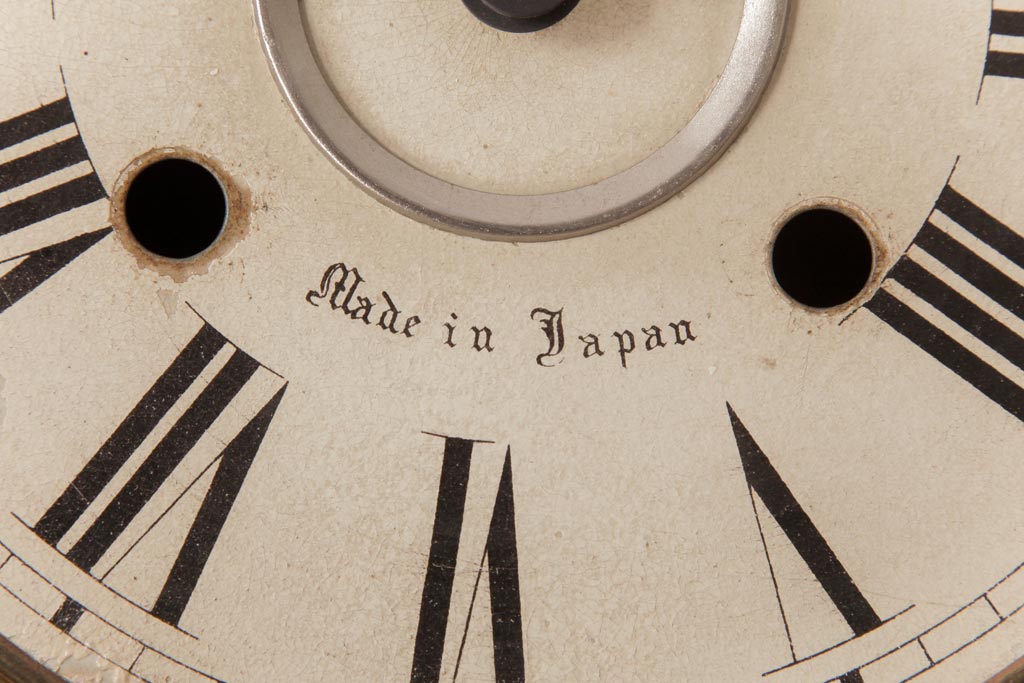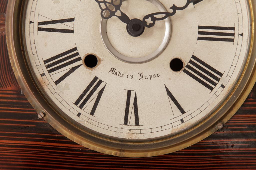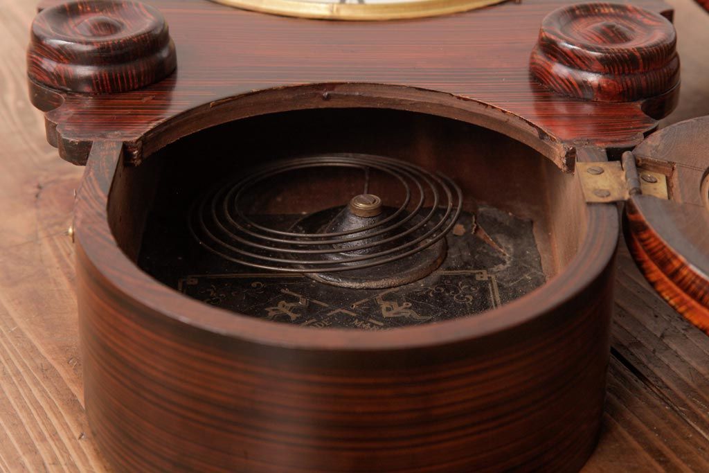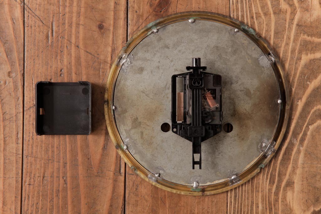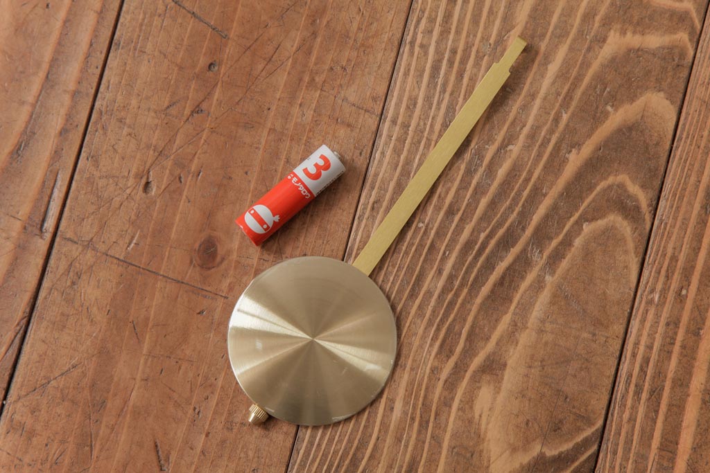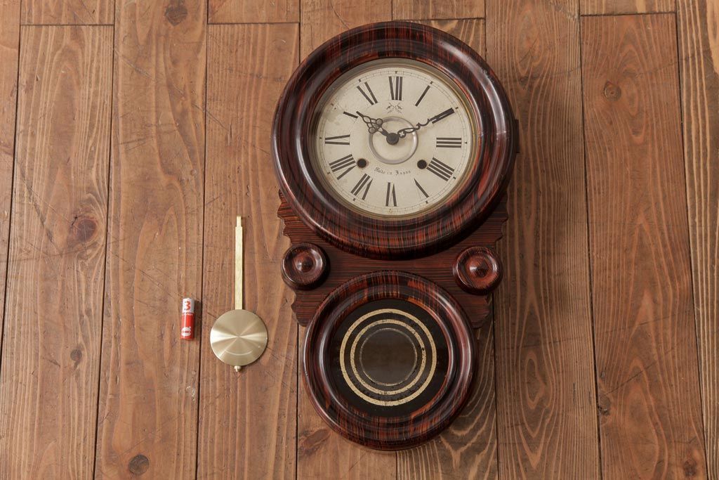 ムーブメントは新品の電池式に交換してあります。乾電池が付属します。振り子は飾りで、動きますが針と連動はしていません。