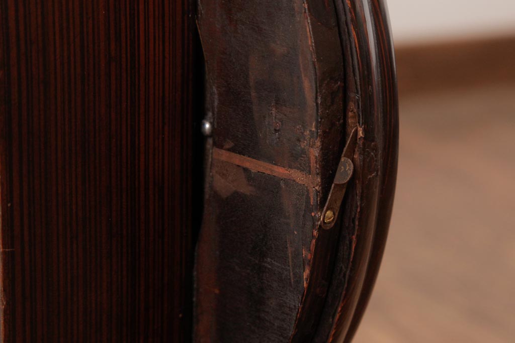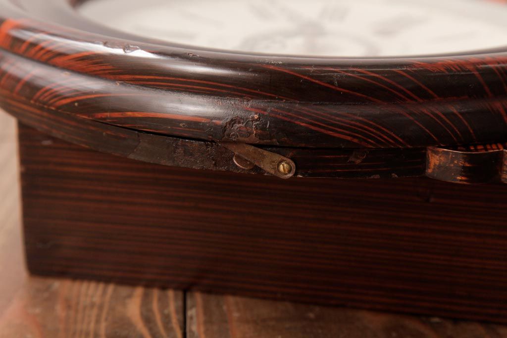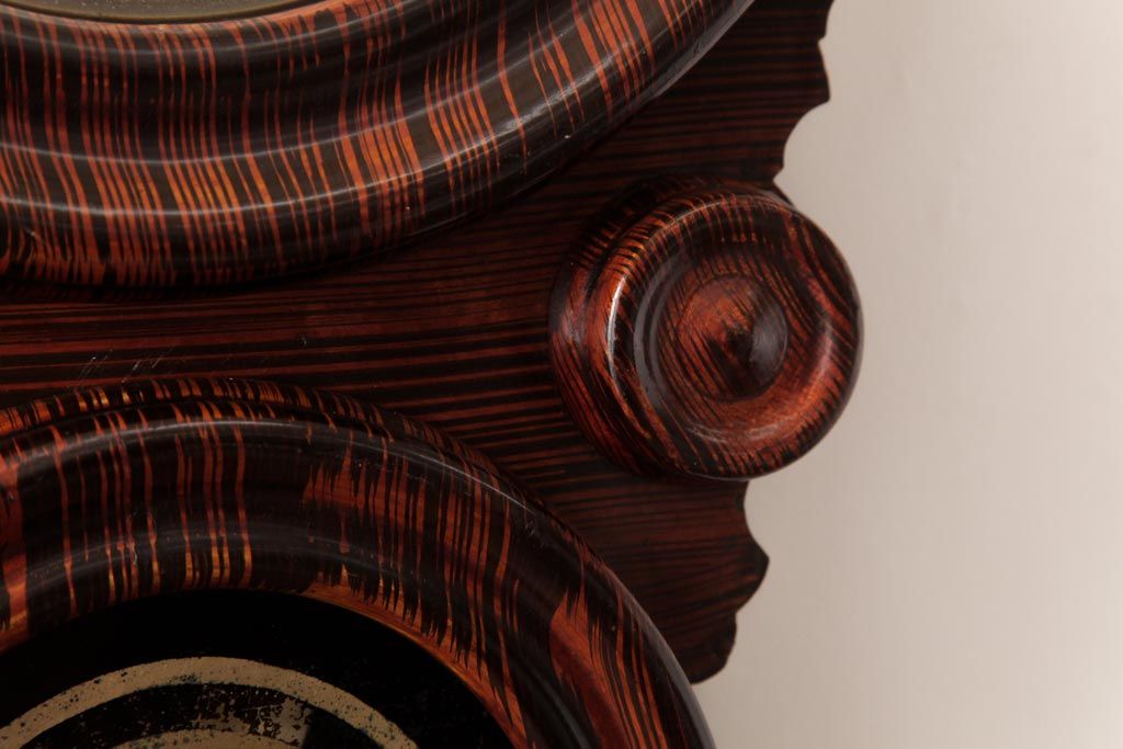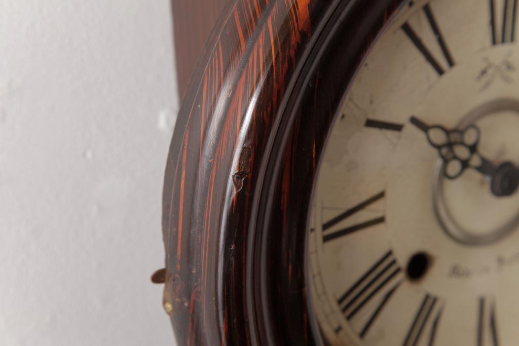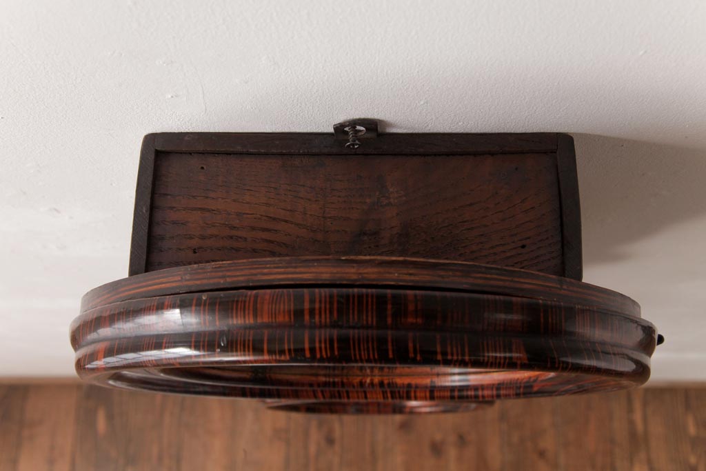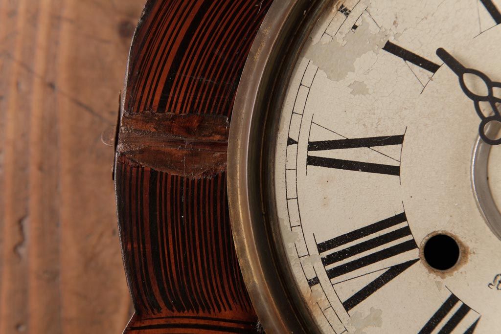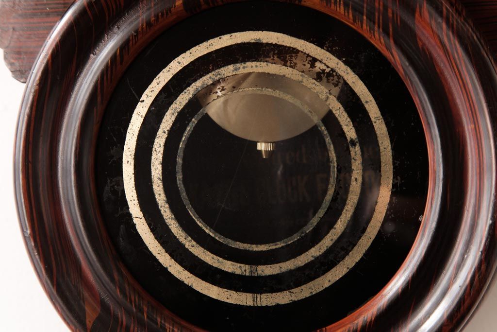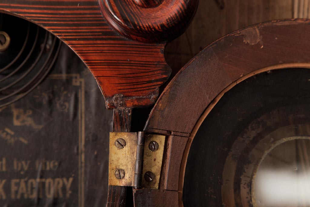 ムーブメントは新品の電池式に交換してあります。乾電池が付属します。振り子は飾りで、動きますが針と連動はしていません。