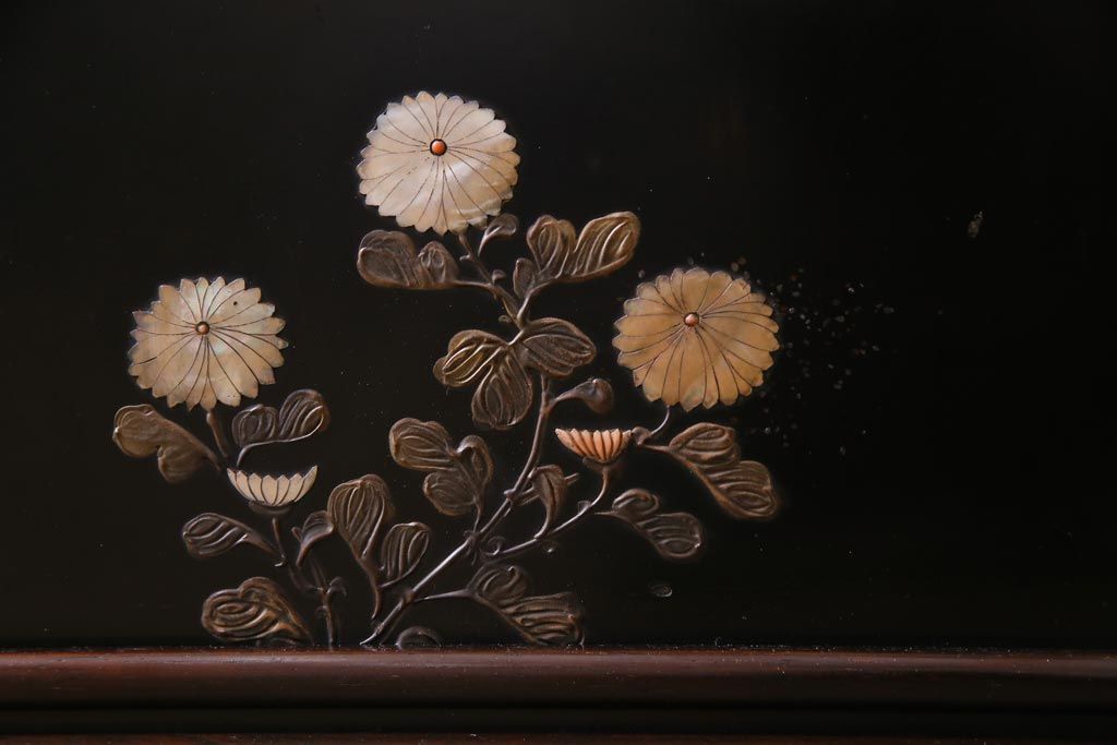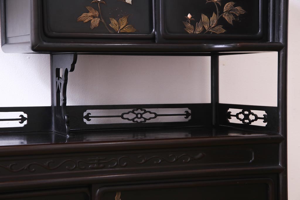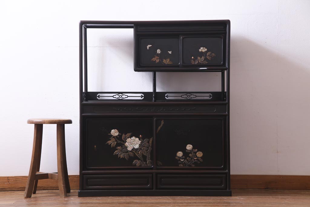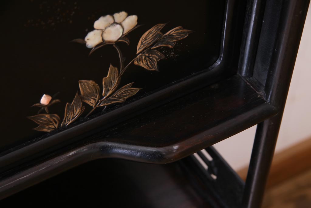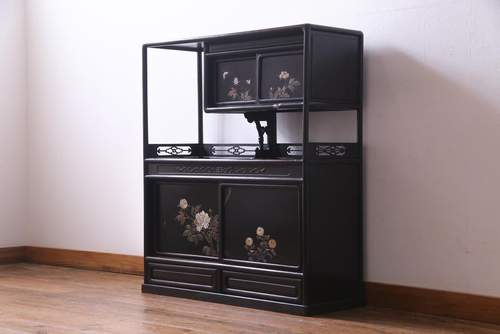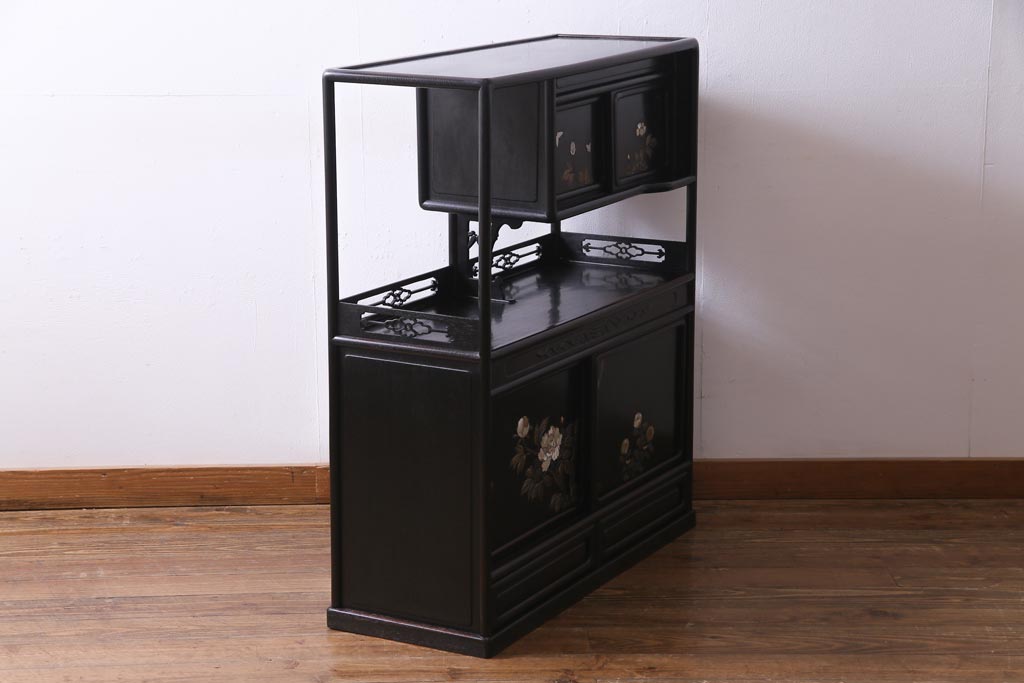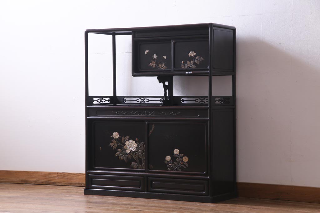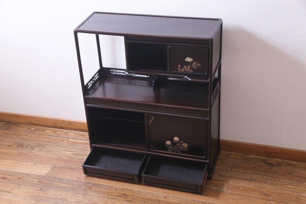 アンティーク家具 和製アンティーク 時代物 紫檀材 螺鈿と漆絵の花蝶図が品の良い茶棚(飾棚、飾り棚)