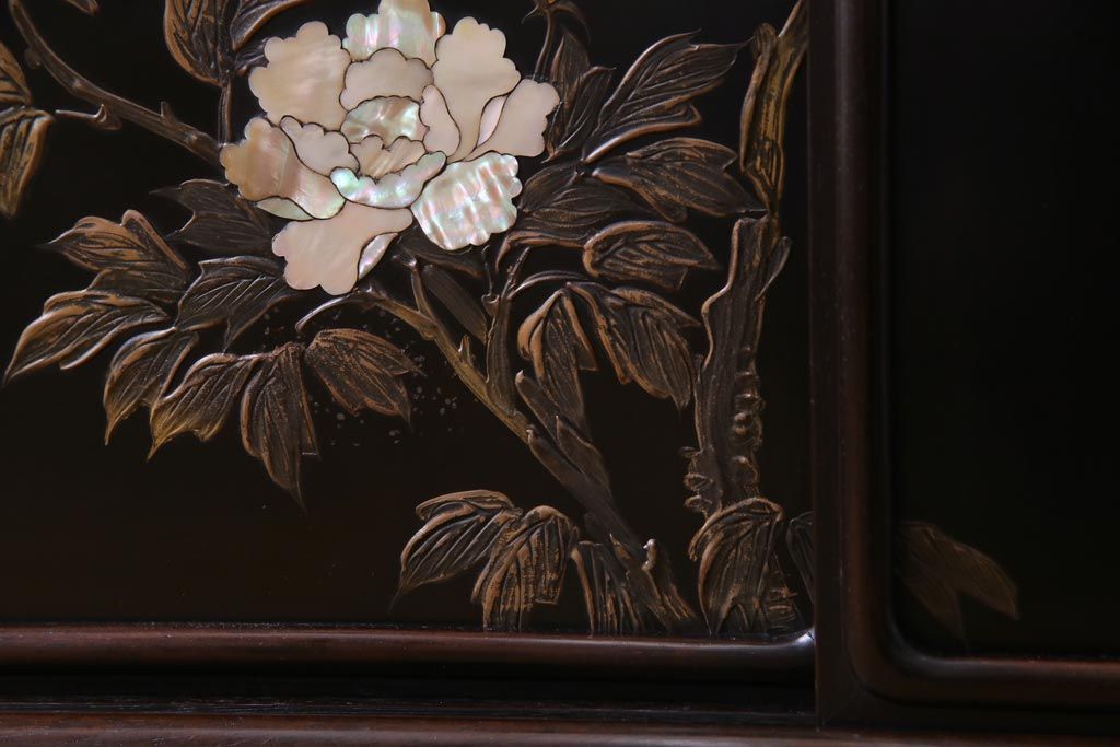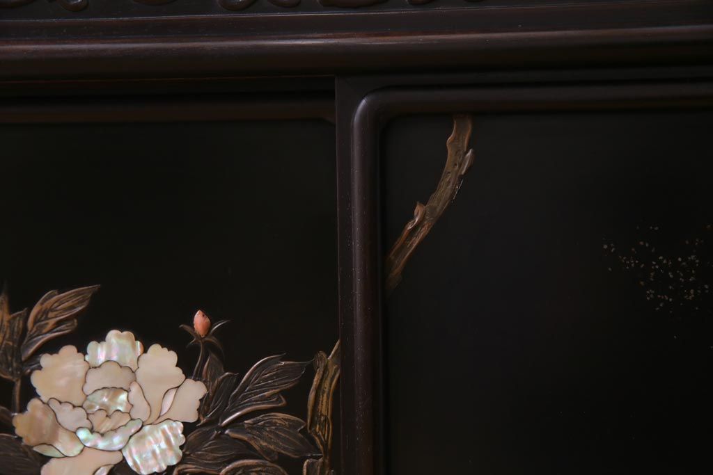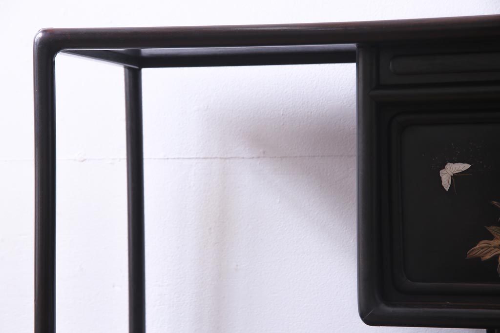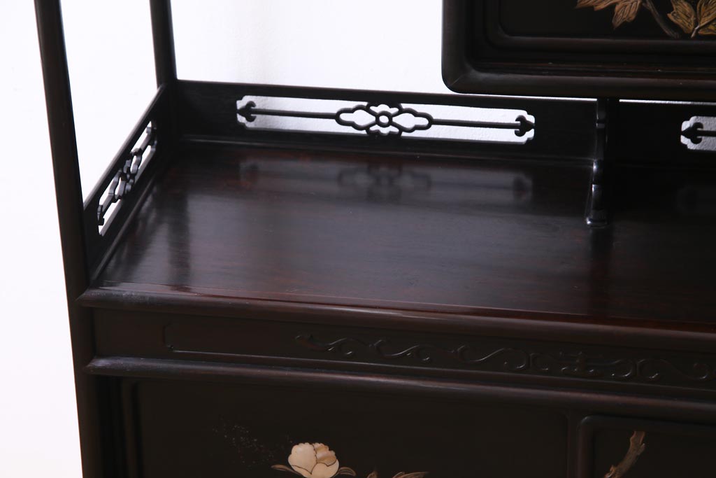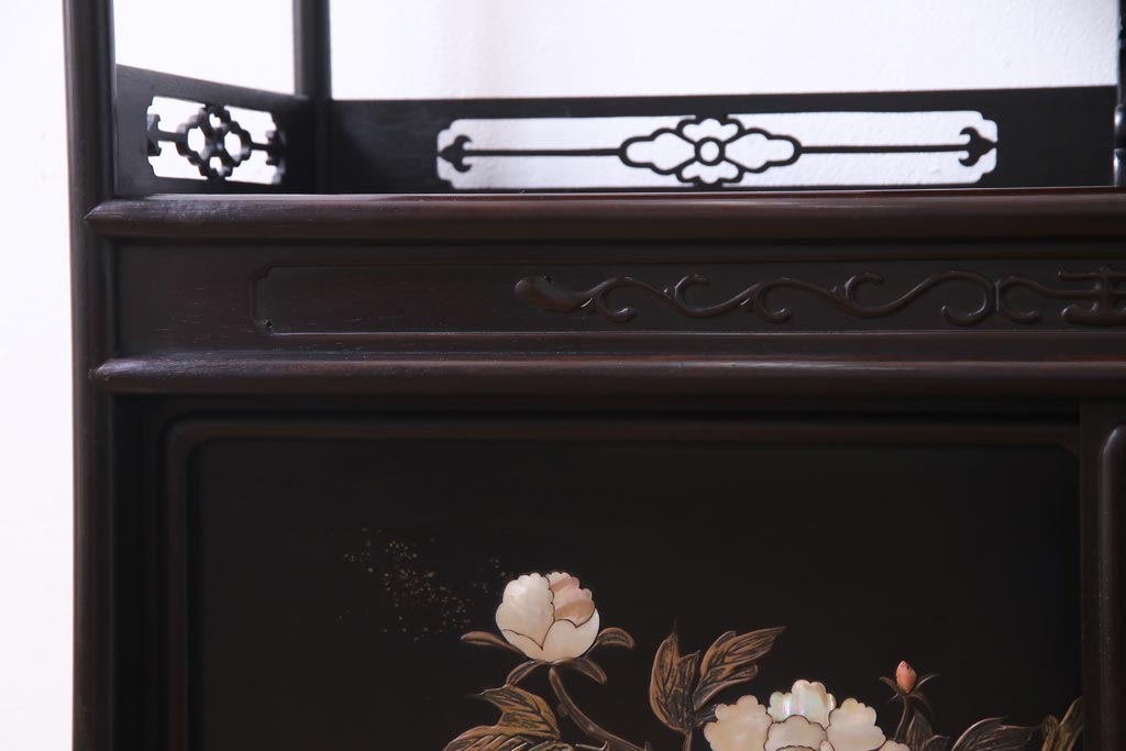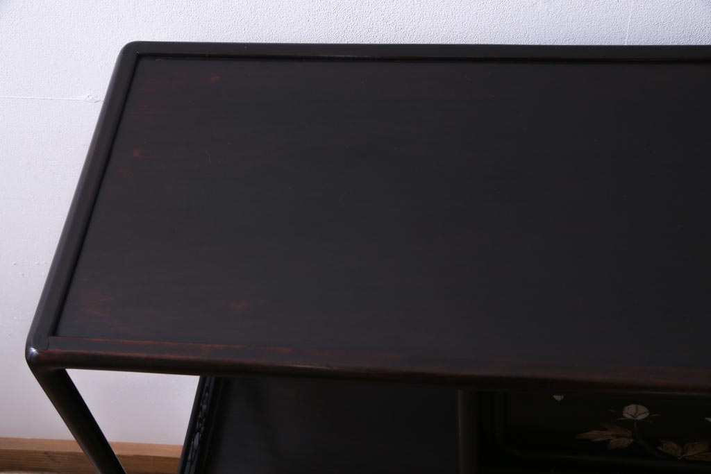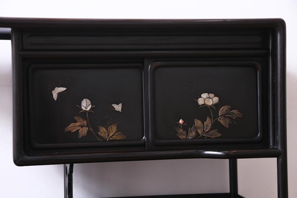 アンティーク家具 和製アンティーク 時代物 紫檀材 螺鈿と漆絵の花蝶図が品の良い茶棚(飾棚、飾り棚)