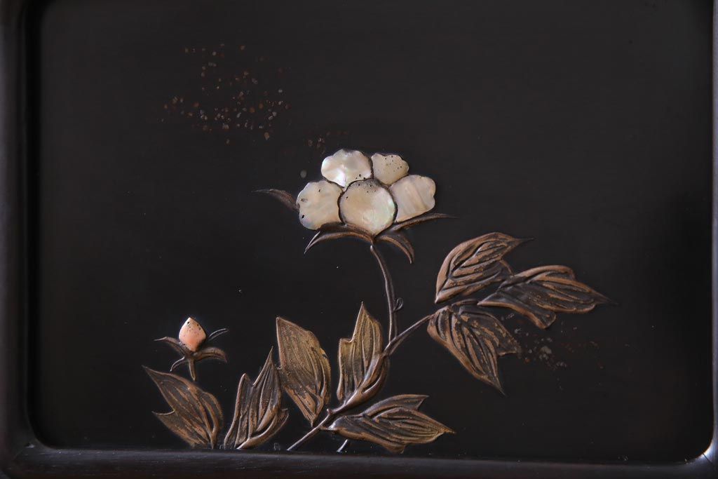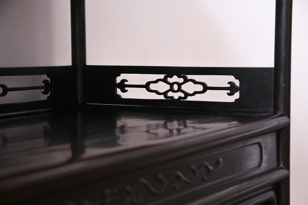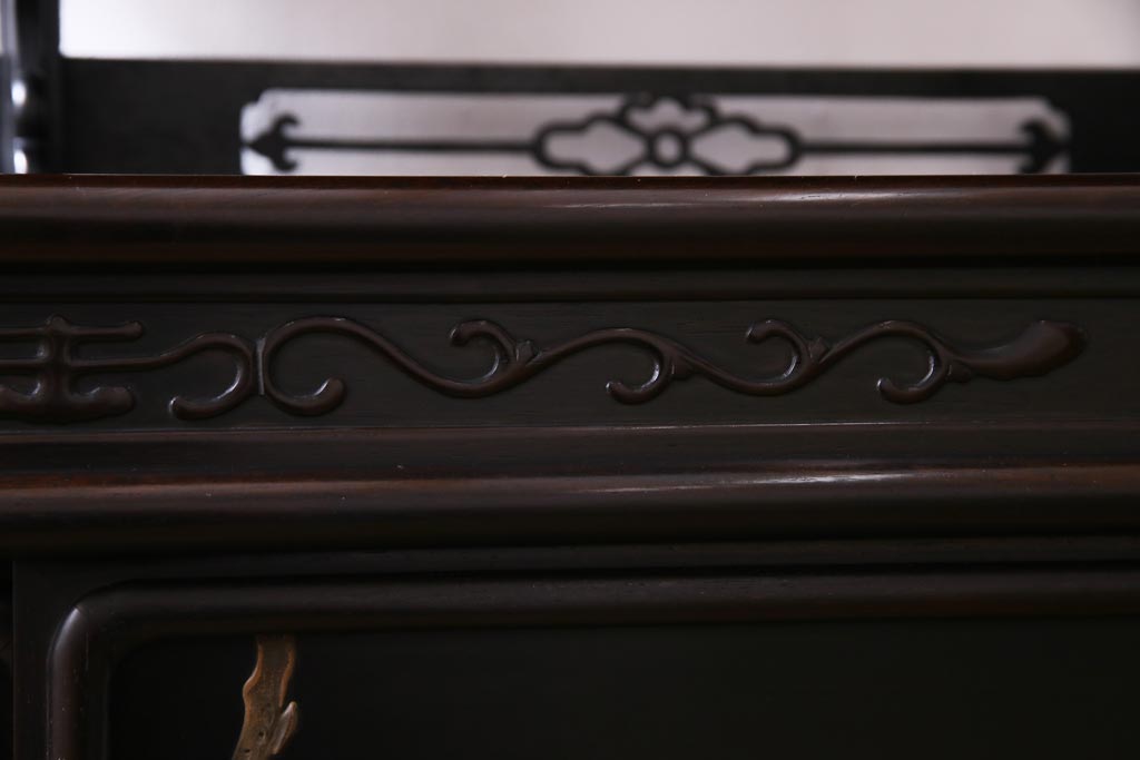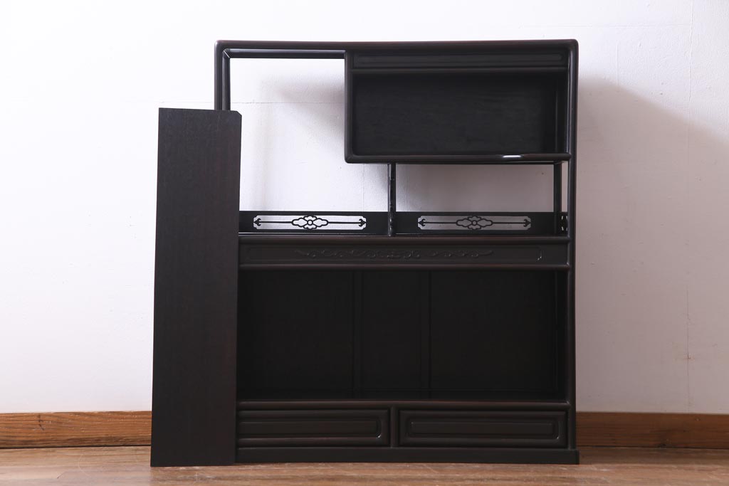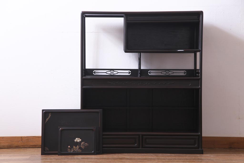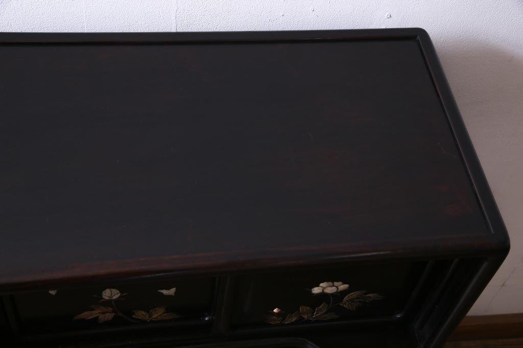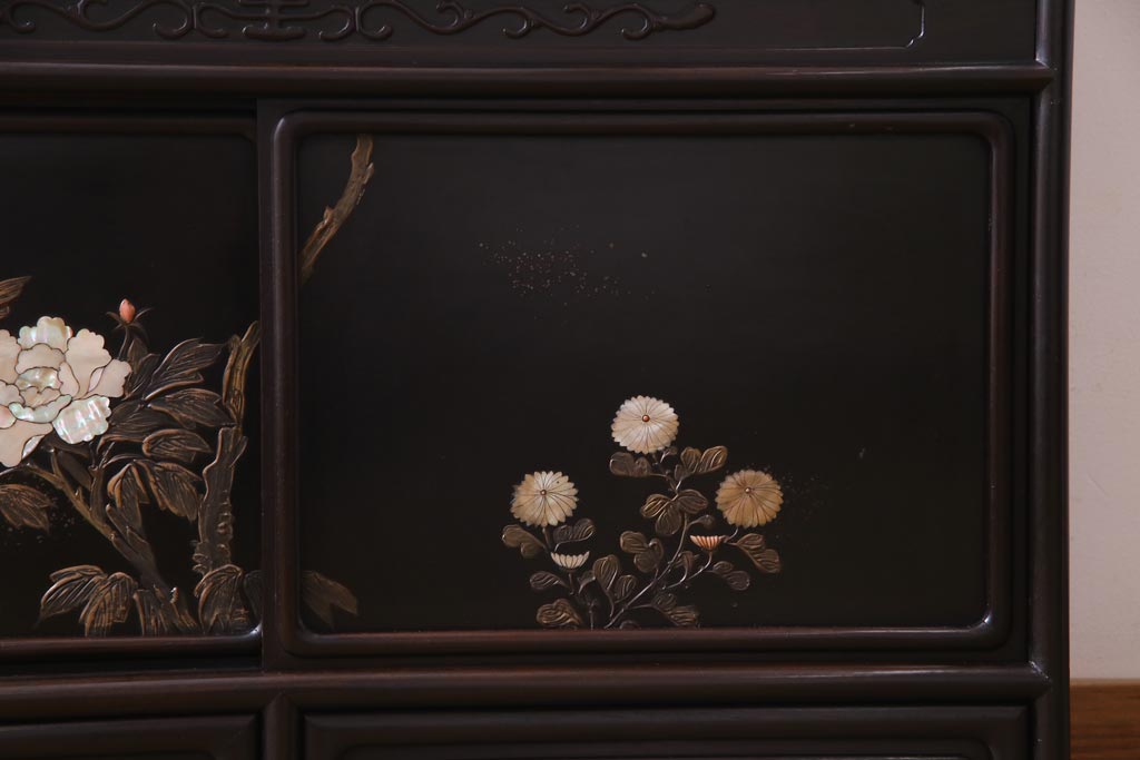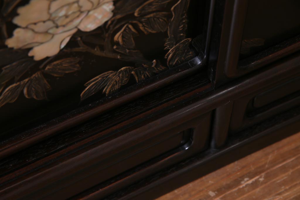 アンティーク家具 和製アンティーク 時代物 紫檀材 螺鈿と漆絵の花蝶図が品の良い茶棚(飾棚、飾り棚)