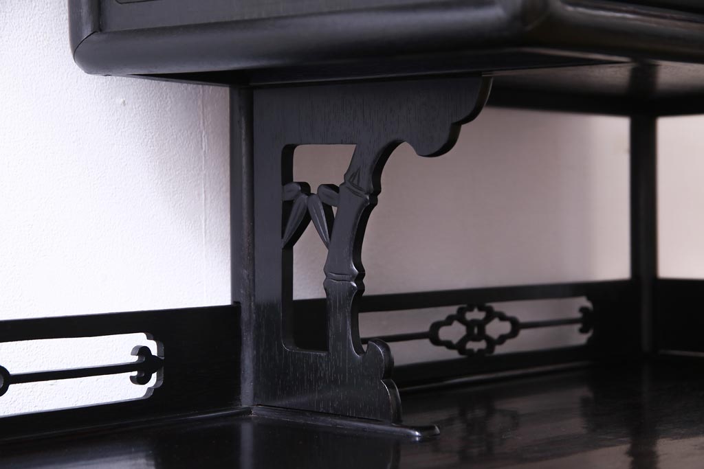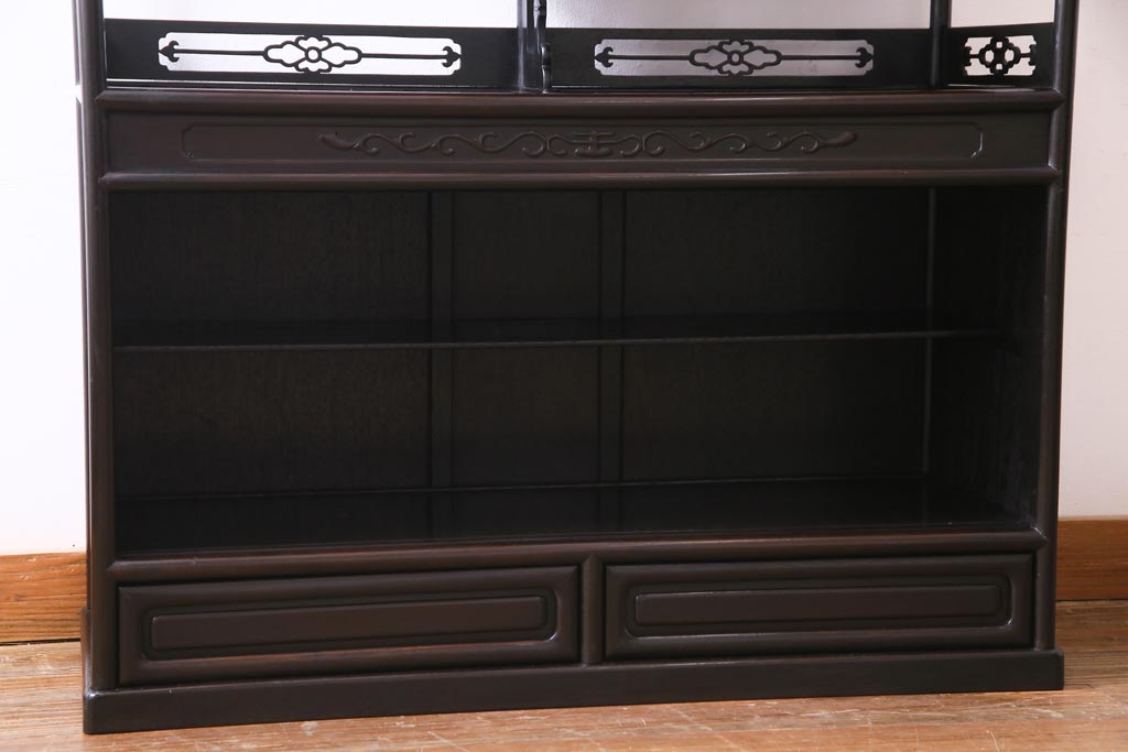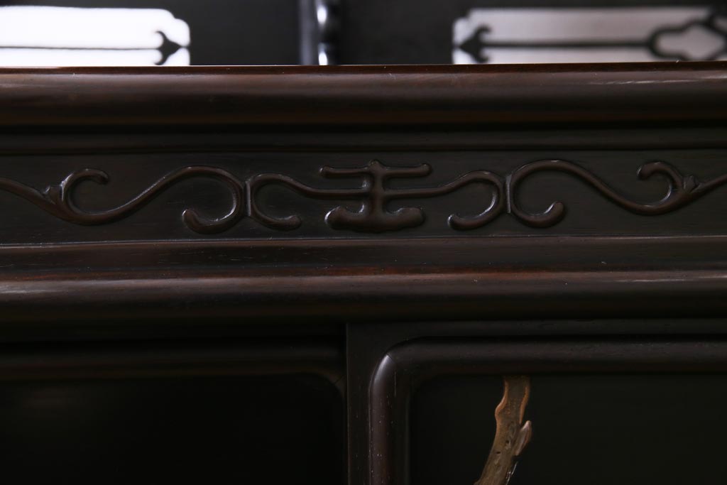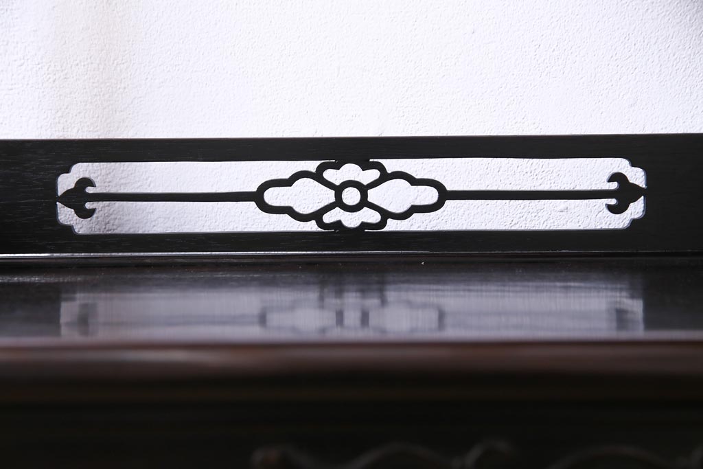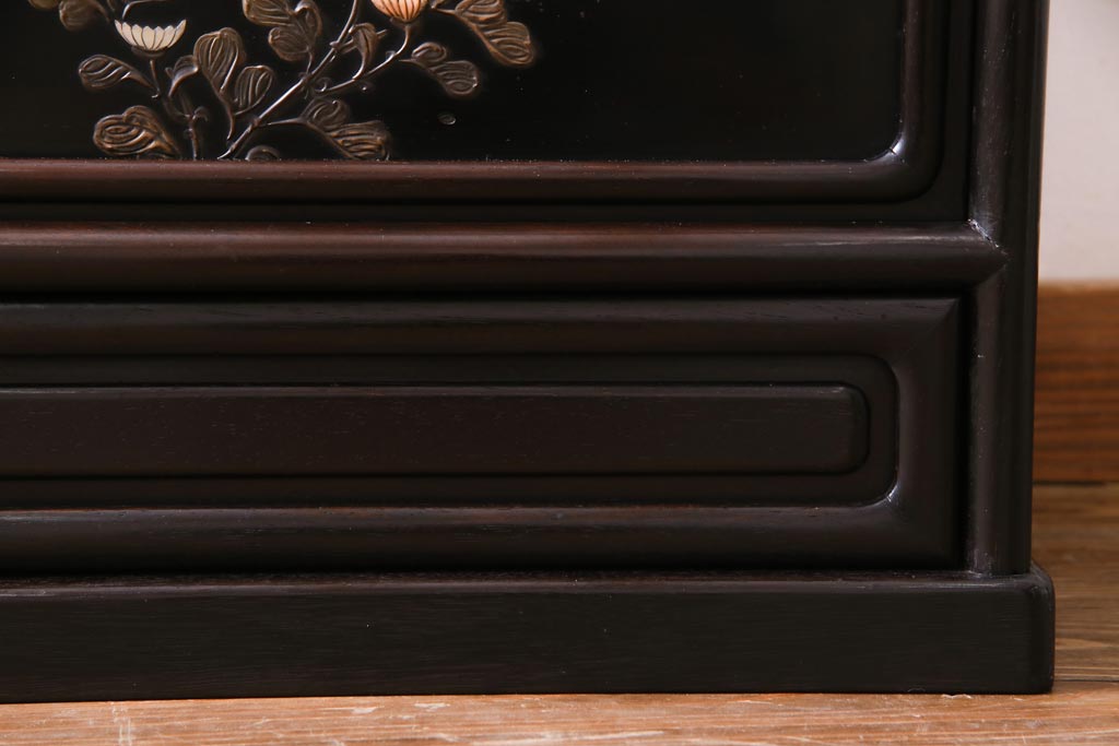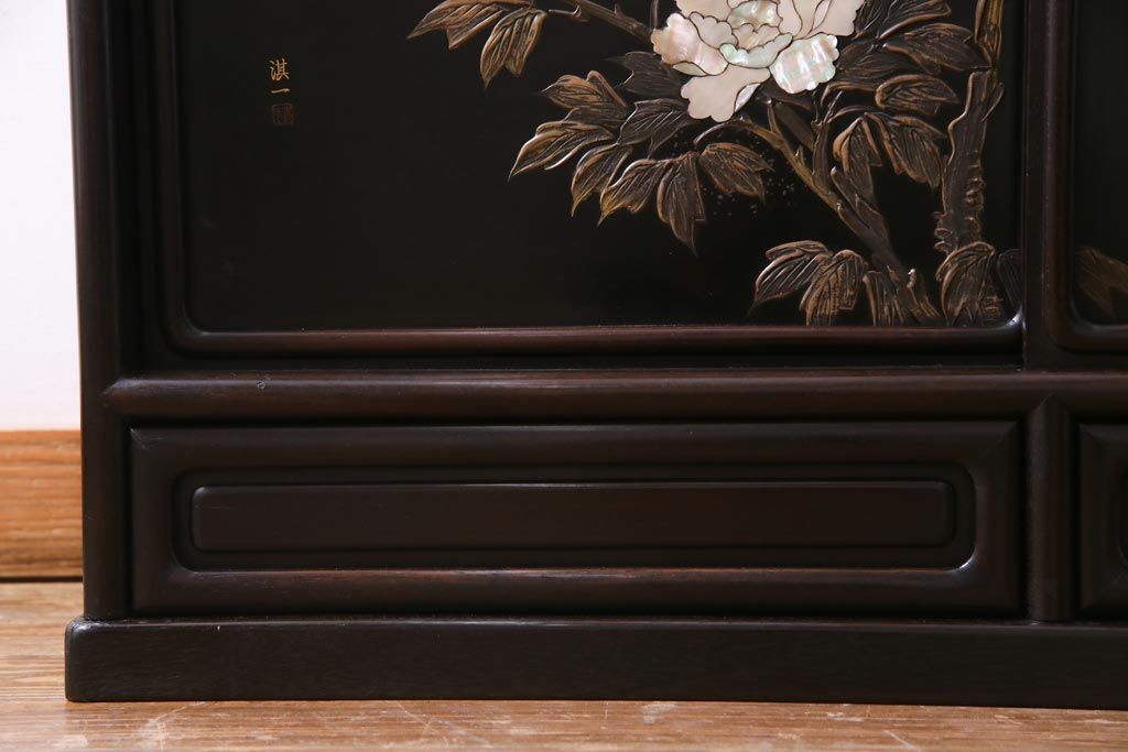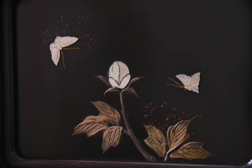 アンティーク家具 和製アンティーク 時代物 紫檀材 螺鈿と漆絵の花蝶図が品の良い茶棚(飾棚、飾り棚)