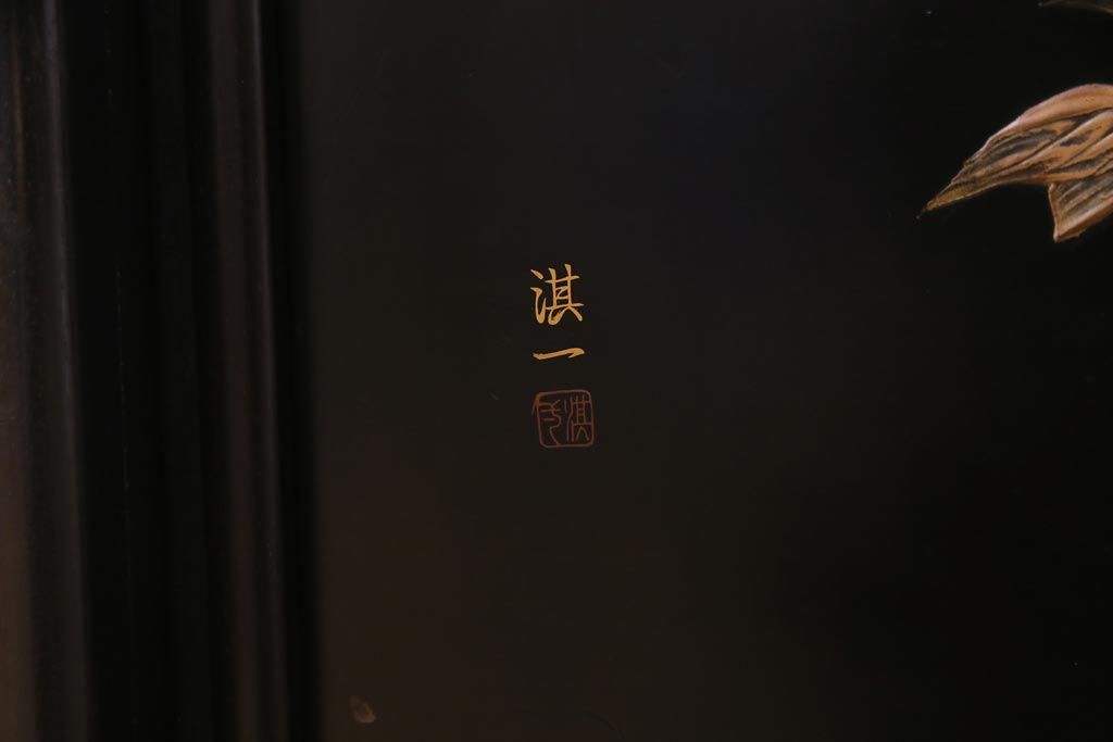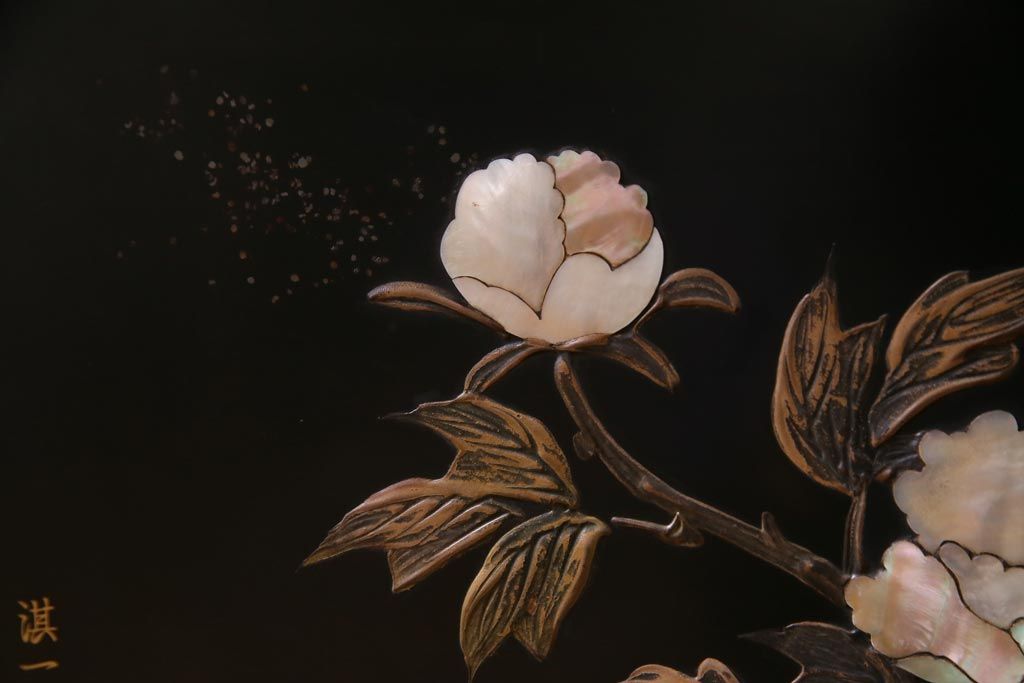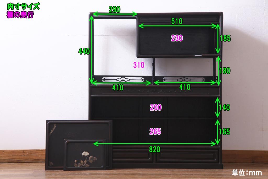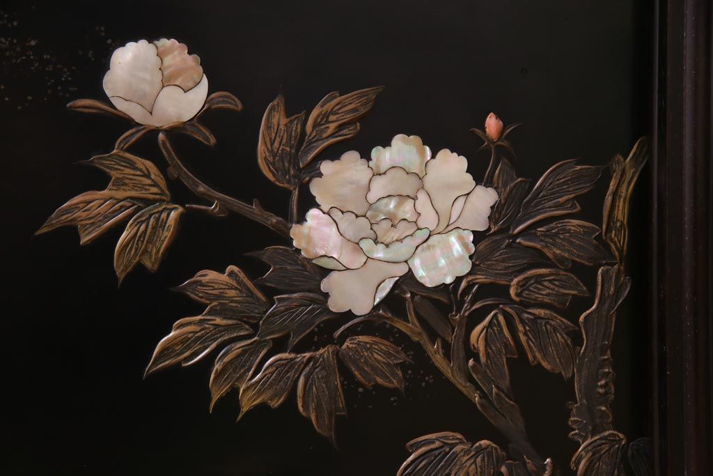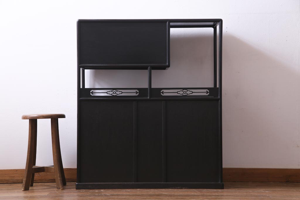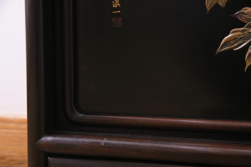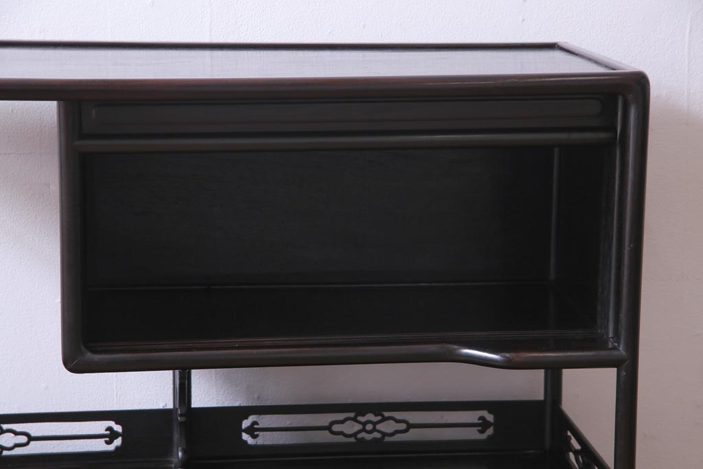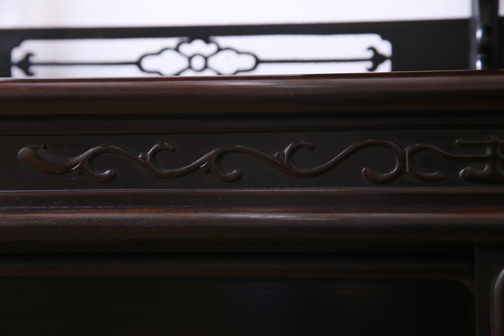アンティーク家具 和製アンティーク 時代物 紫檀材 螺鈿と漆絵の花蝶図が品の良い茶棚(飾棚、飾り棚)