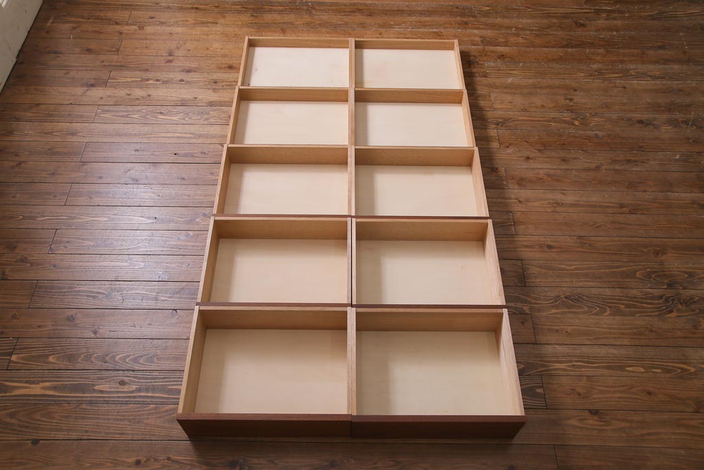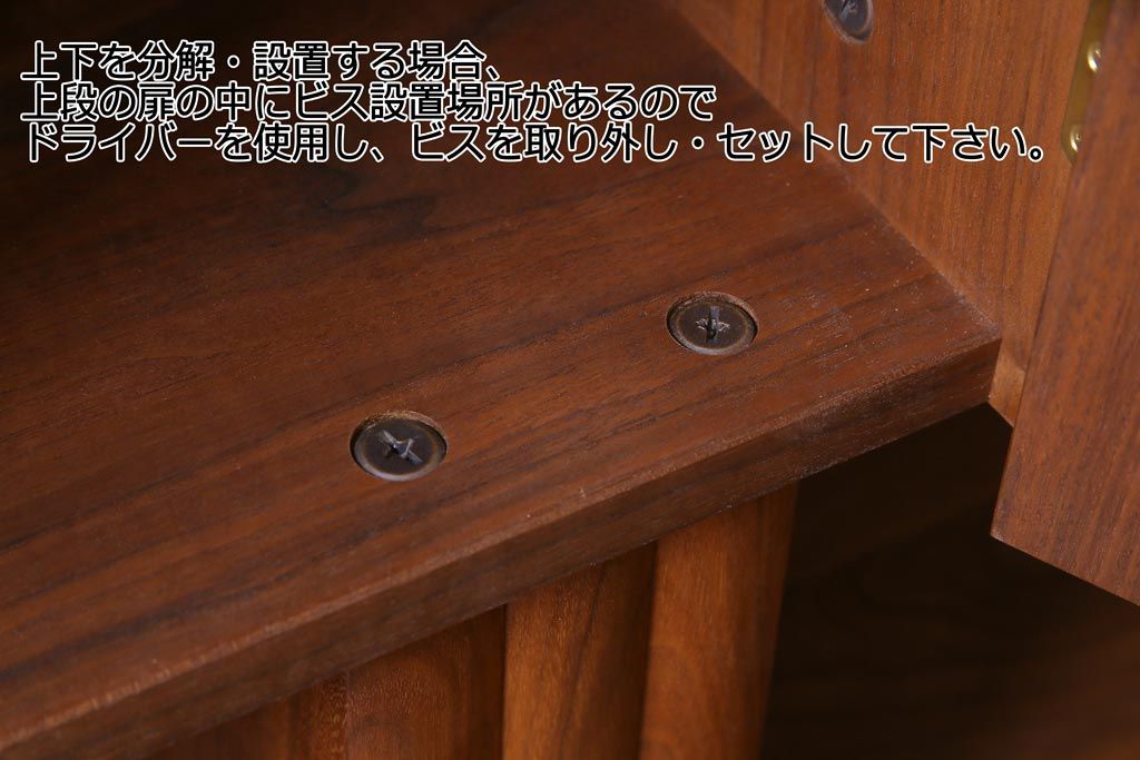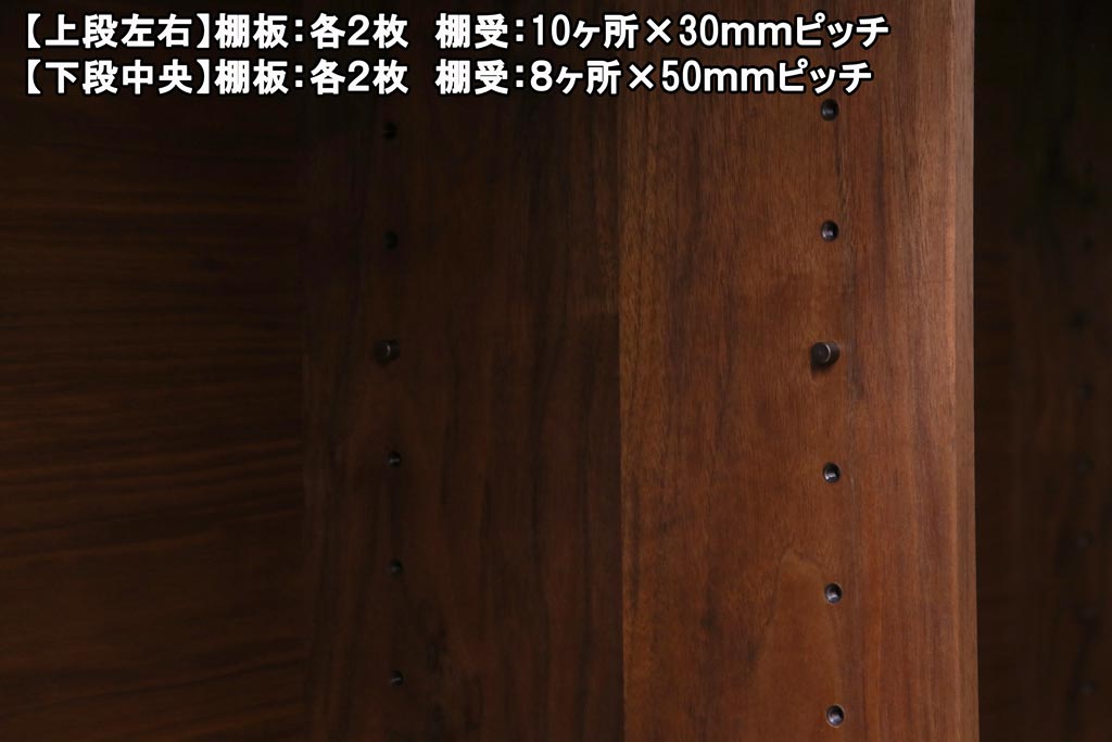 棚板は一部取り外しできます。上段左右各2枚、下段各2枚あります。棚受けは上段10ヶ所・30mmピッチ、下段8ヶ所50mmピッチで調整できます。棚板は取り外しできます。