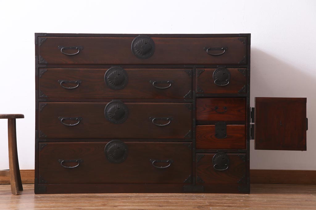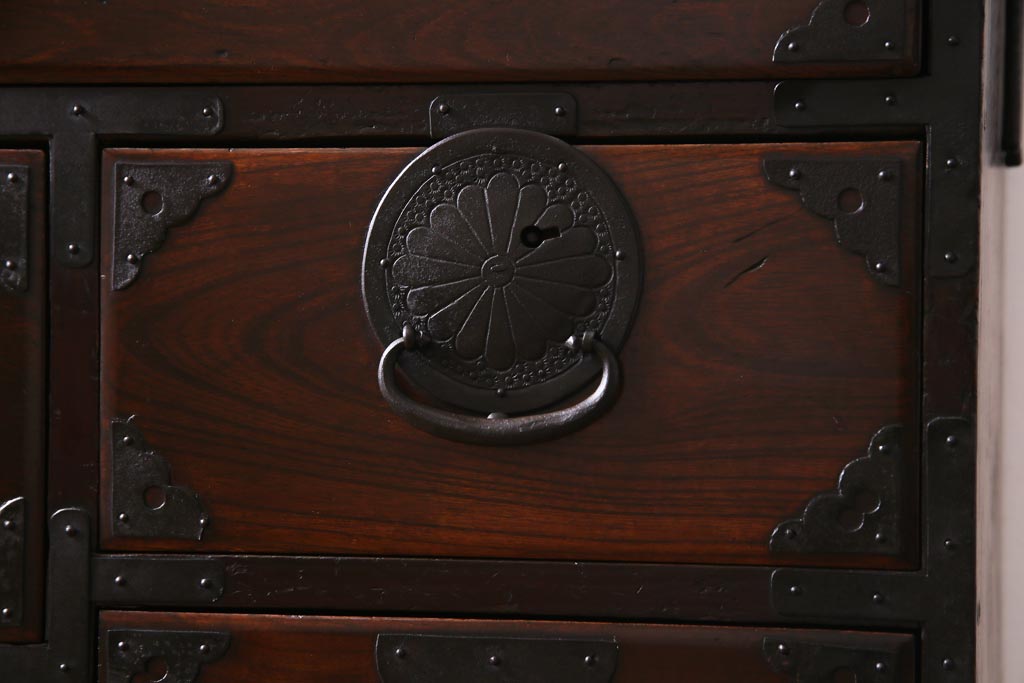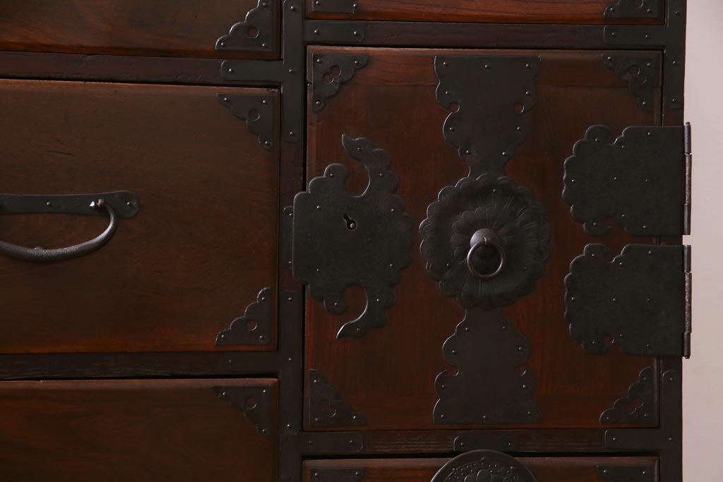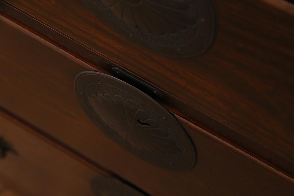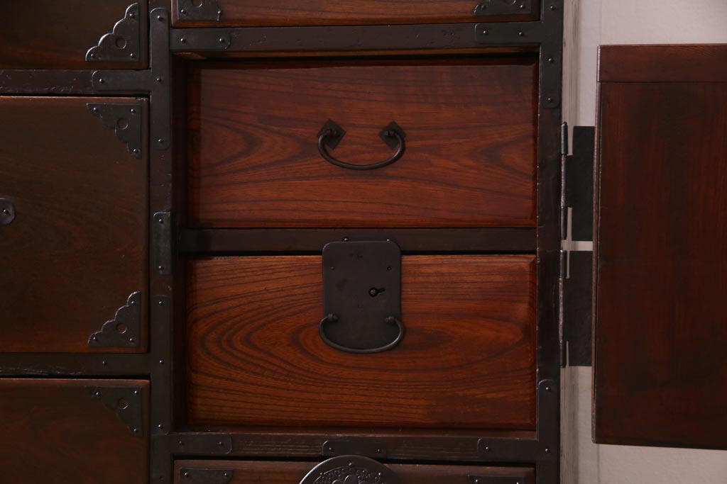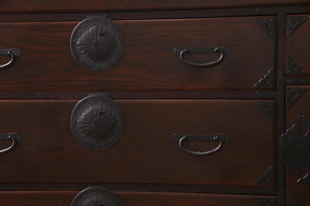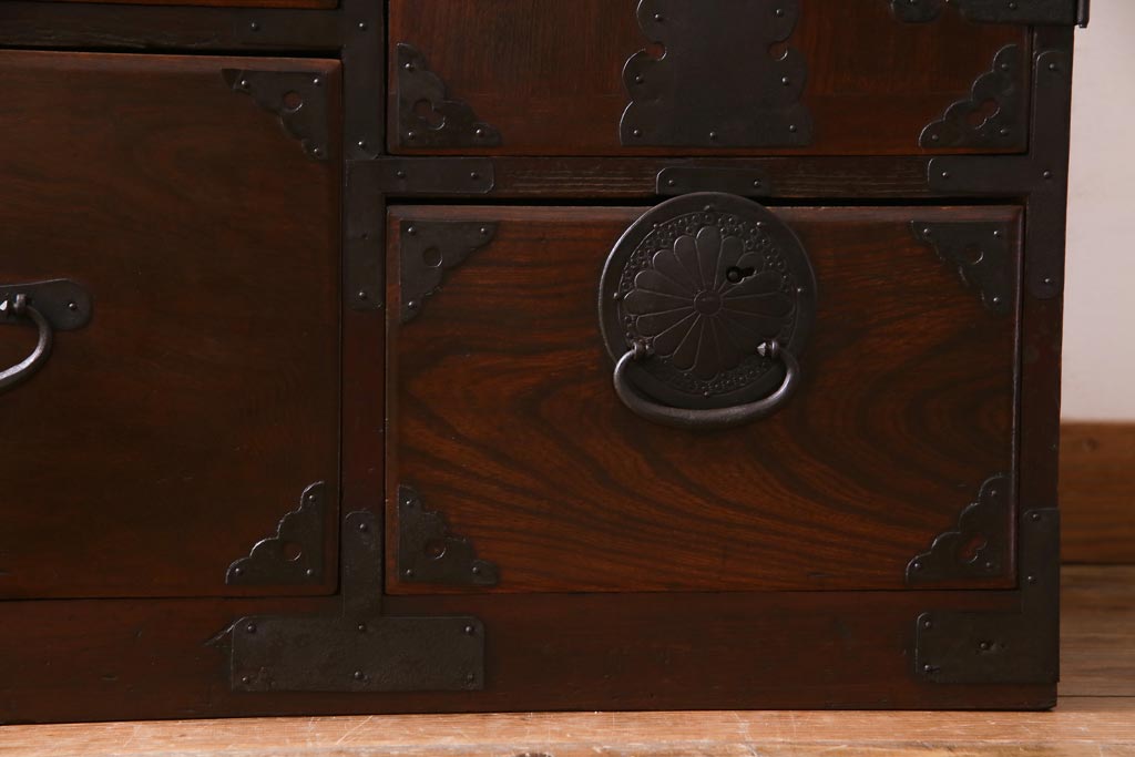 アンティーク家具 和製アンティーク 前面ケヤキ材 立体的な意匠が目を引く仙台箪笥(野郎箪笥、衣装箪笥、和タンス、引き出し)