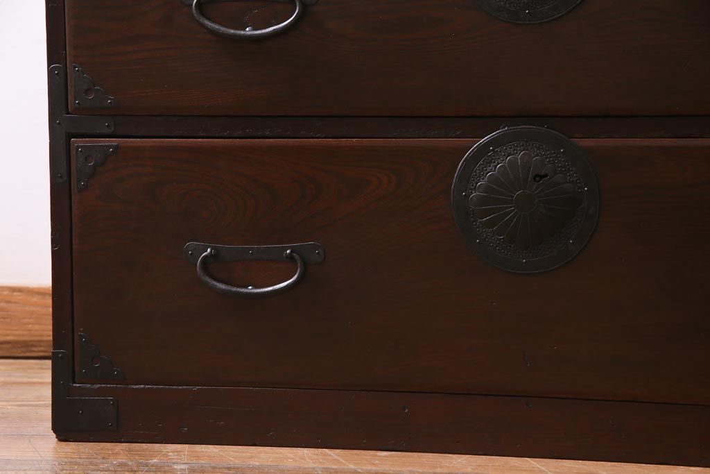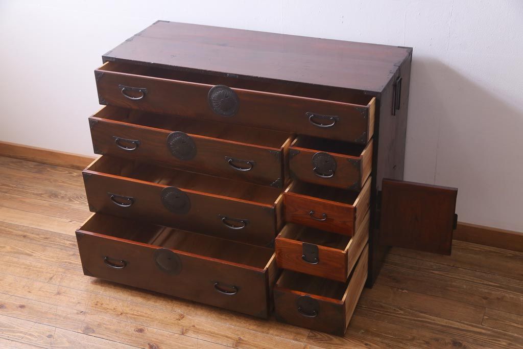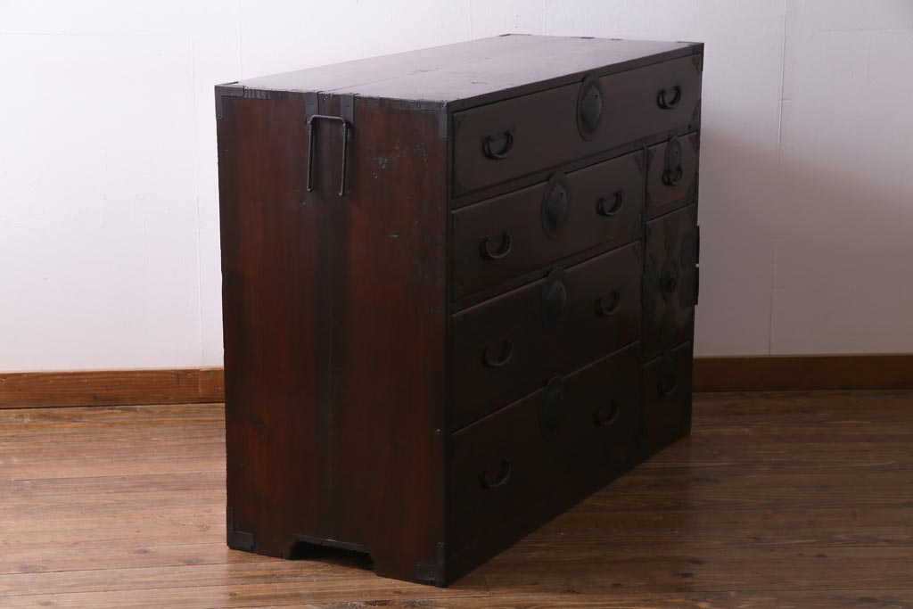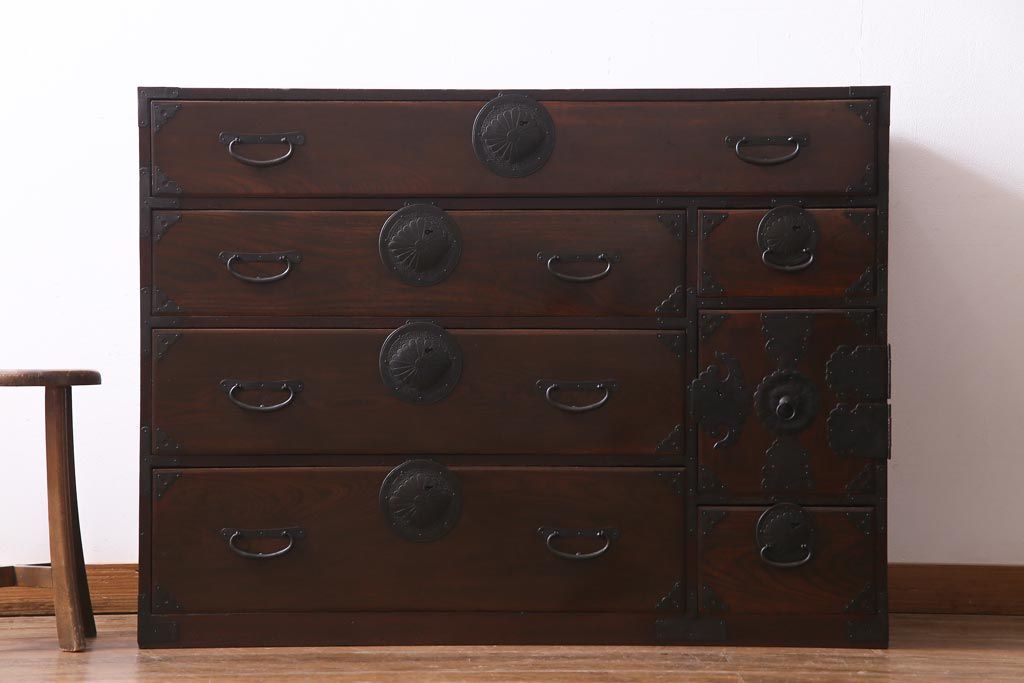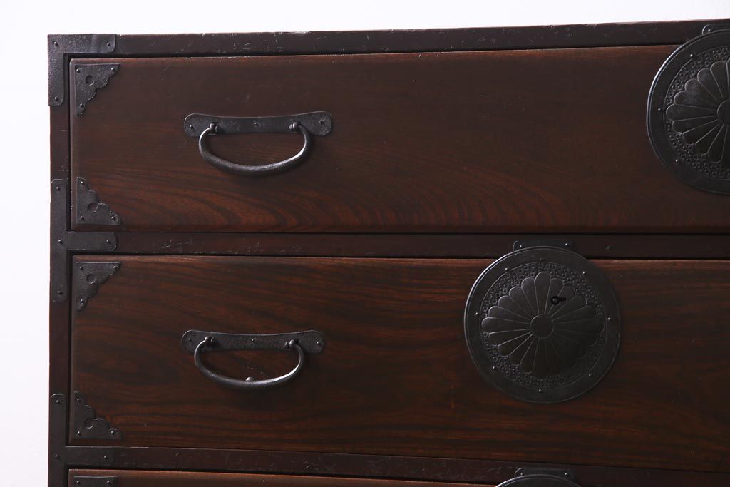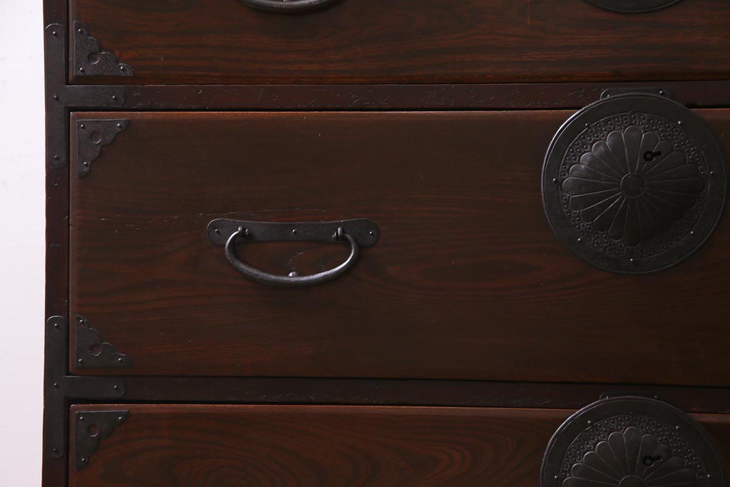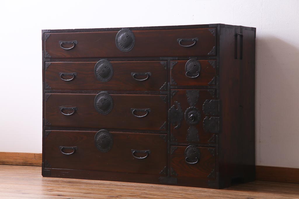 アンティーク家具 和製アンティーク 前面ケヤキ材 立体的な意匠が目を引く仙台箪笥(野郎箪笥、衣装箪笥、和タンス、引き出し)