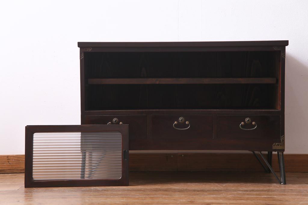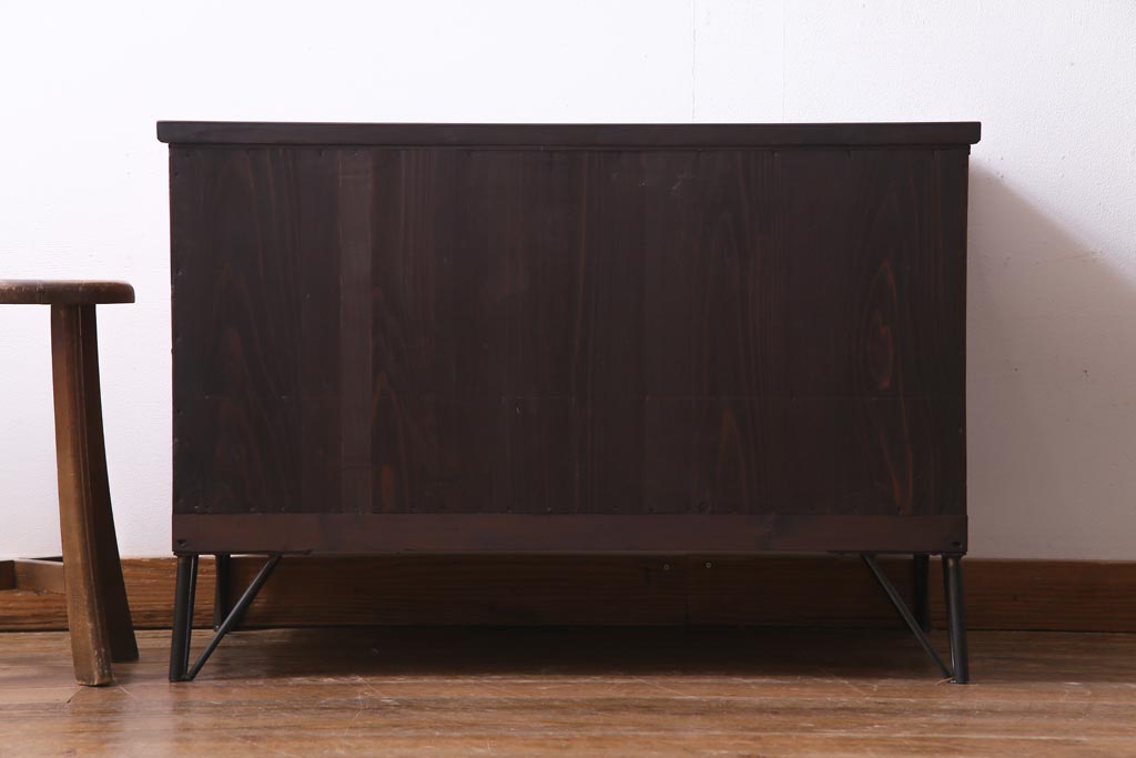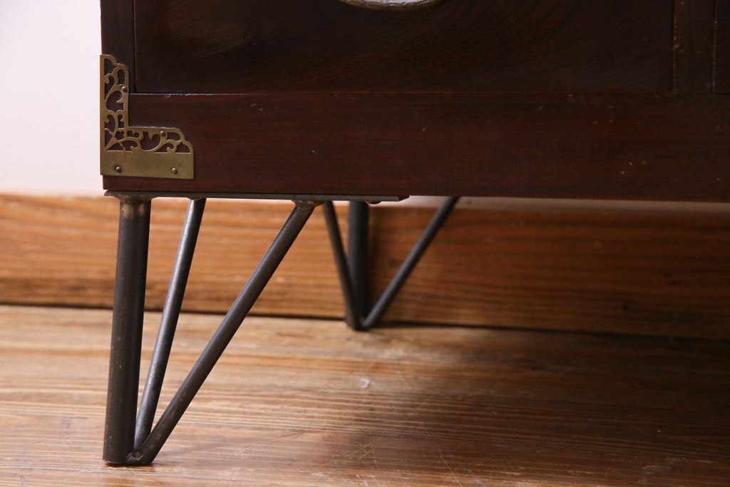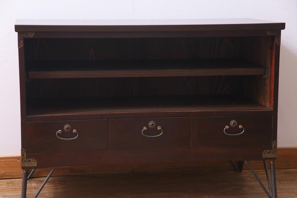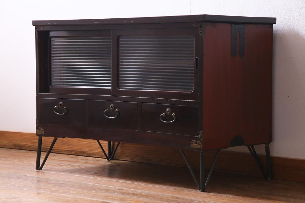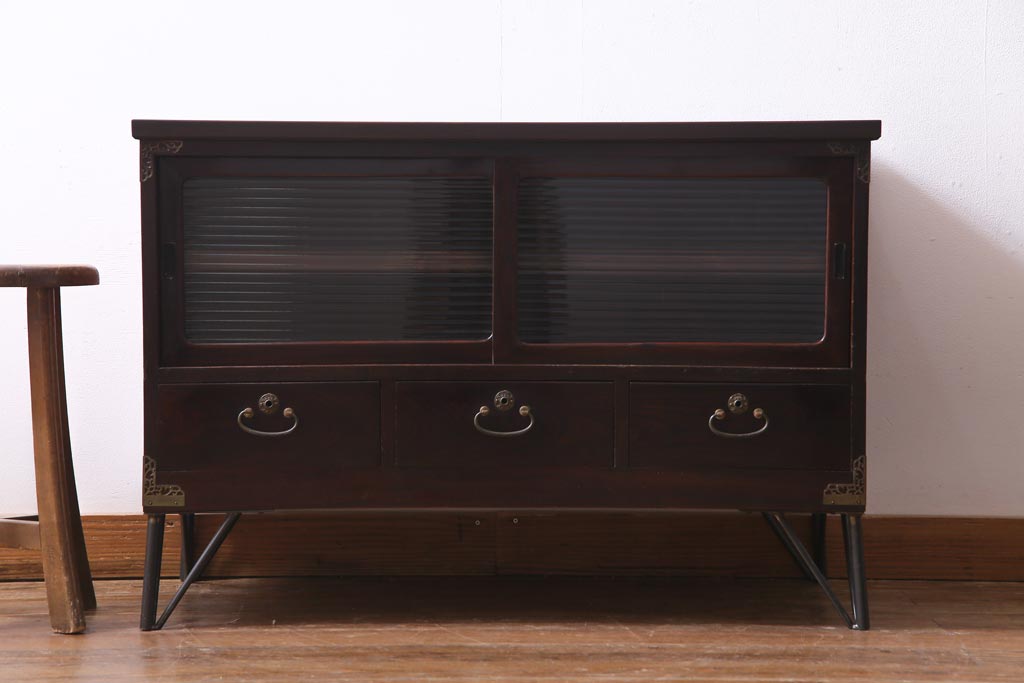 アンティーク家具 昭和初期 鉄脚付リメイク 前面ケヤキ材 漆塗りの光沢が目を引くリビングボード(テレビ台、戸棚、アンティークチェスト)