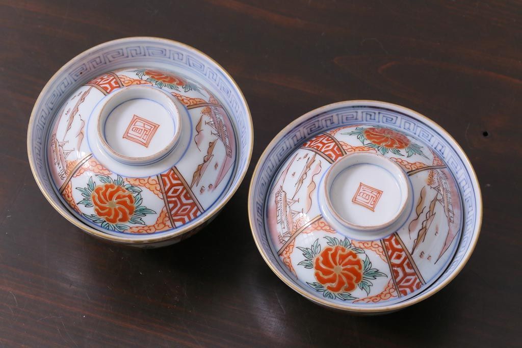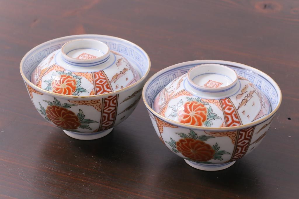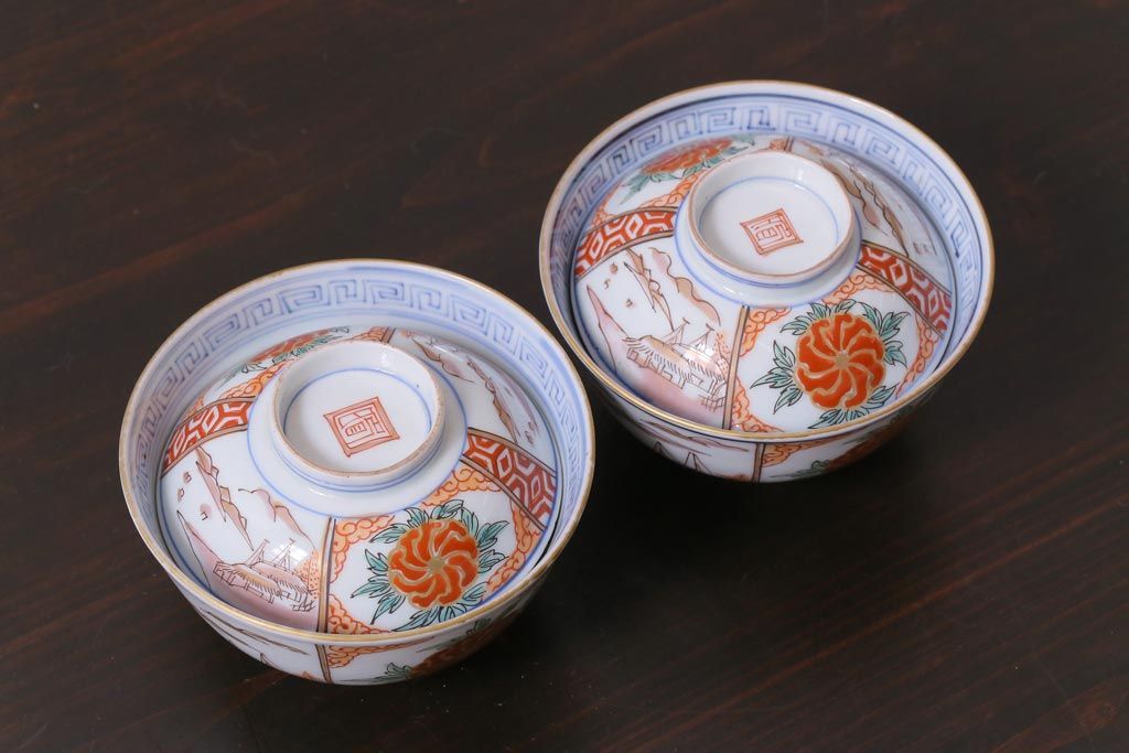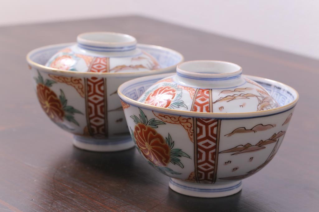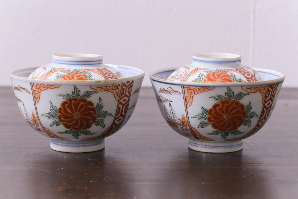 ラフジュ工房> 和食器・茶道具> お椀・茶碗 > 和製アンティーク 古伊万里 江戸期 華やかな色絵染付の蓋つき茶碗2客セット(和食器)