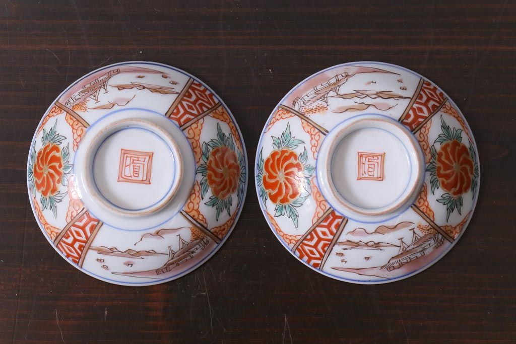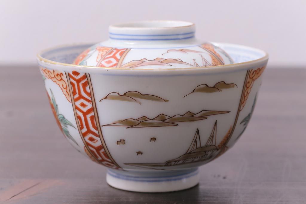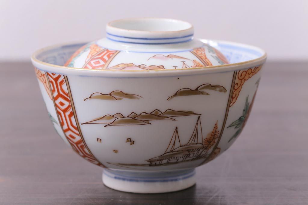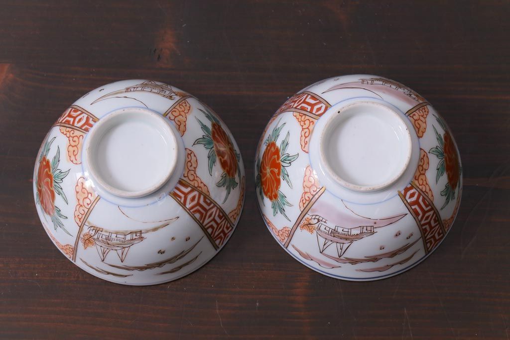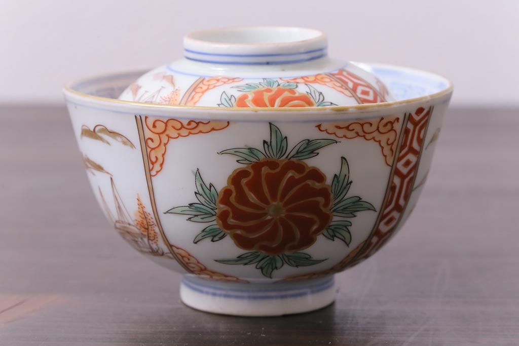 ラフジュ工房> 骨董・美術品> 骨董-陶磁器 > 和製アンティーク 古伊万里 江戸期 華やかな色絵染付の蓋つき茶碗2客セット(和食器)