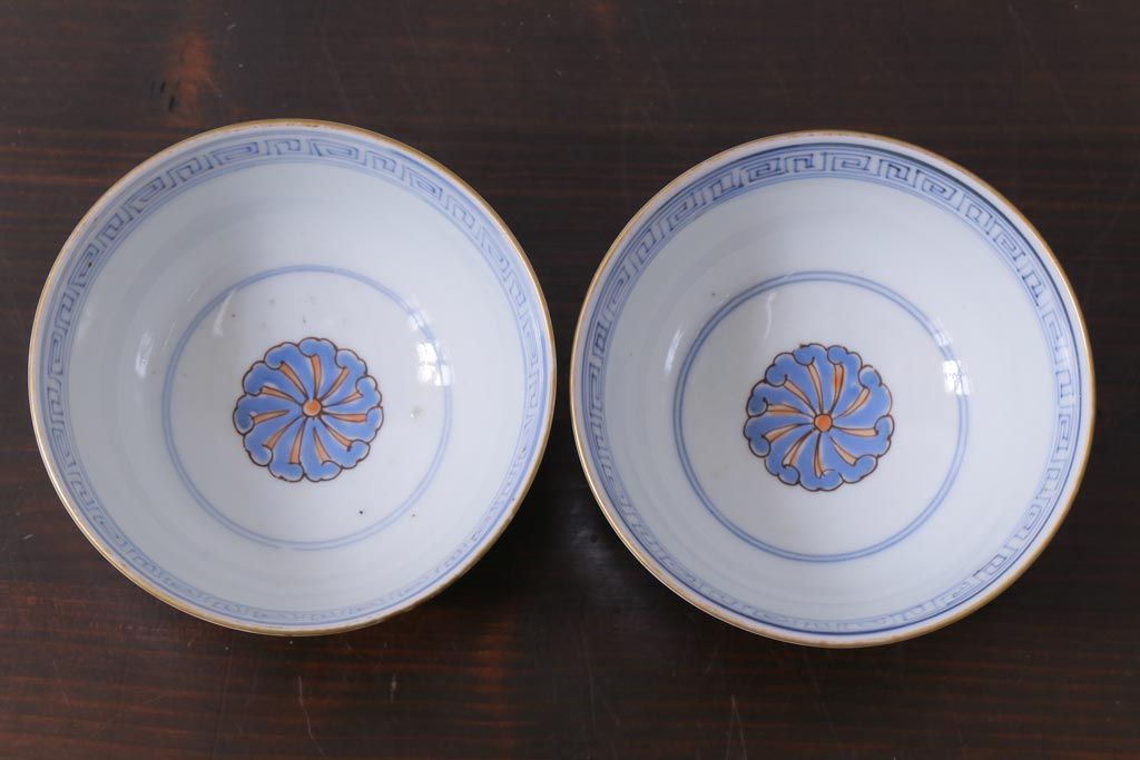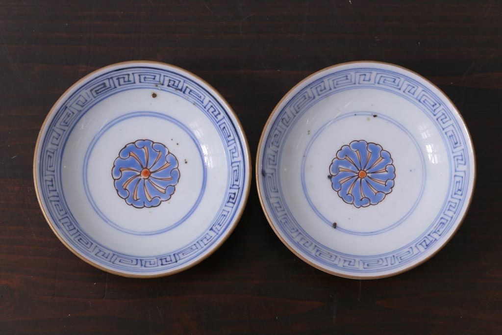 和製アンティーク 古伊万里 江戸期 華やかな色絵染付の蓋つき茶碗2客セット(和食器)