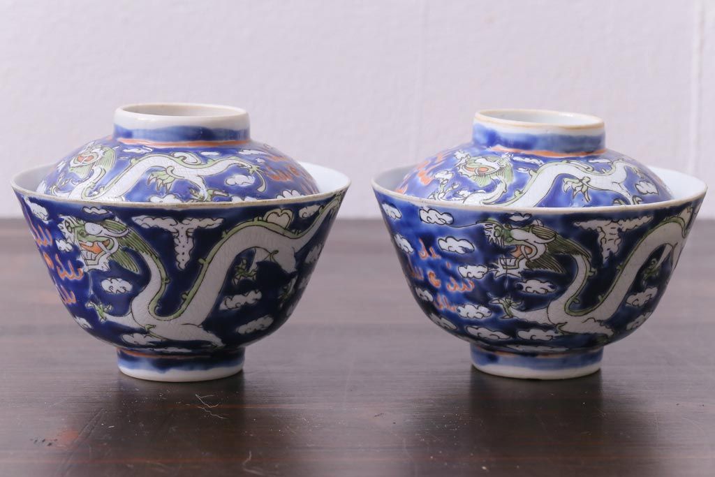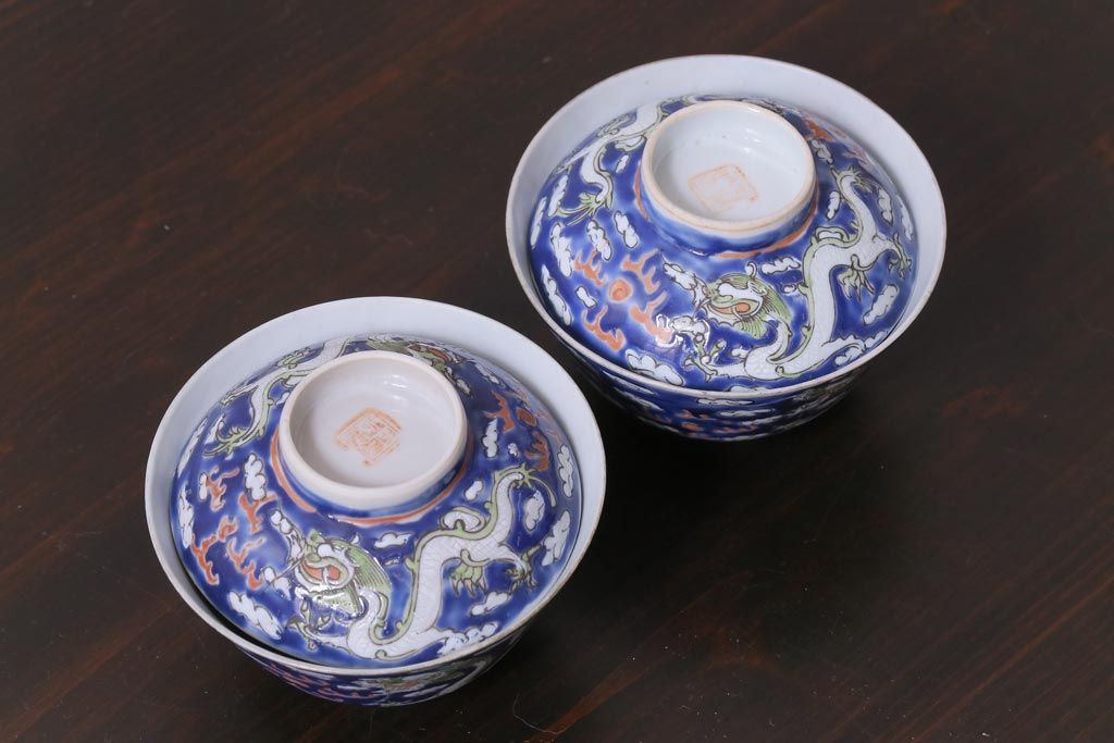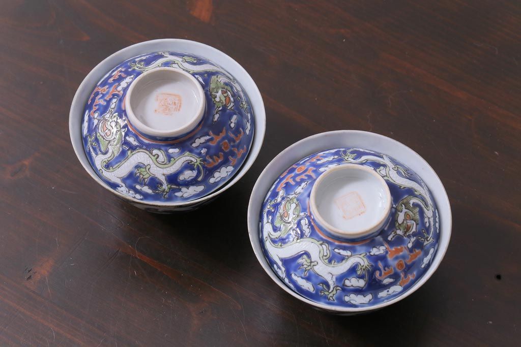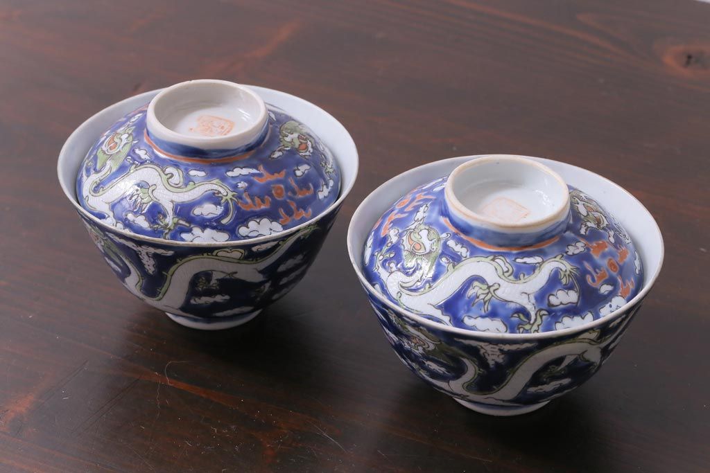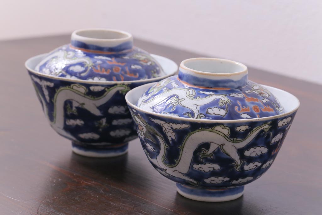 ラフジュ工房> 骨董・美術品 > 古民具・骨董 龍の図 色絵 独特な絵柄の蓋付き茶碗2客セット(和食器)(3)