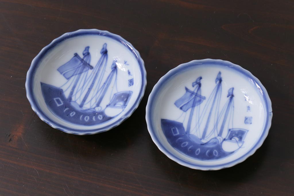 ラフジュ工房> 和食器・茶道具> 皿 > 骨董 江戸期 古伊万里 船の図 染付 3.3寸小皿2枚セット(和食器)