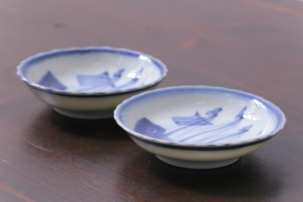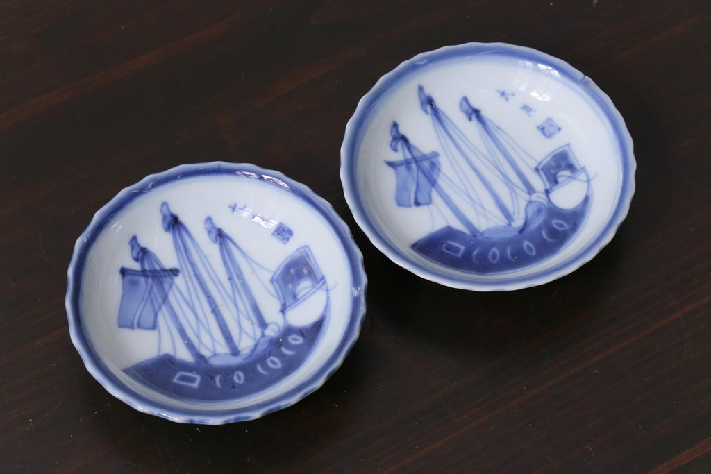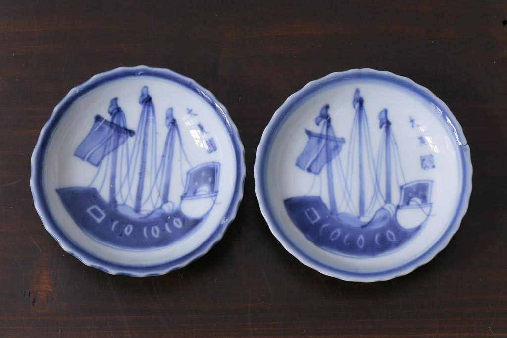 ラフジュ工房> 和食器・茶道具 > 骨董 江戸期 古伊万里 船の図 染付 3.3寸小皿2枚セット(和食器)