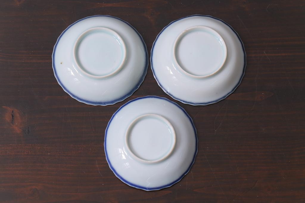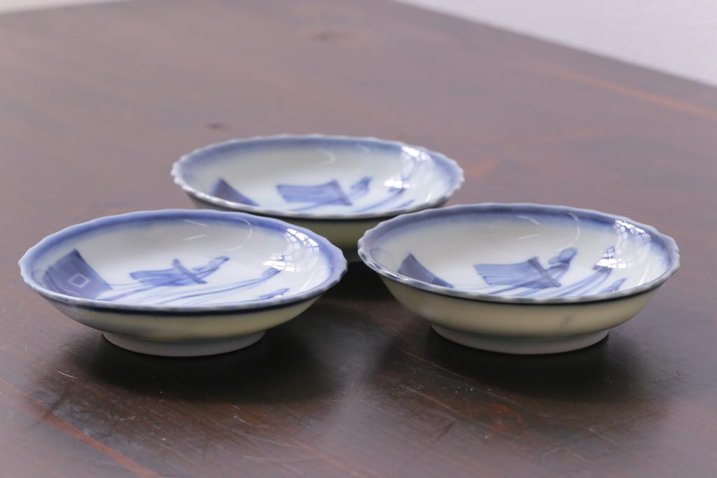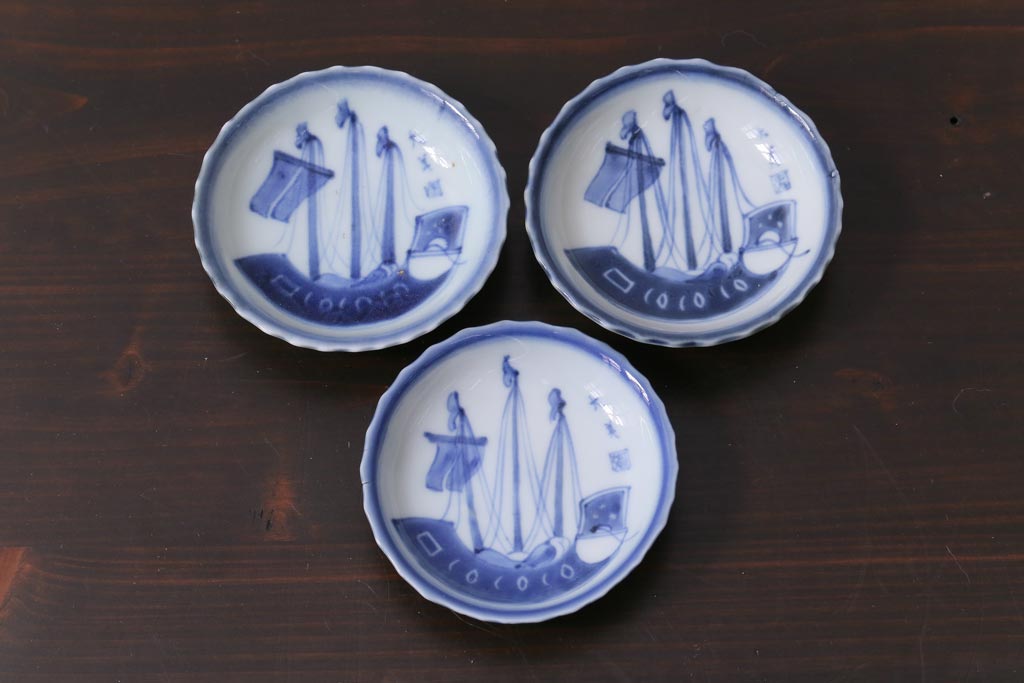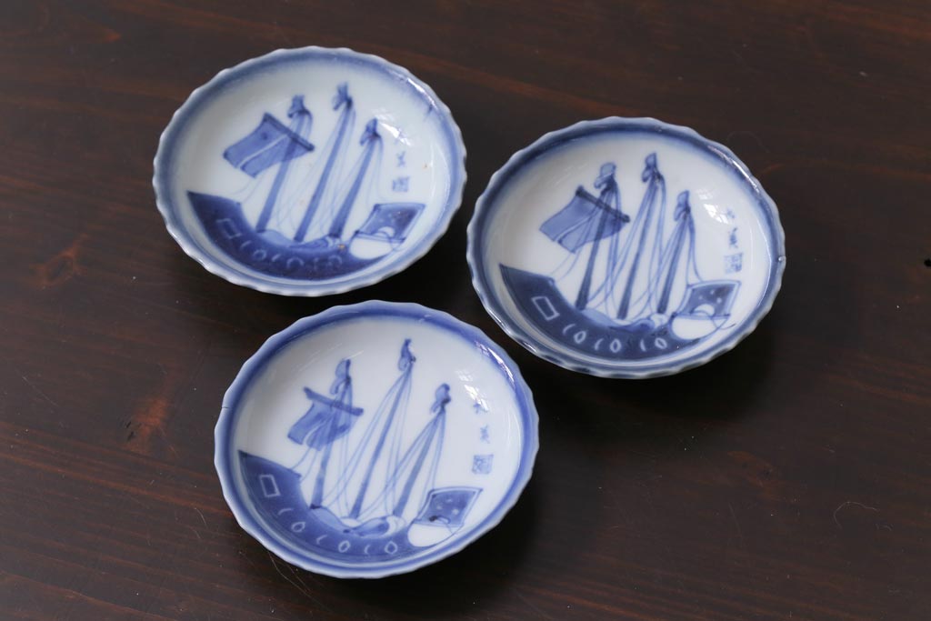 ラフジュ工房> 和食器・茶道具> 皿 > 骨董 江戸期 古伊万里 船の図 染付 3.3寸小皿3枚セット(和食器)