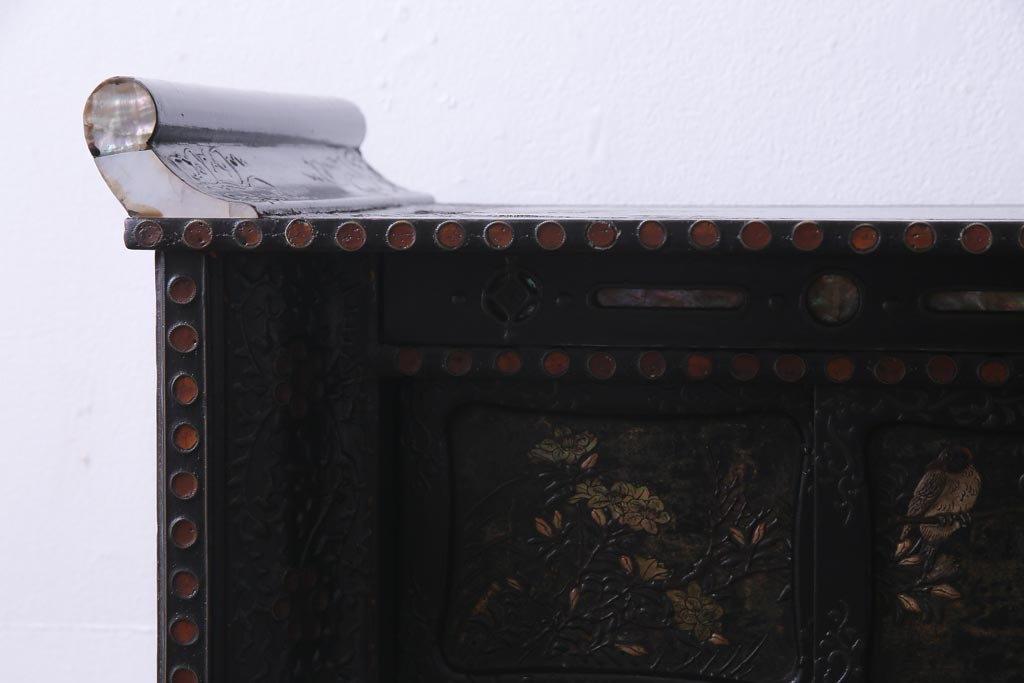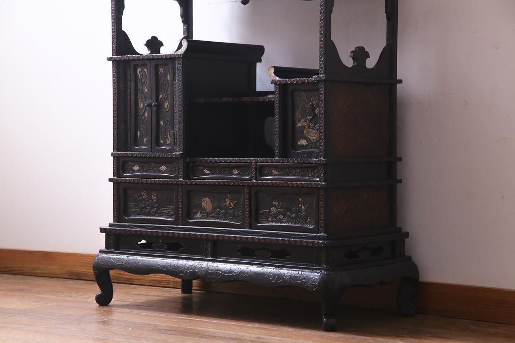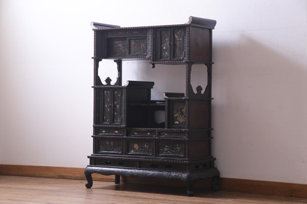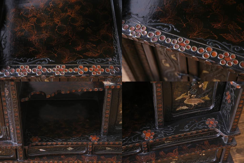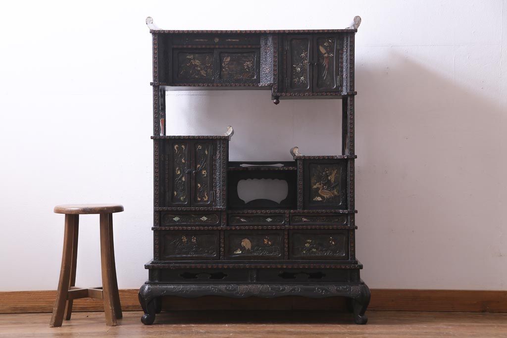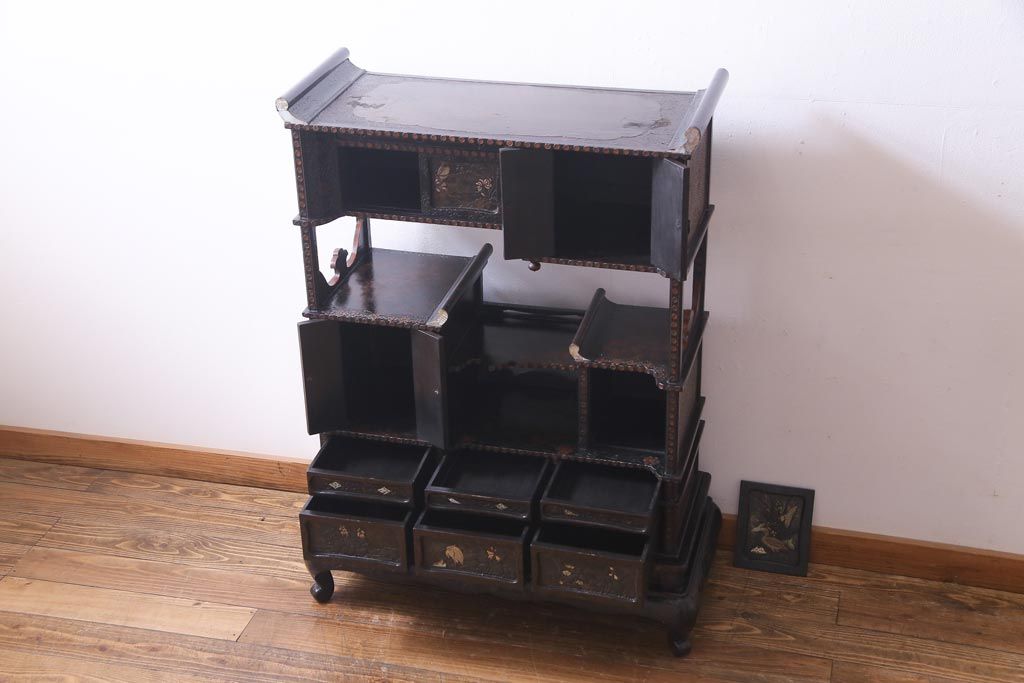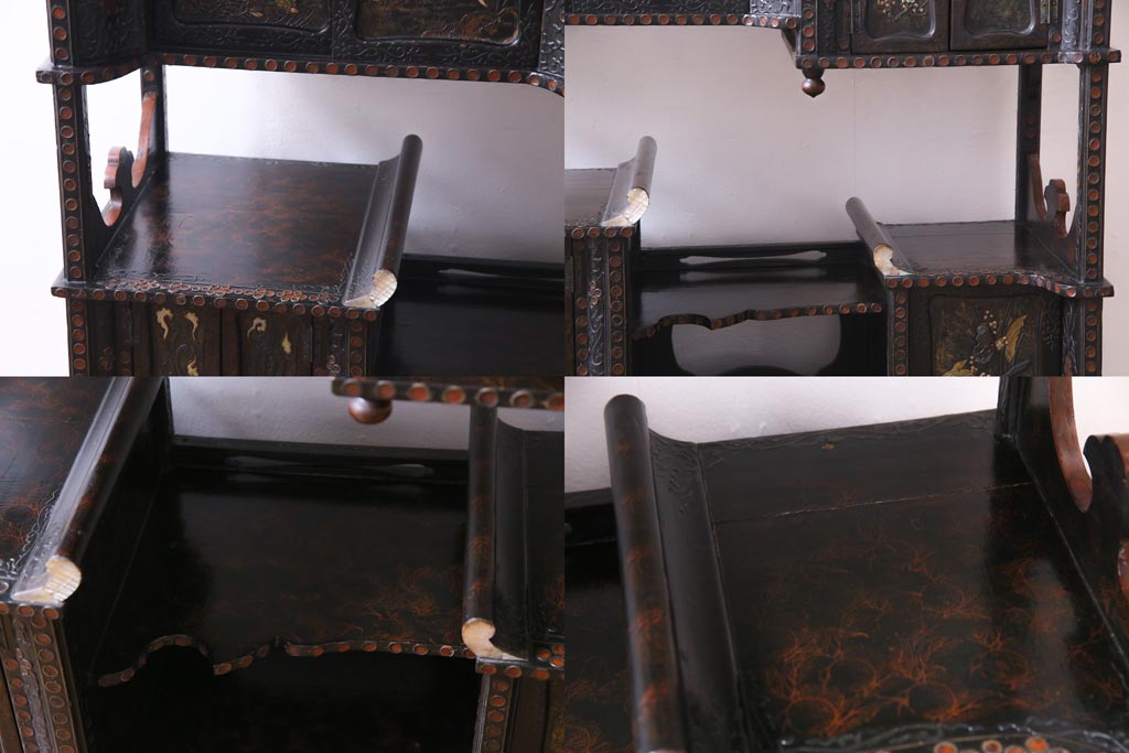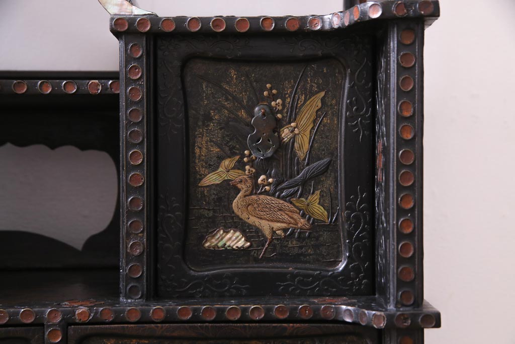 アンティーク家具 和製アンティーク 漆塗り 布目塗り 螺鈿・象嵌細工 花鳥図の茶棚(飾棚)