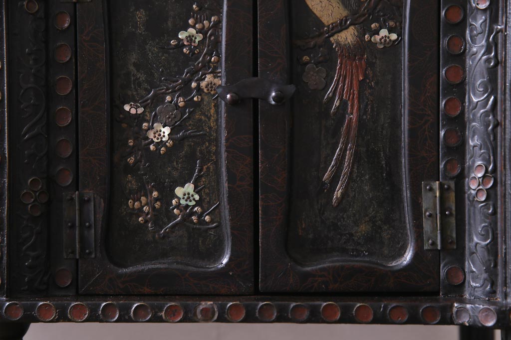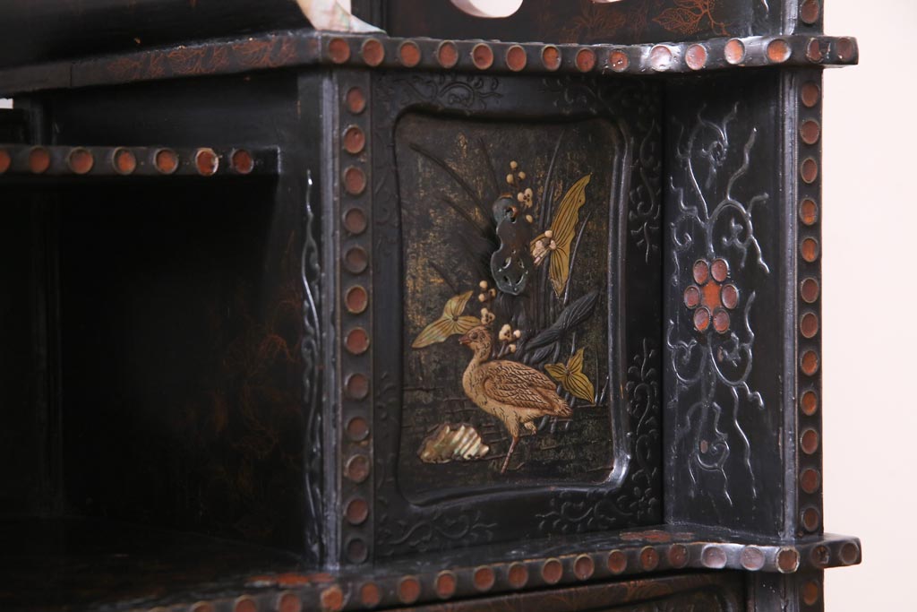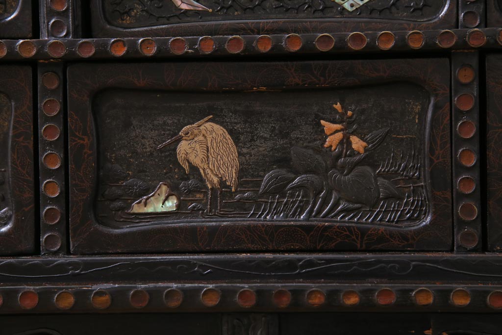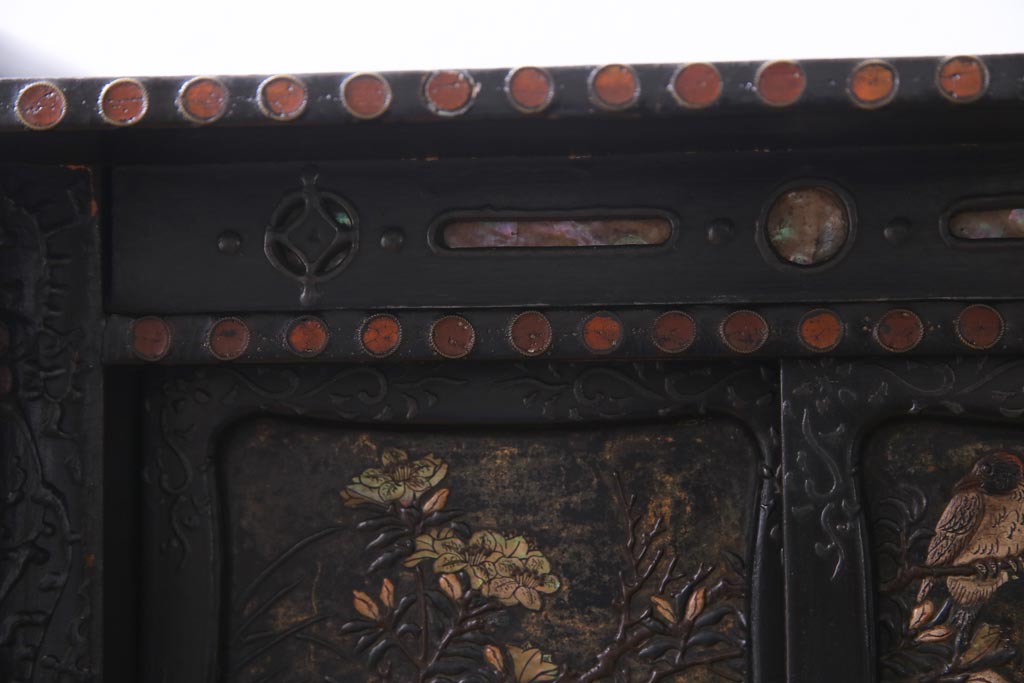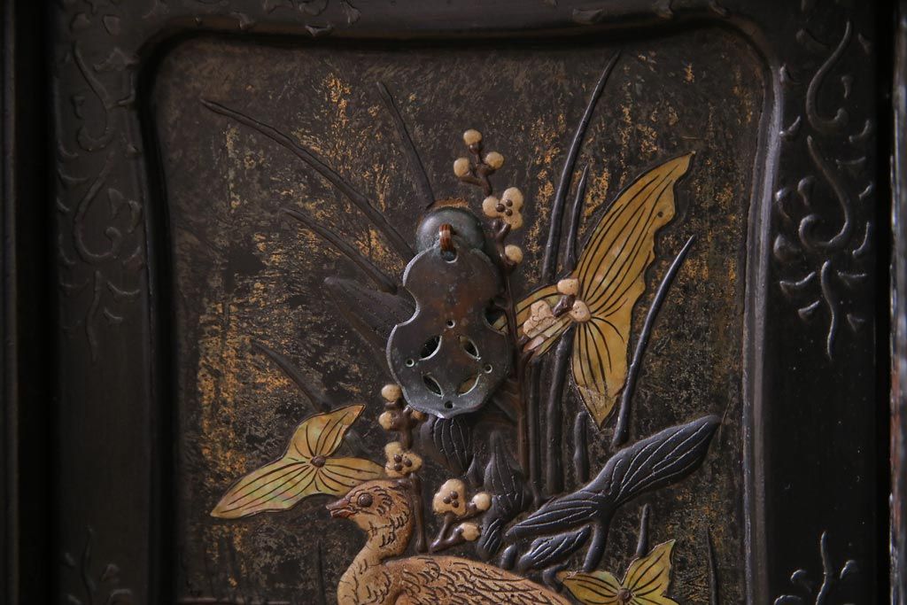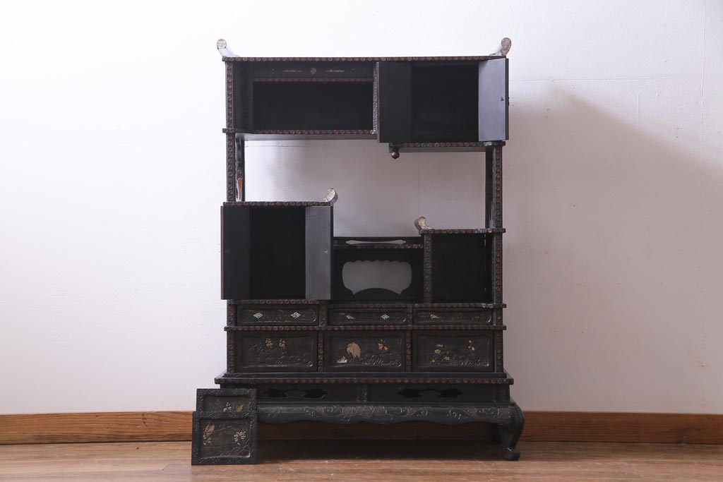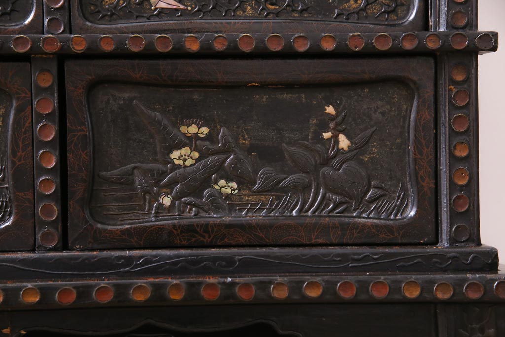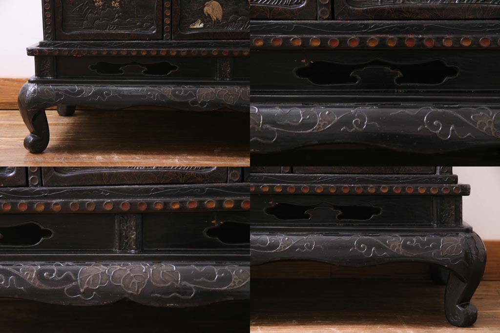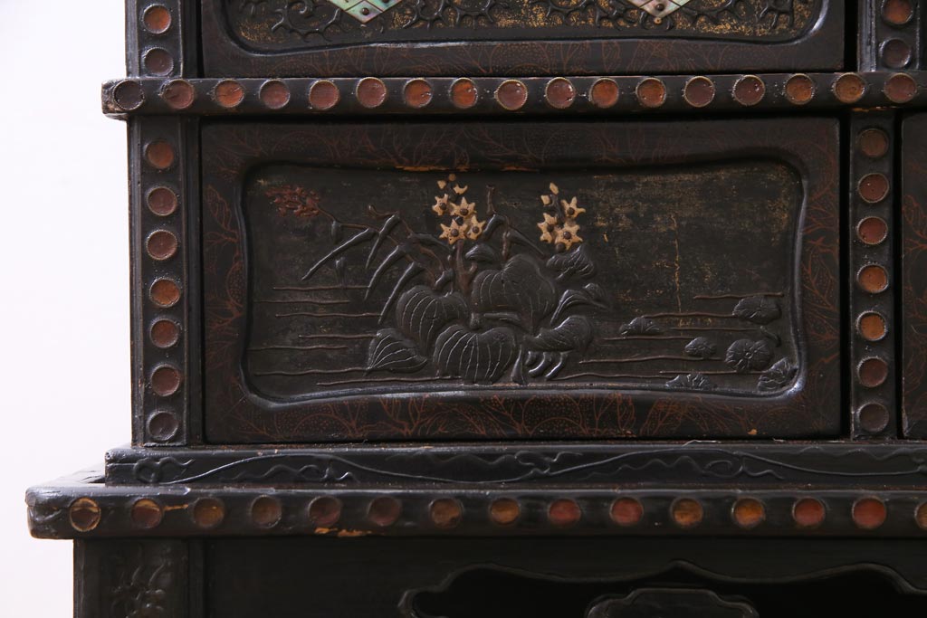 アンティーク家具 和製アンティーク 漆塗り 布目塗り 螺鈿・象嵌細工 花鳥図の茶棚(飾棚)