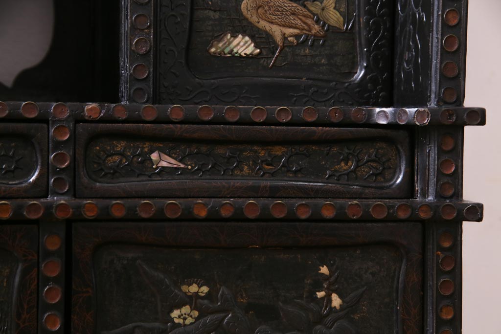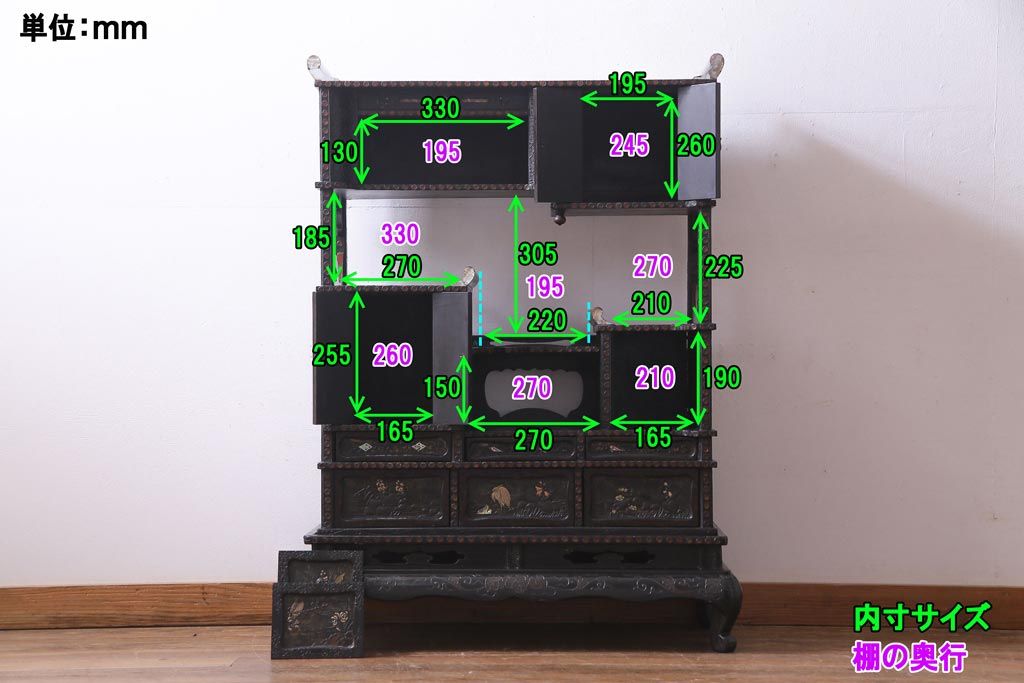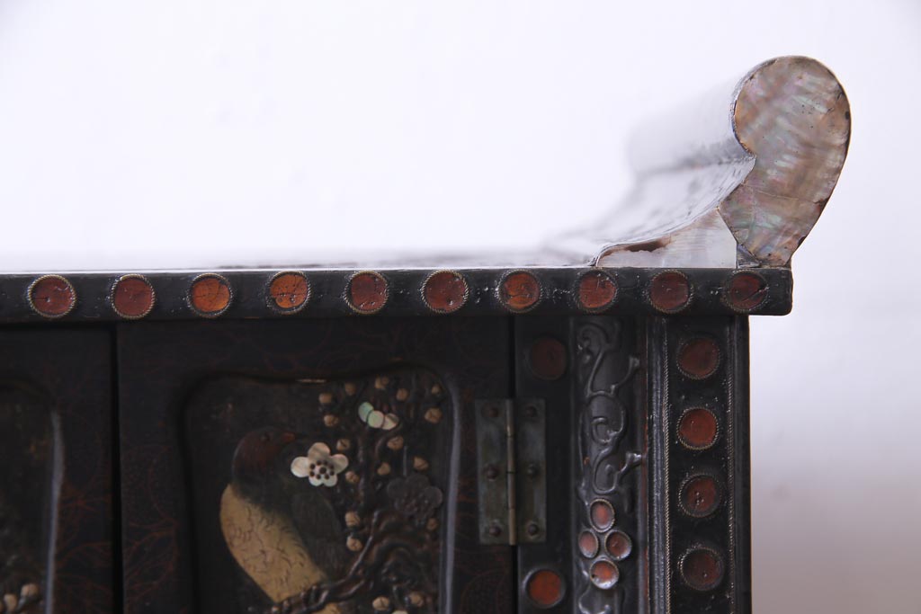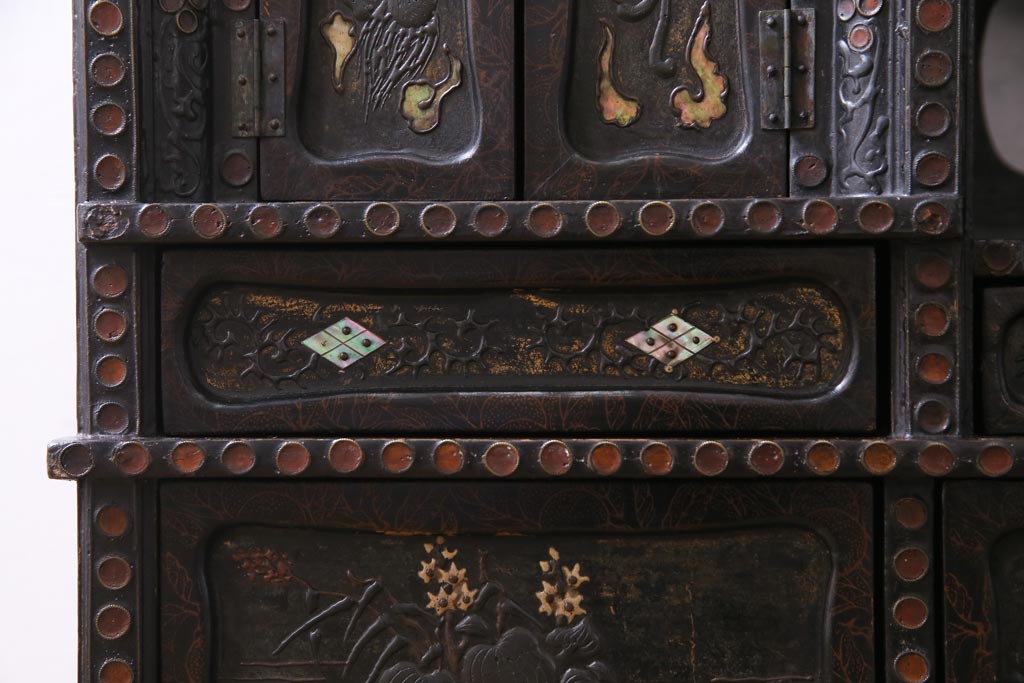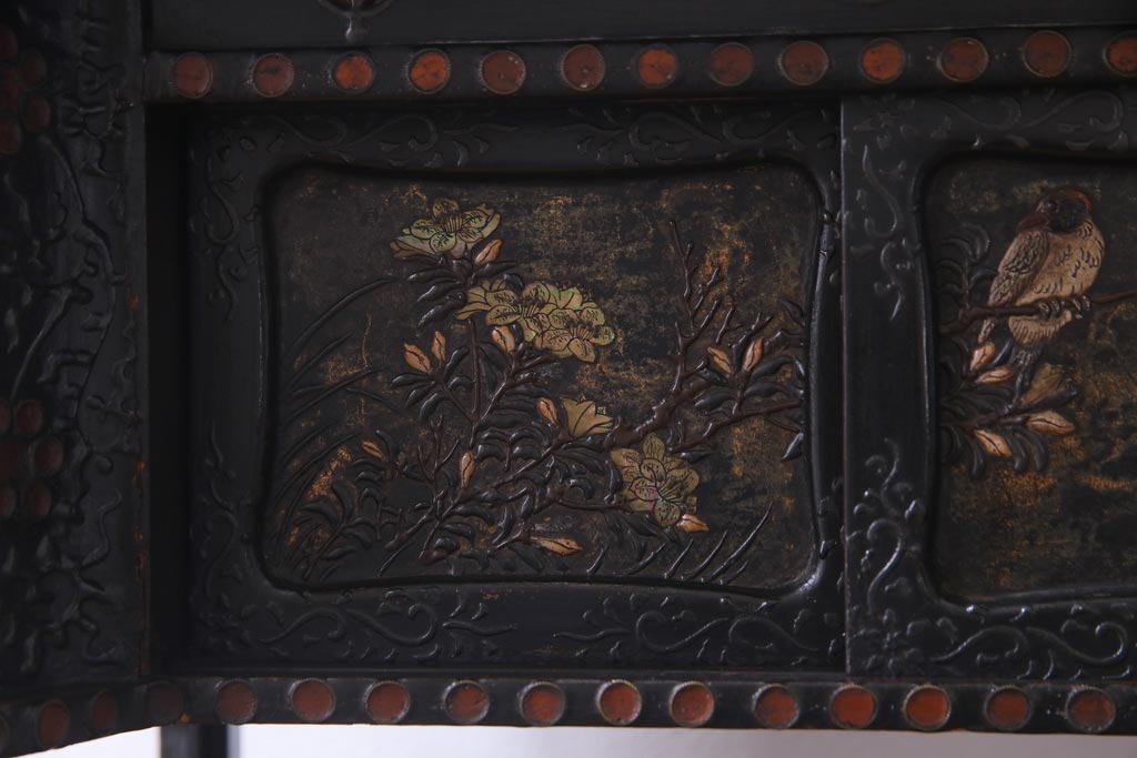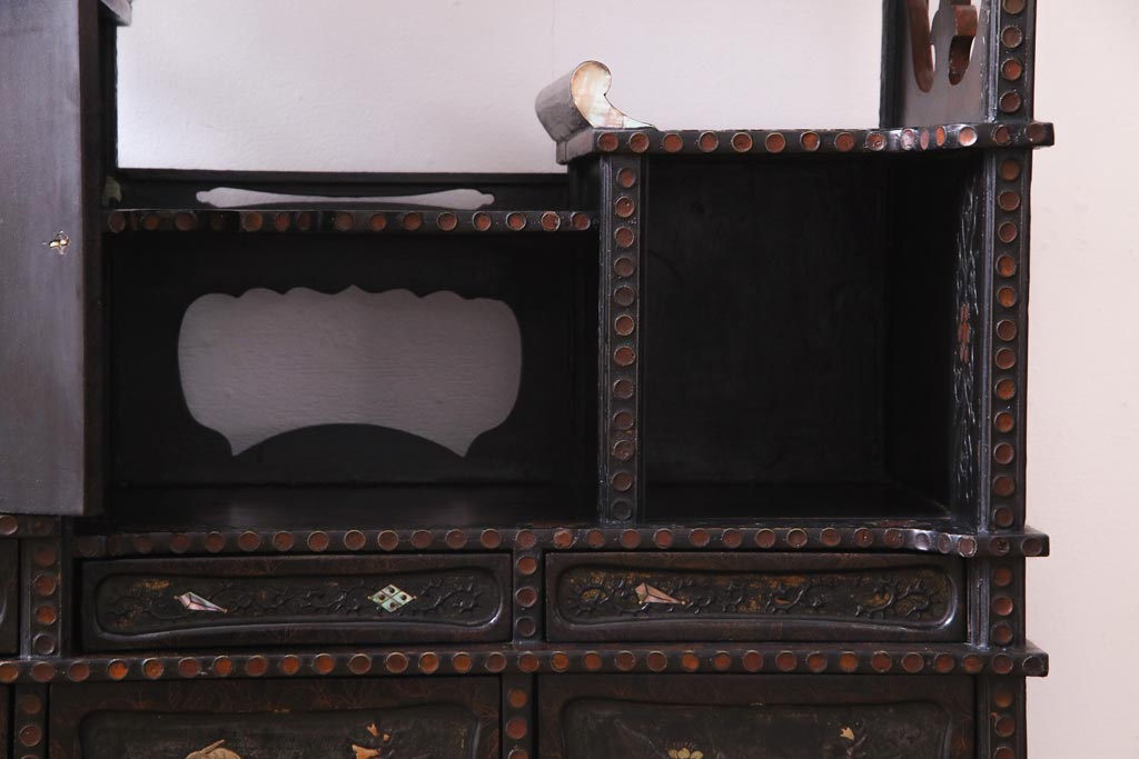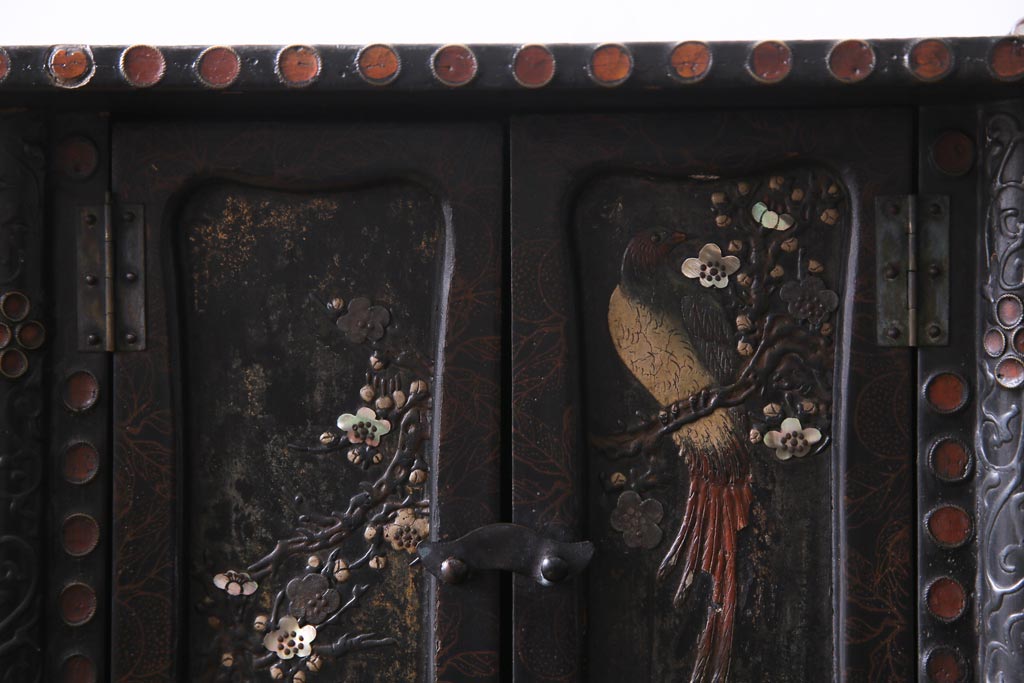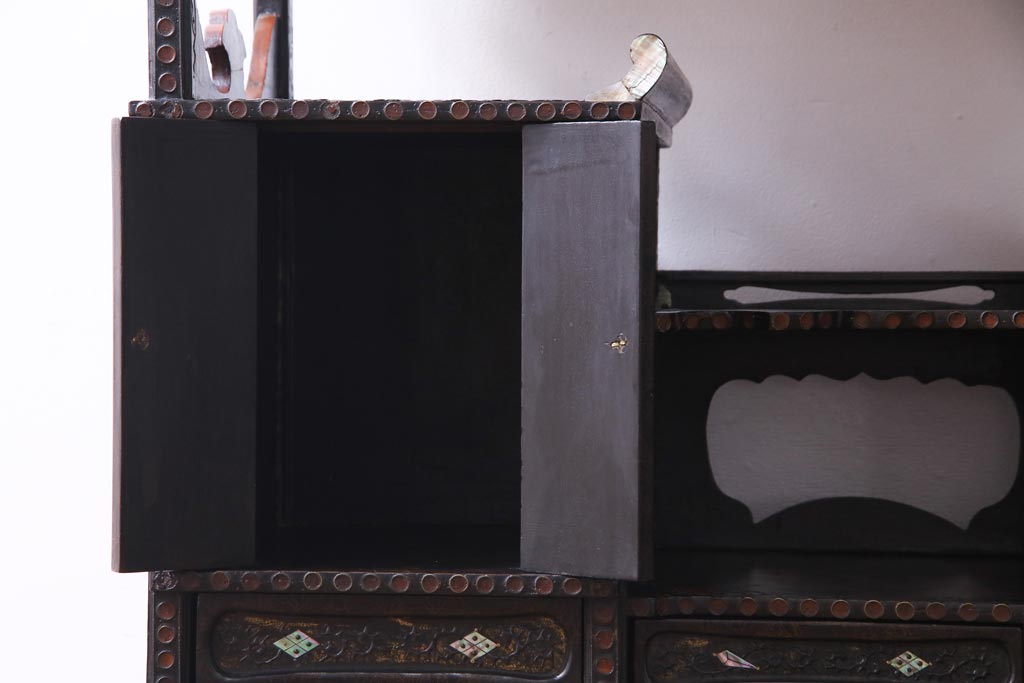 アンティーク家具 和製アンティーク 漆塗り 布目塗り 螺鈿・象嵌細工 花鳥図の茶棚(飾棚)