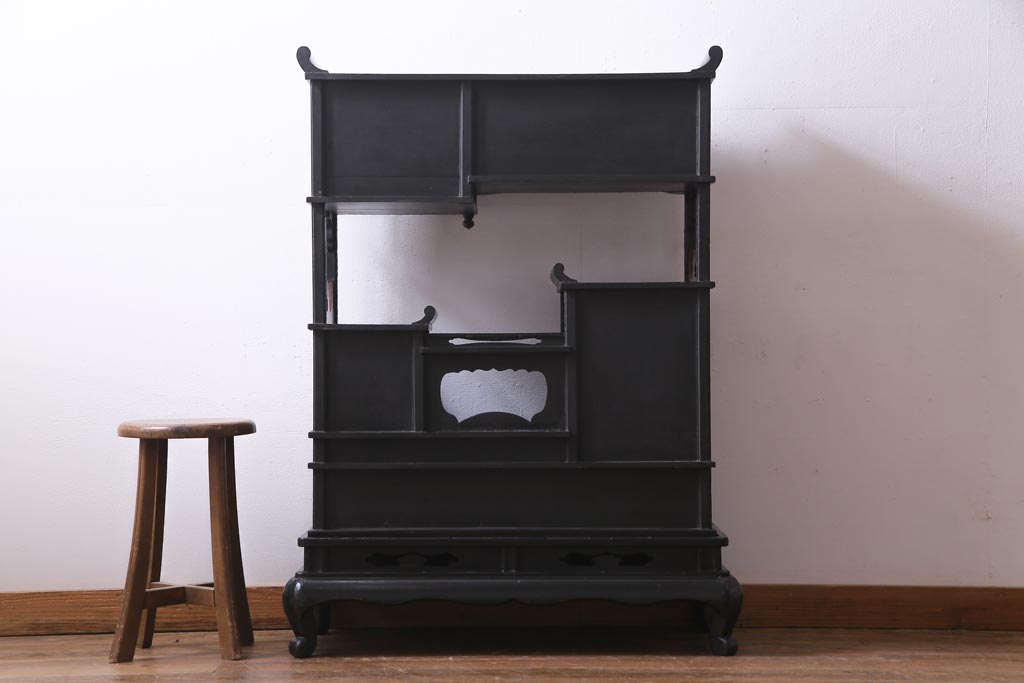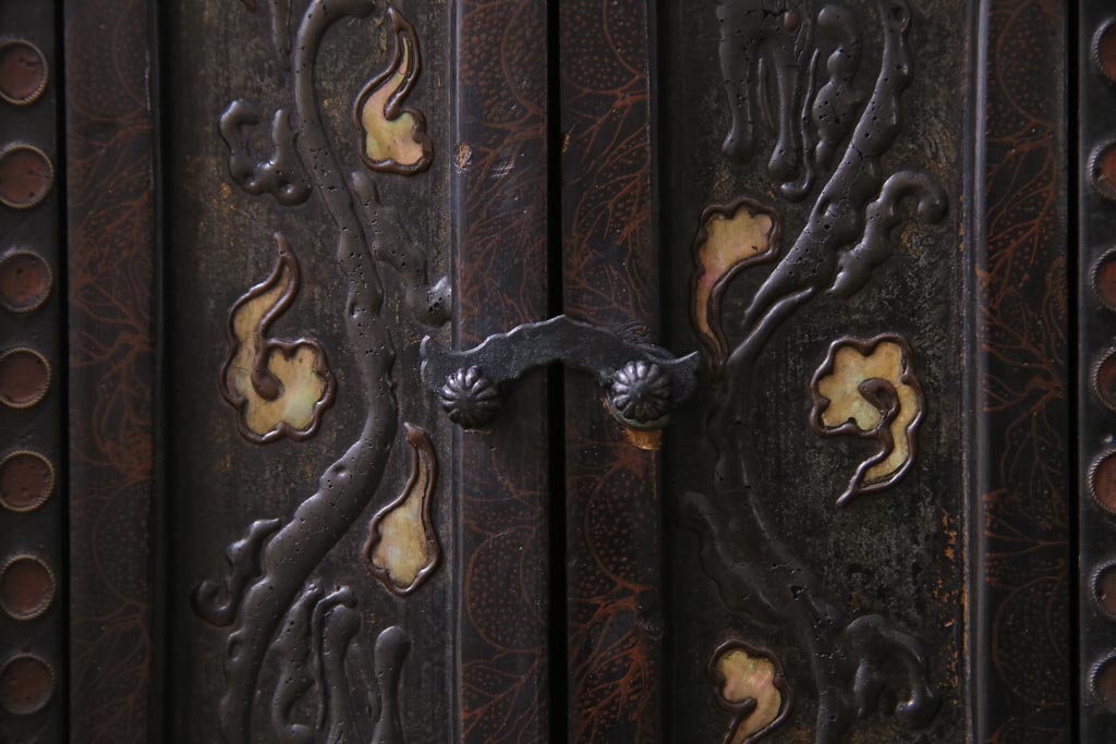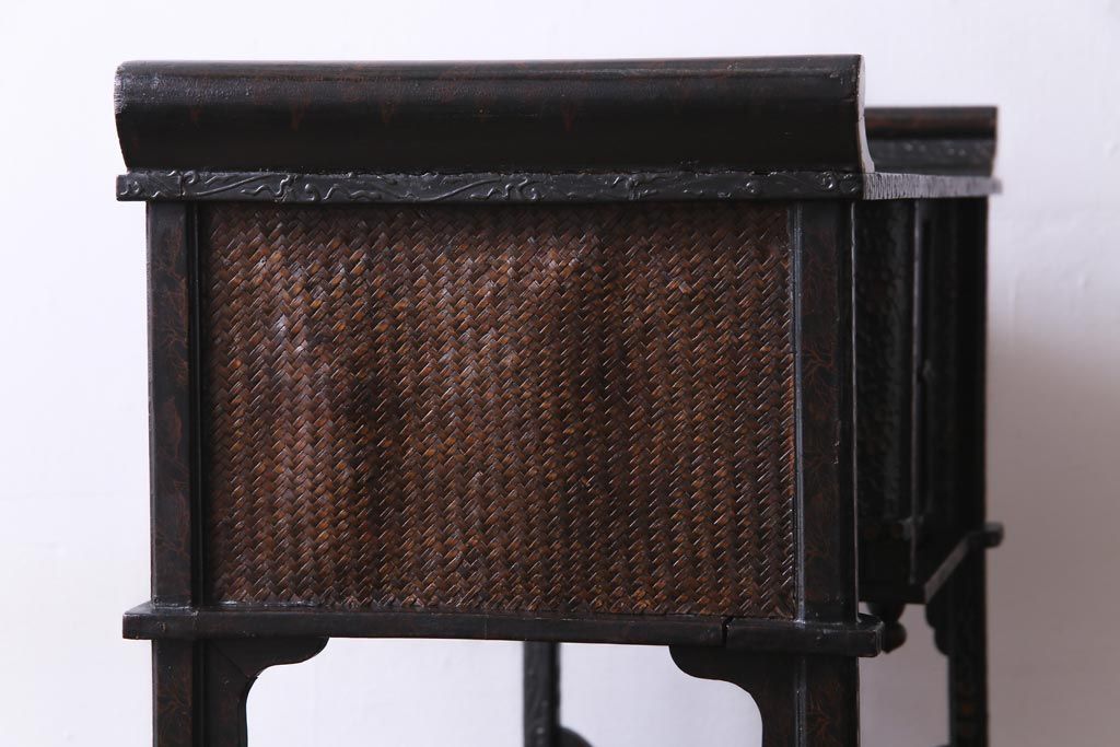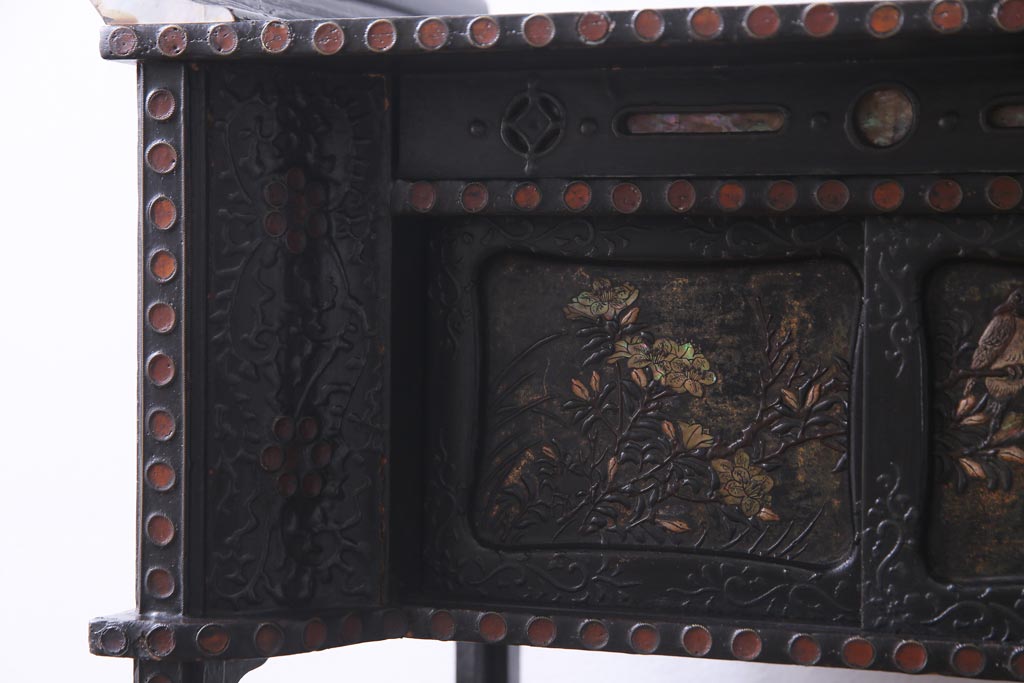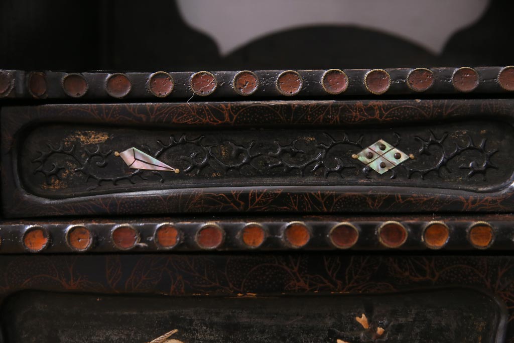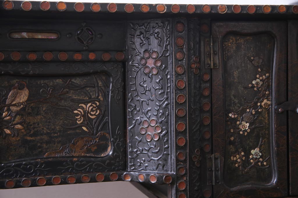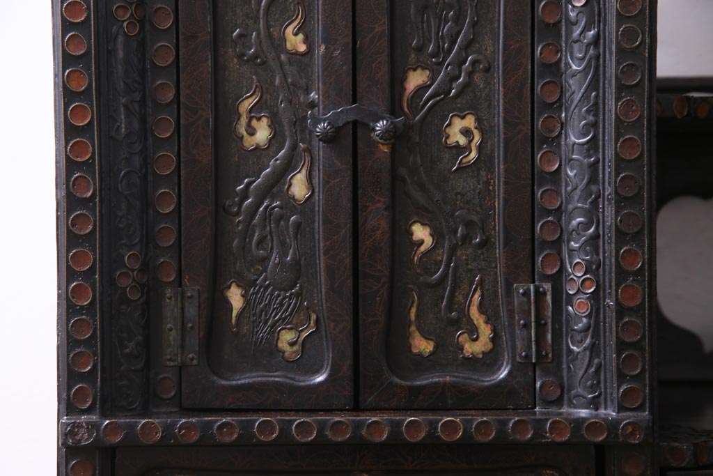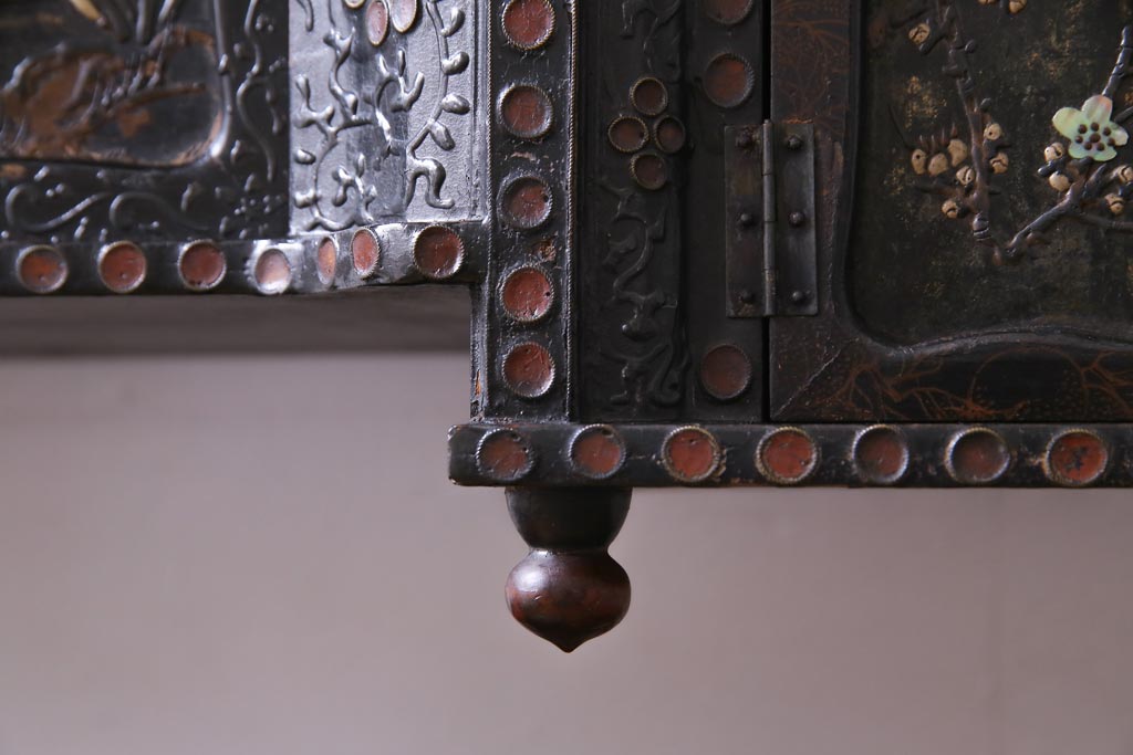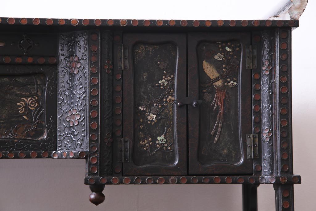 アンティーク家具 和製アンティーク 漆塗り 布目塗り 螺鈿・象嵌細工 花鳥図の茶棚(飾棚)